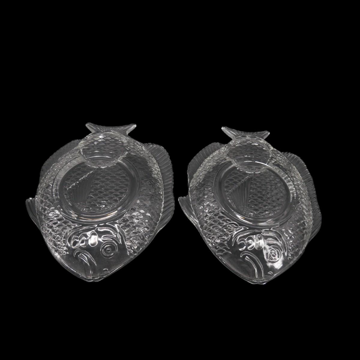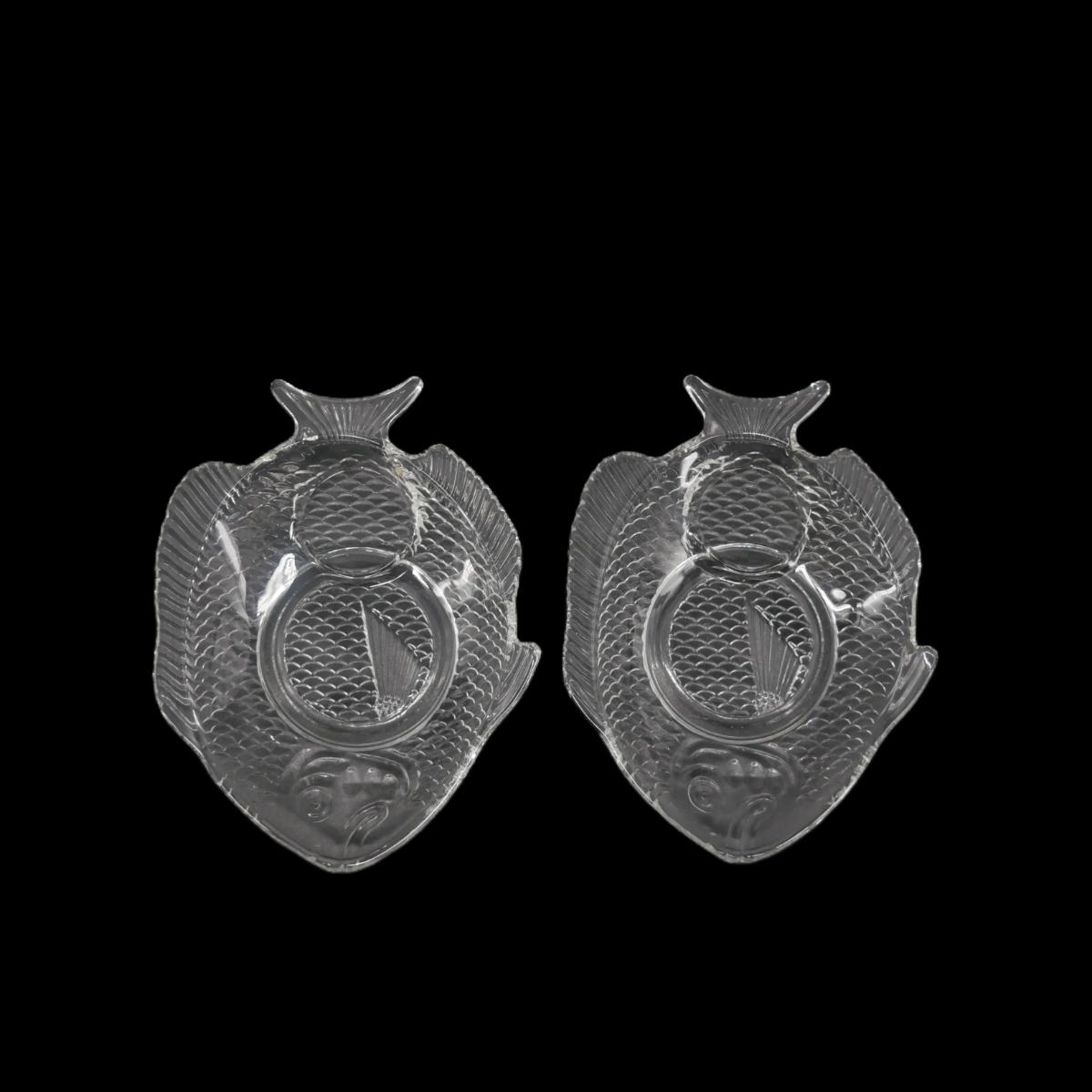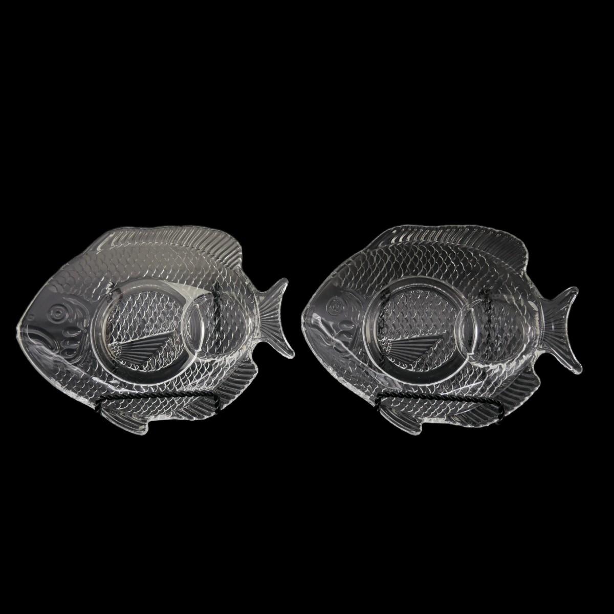 Set of two glass fish plates. Excellent condition, no issues found. Each measures 8" x 6.25". Lot weighs 1 lb 8 oz. (G8)