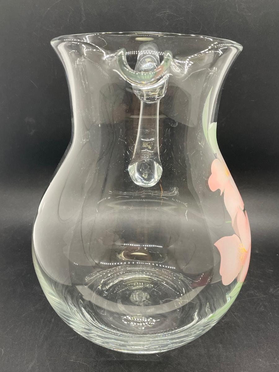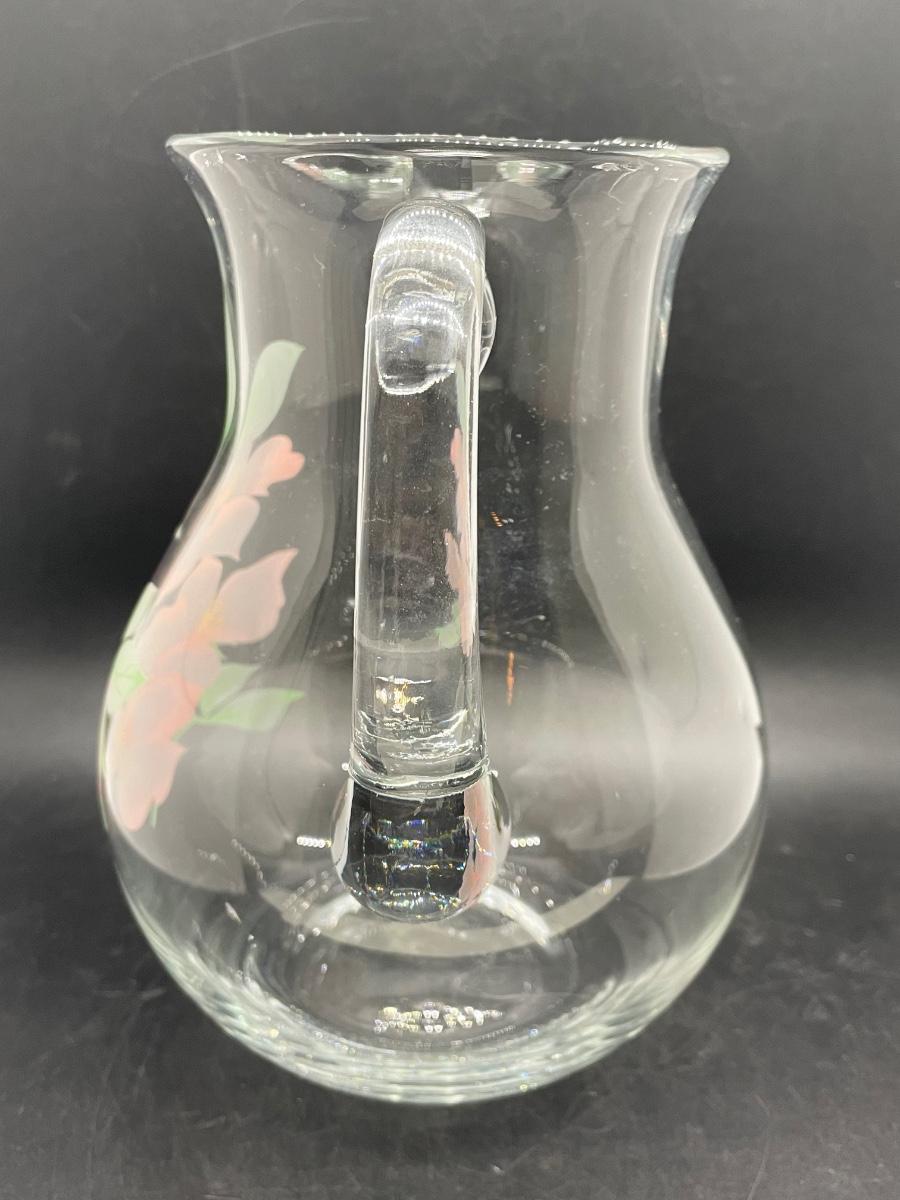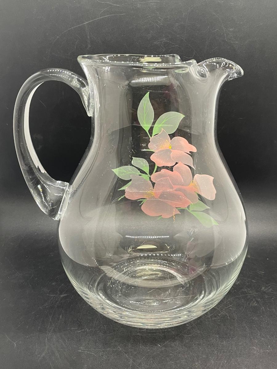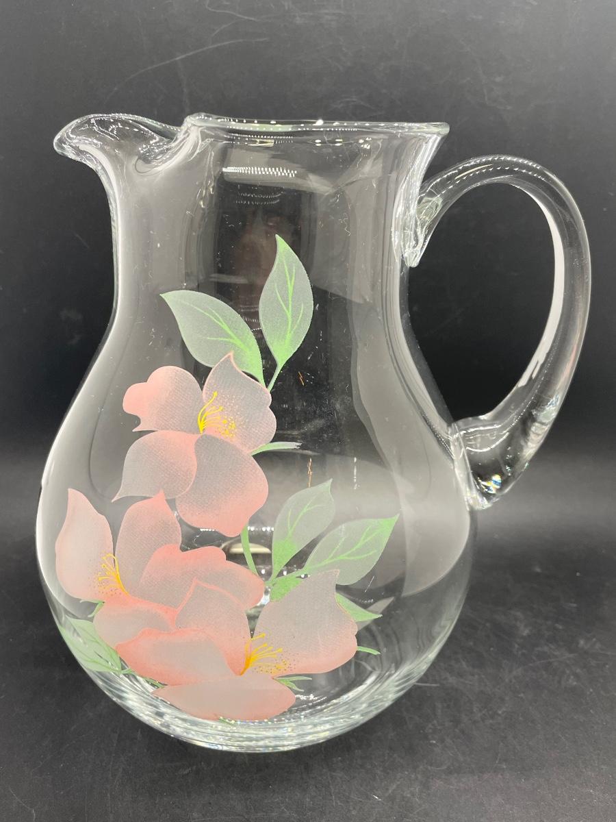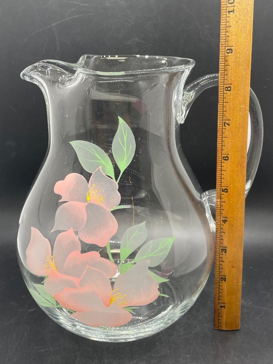 This item is in great condition. There is no noticeable damages to the pitcher. It is approximately 9” tall. There’s a floral design in the front.