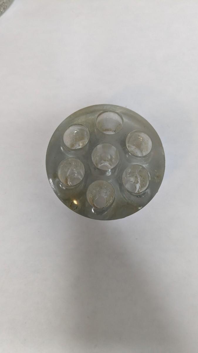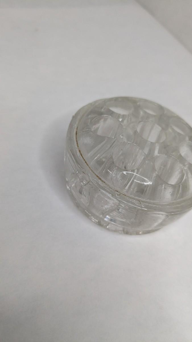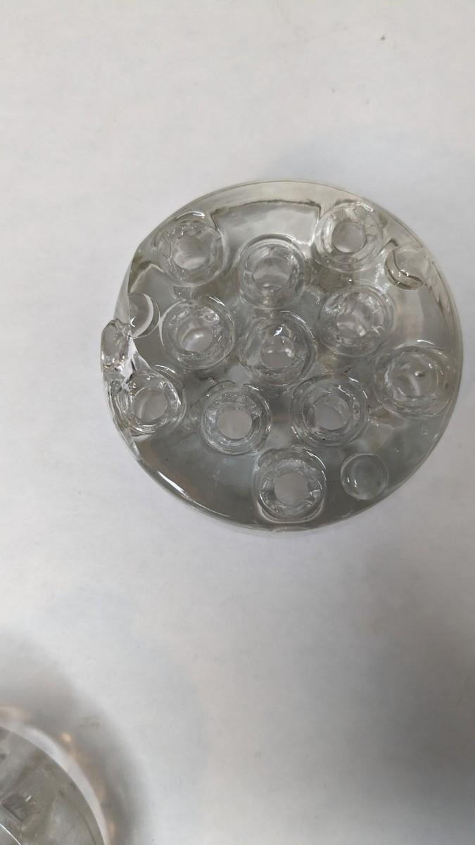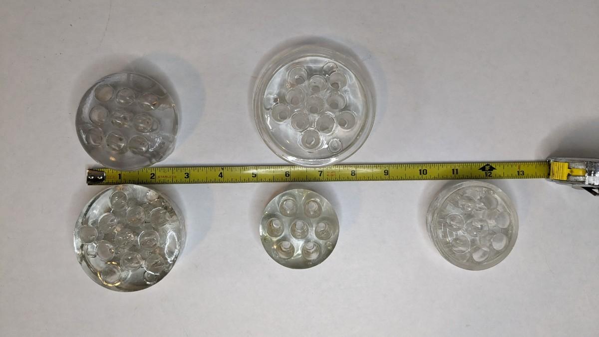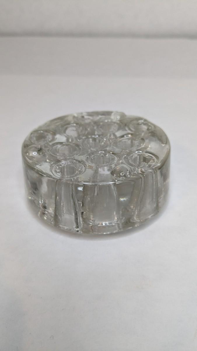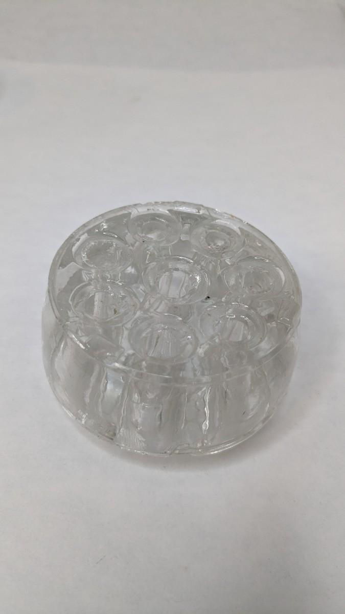 (5) varying size and opening clear glass flower frogs. One piece shows significant chunk taken from corner as noted in photos. All others are in great shape.