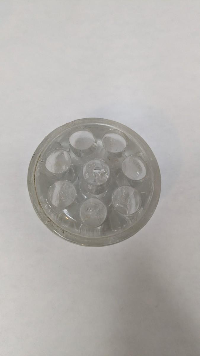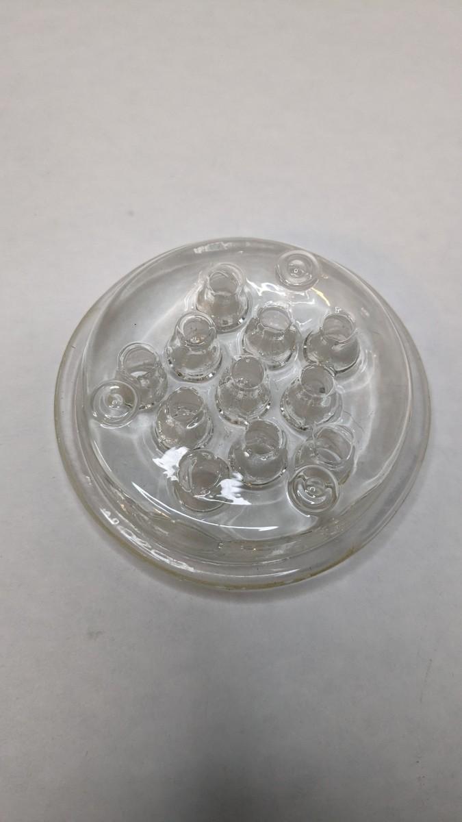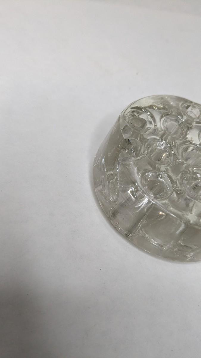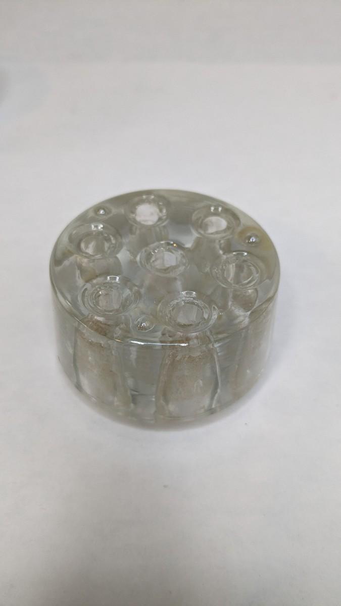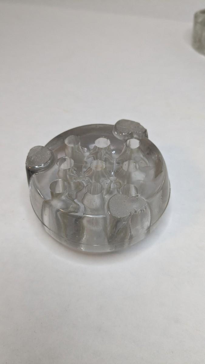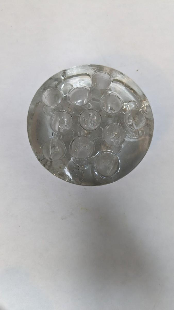 (5) varying size and opening clear glass flower frogs. One piece shows significant chunk taken from corner as noted in photos. All others are in great shape.