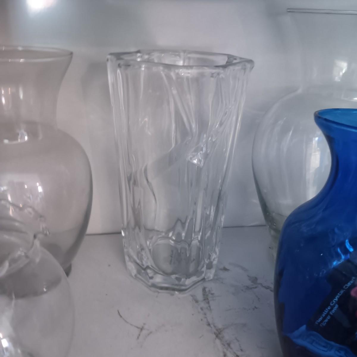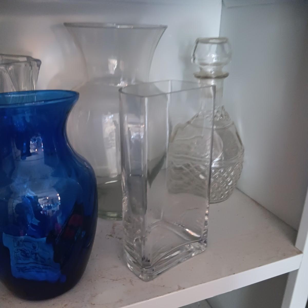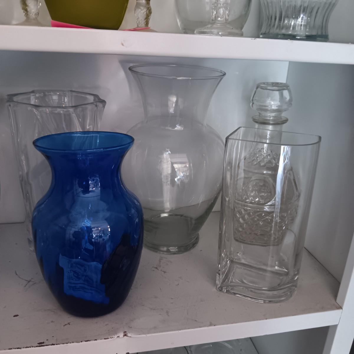GLASS FLOWER VASES AND A DECANTER
