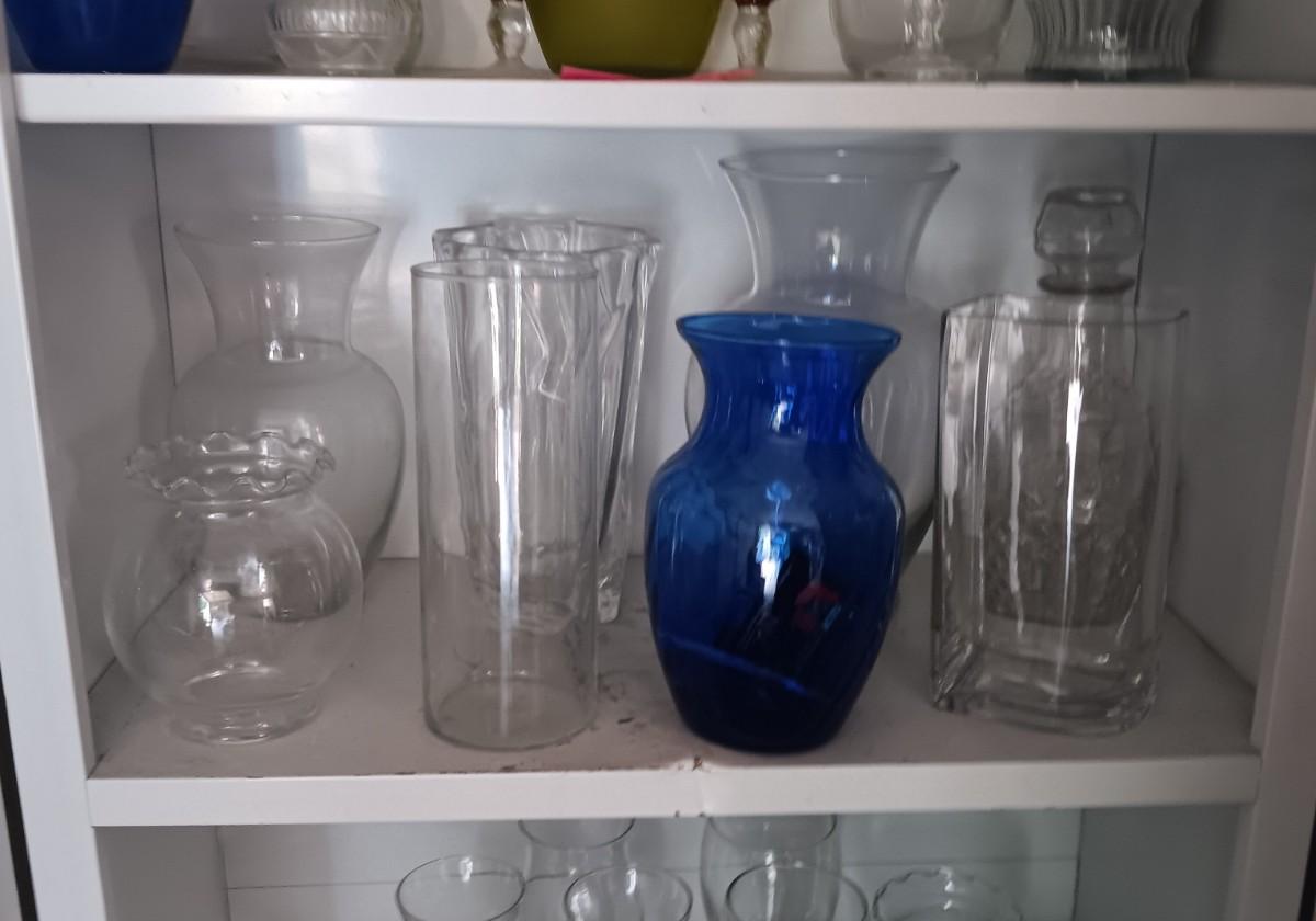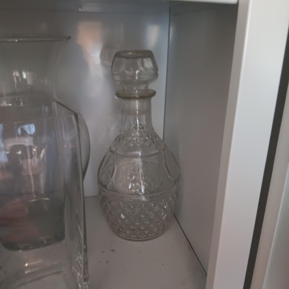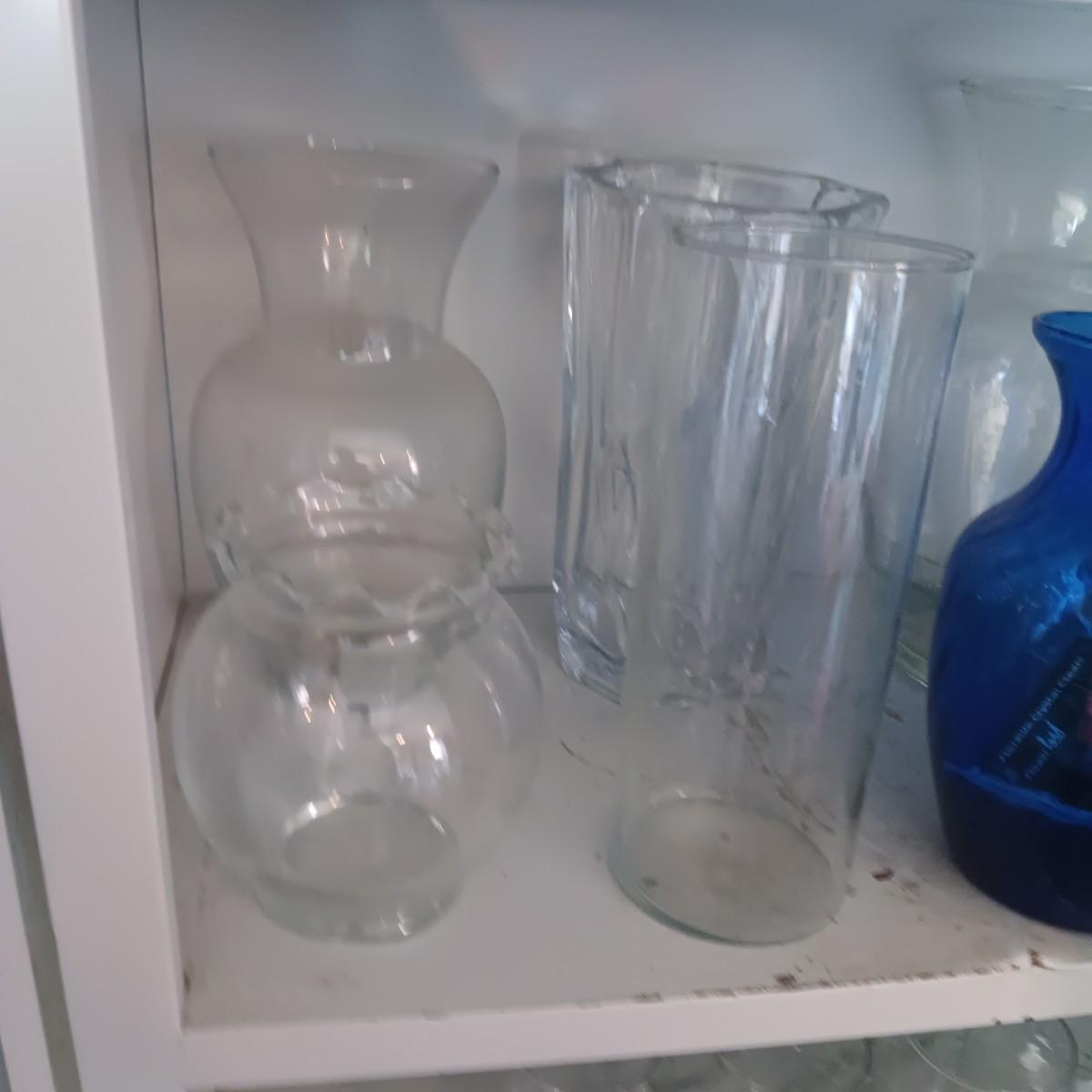 GLASS FLOWER VASES AND A DECANTER