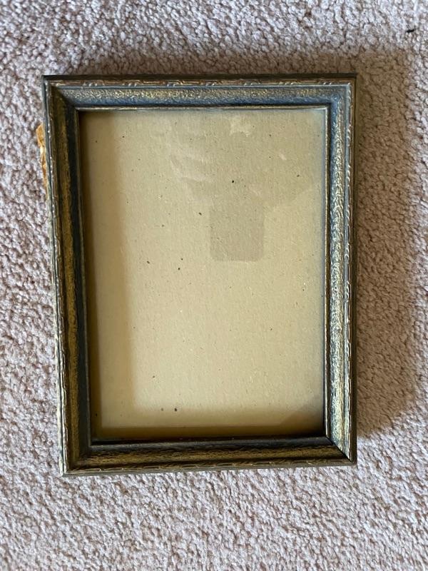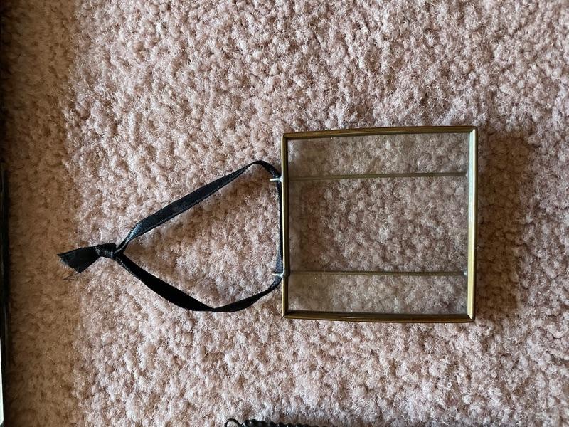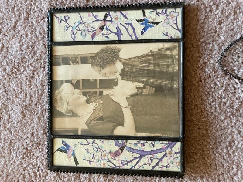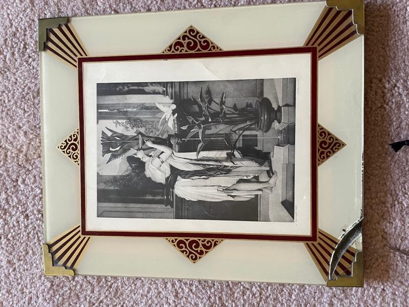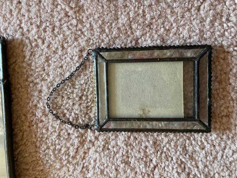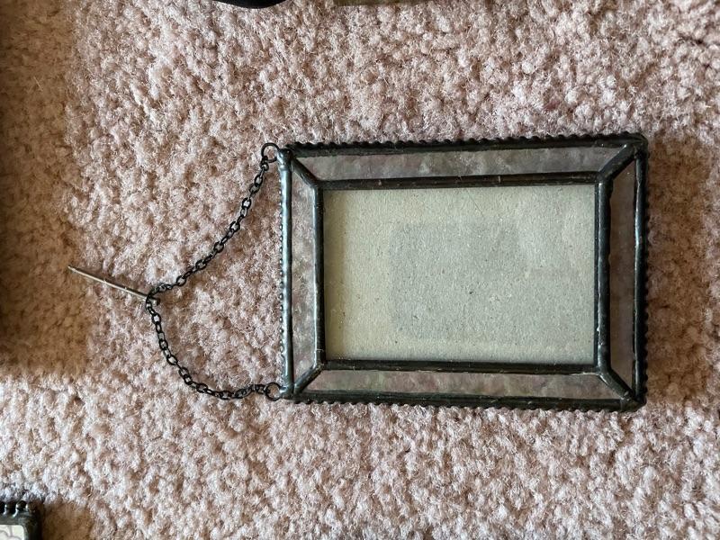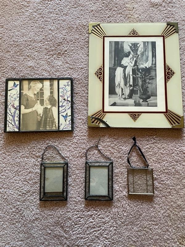 5 glass frames, 3 small hanging ones, one art deco with art, one blue with birds