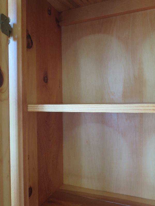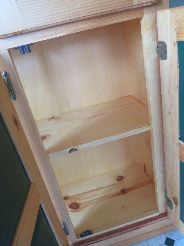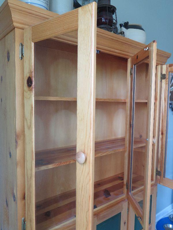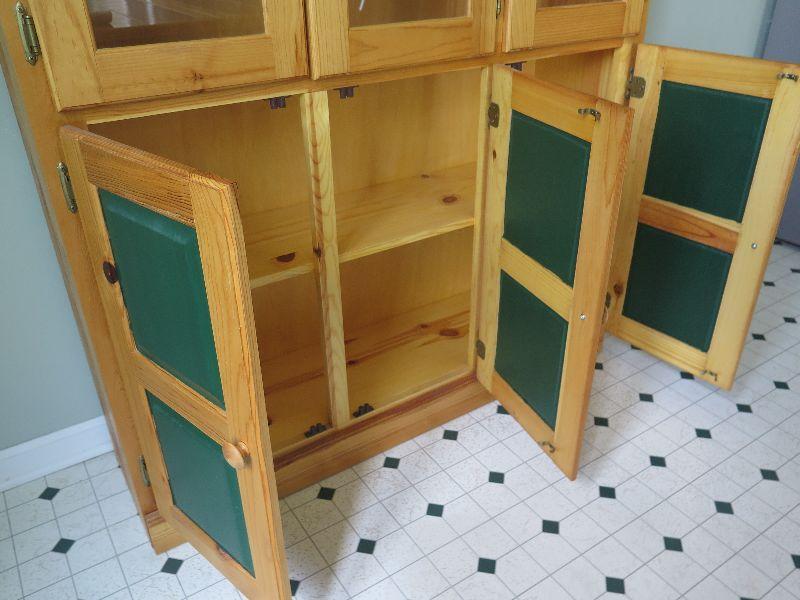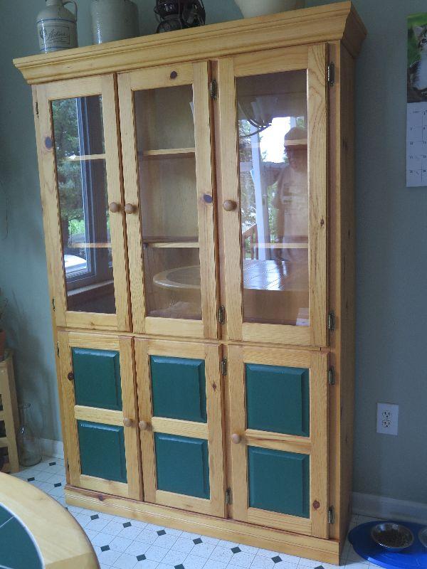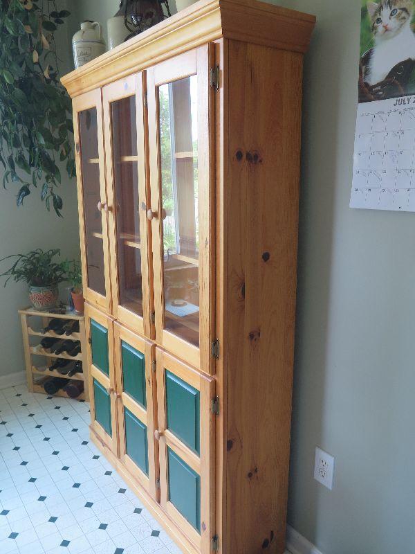 Solid wood glass front cabinet with two shelves. The three doors all open. The bottom has more storage. Natural wood with green painted centers on cabinet doors. This is screwed into wall, bring tools. Heavy, bring help to move. 45x12x70. **Please read Terms and Conditions before placing a bid. Pick up is Wednesday July 31st, from 2 pm to 7pm in Sicklerville. All sales are final. All sales are as is, where is. Please review all photos. Any props included in photos are not included in listing. All measurements are approximate.