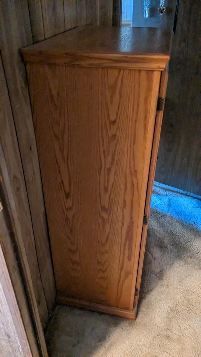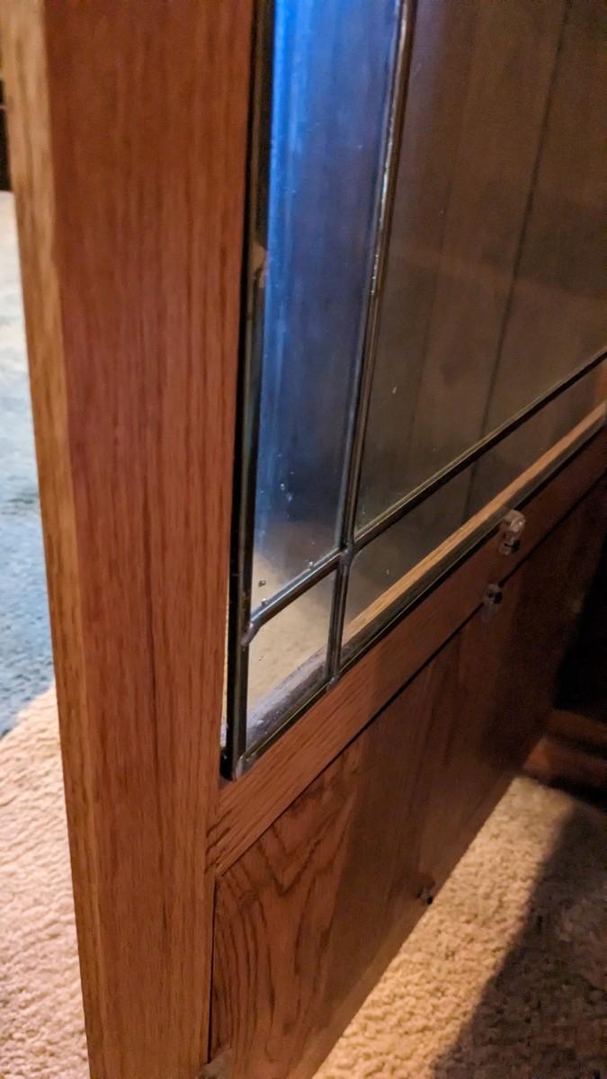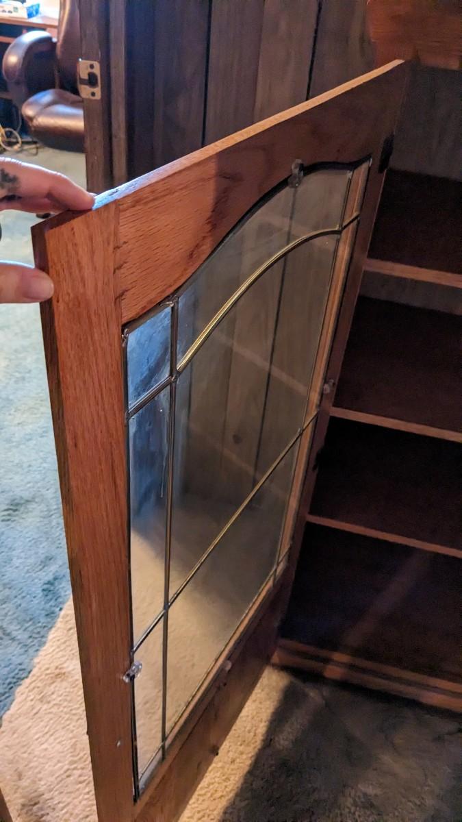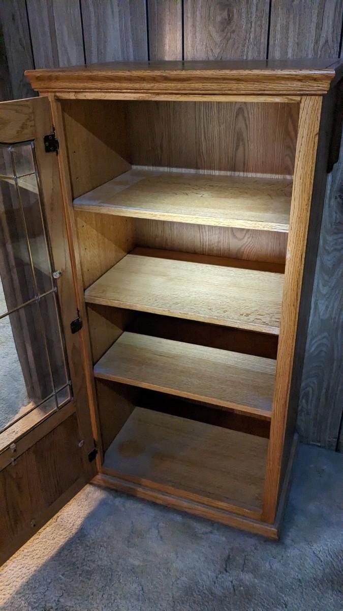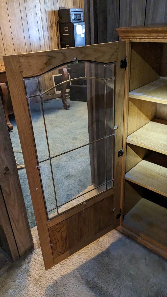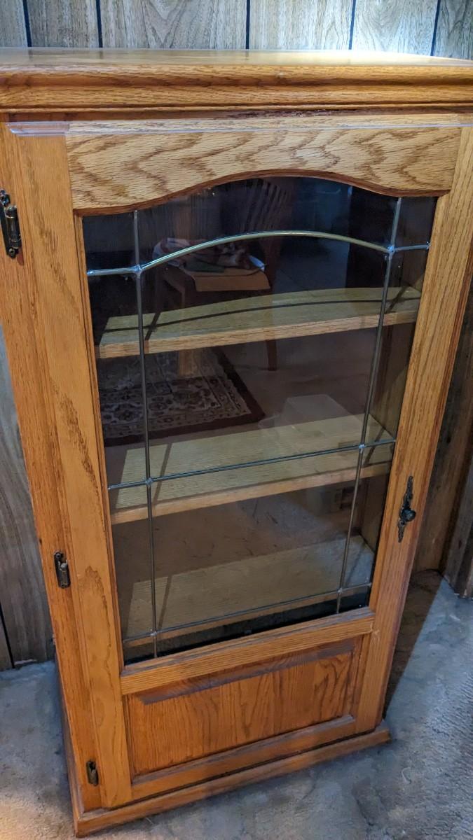 16 5/8"x25.25"x 49". Another beautiful hutch/curio for all of your treasures. This solid wood piece features a lead glass style front that does have a slight bend in one corner, note in photos. In overall great condition with A LOT of space for storage.