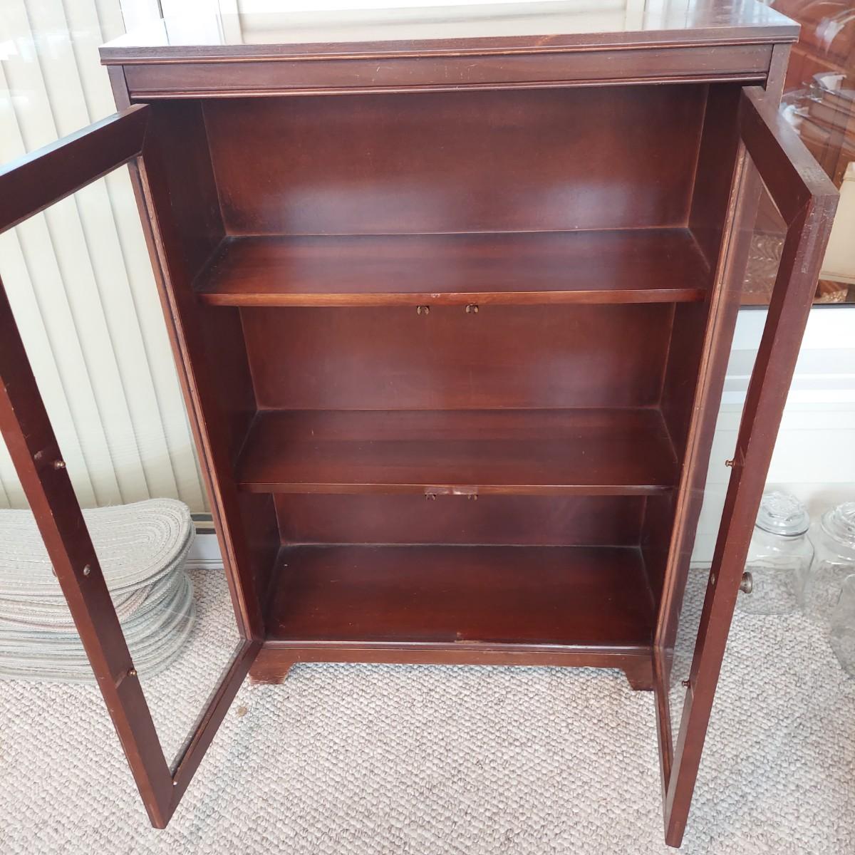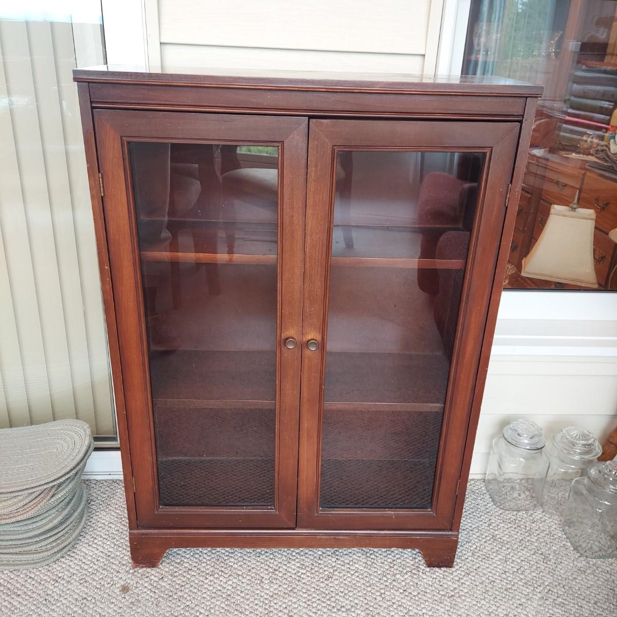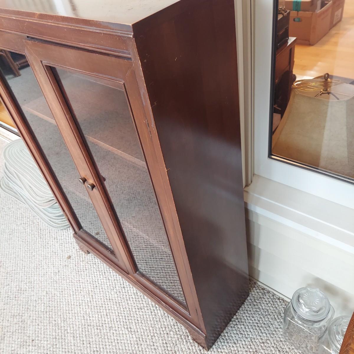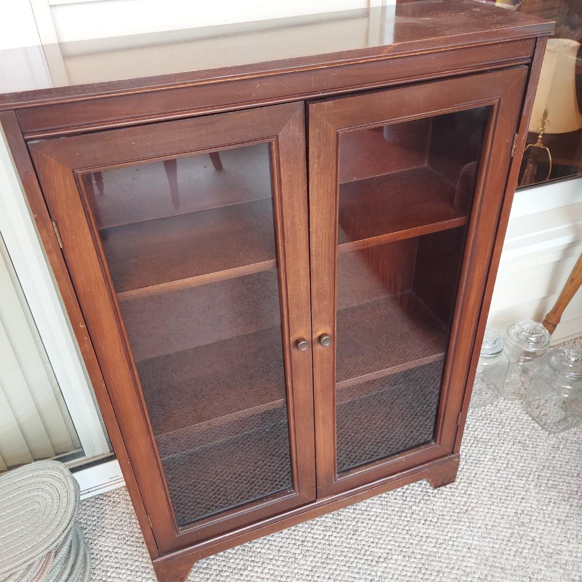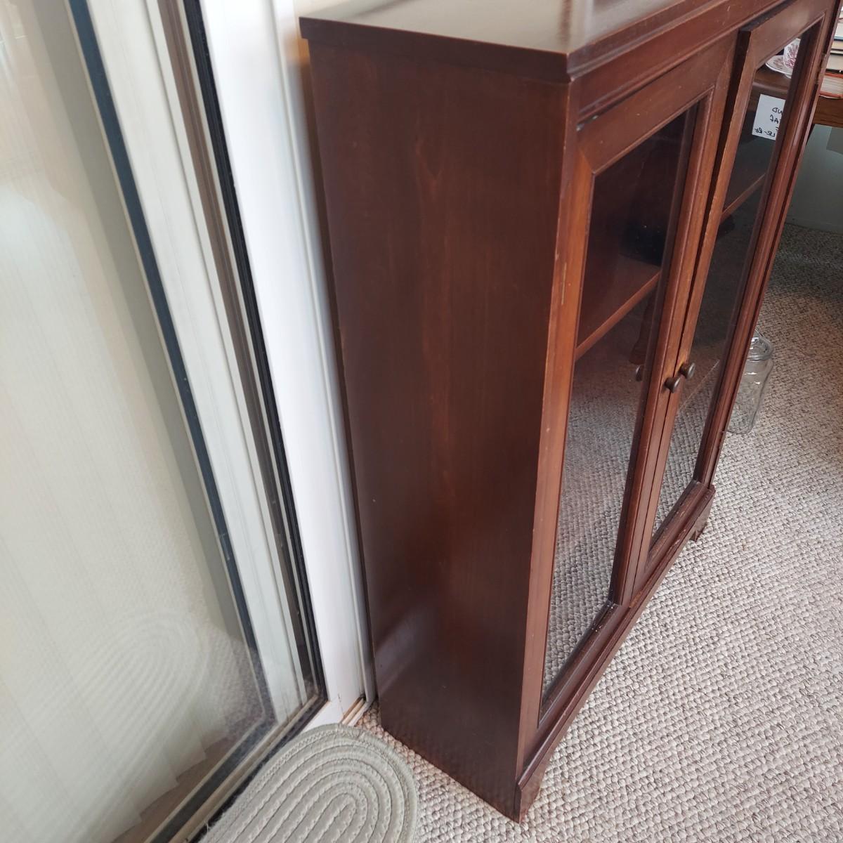 Small wooden cabinet with glass front doors. Measures 30” x 10” x 42"H. Doors do not line up flush when closed. Please see photos for details.