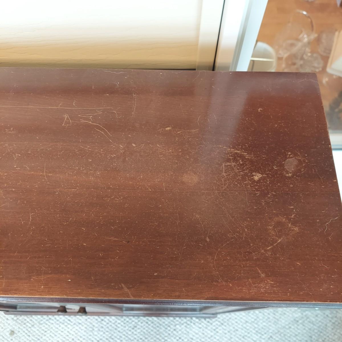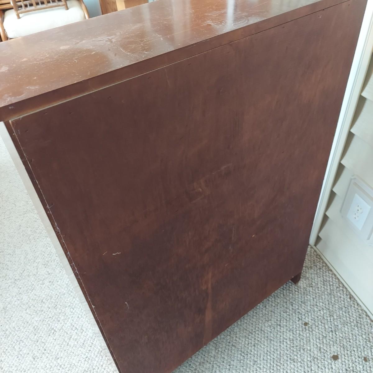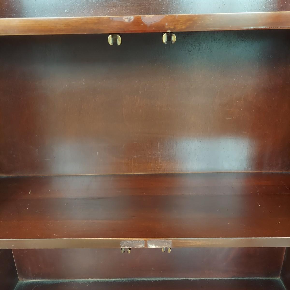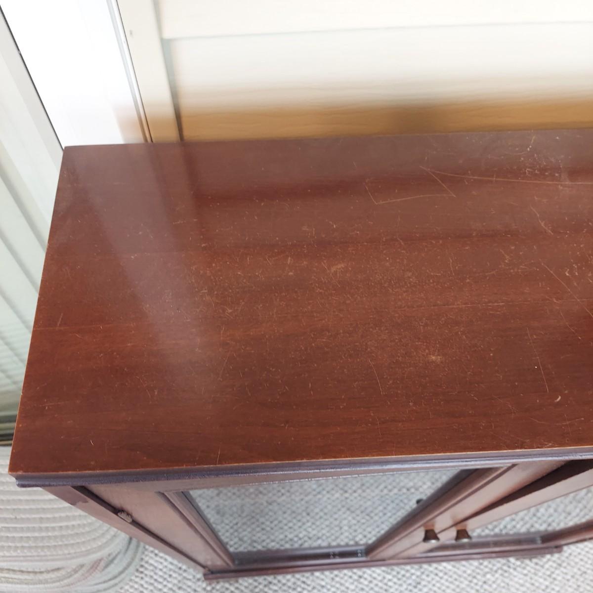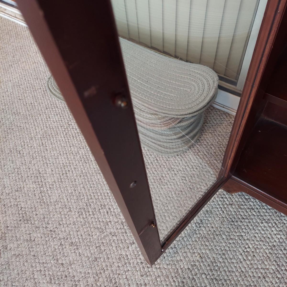Small wooden cabinet with glass front doors. Measures 30” x 10” x 42"H. Doors do not line up flush when closed. Please see photos for details.