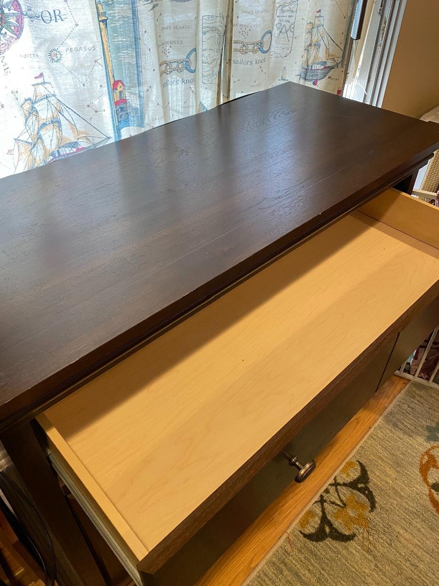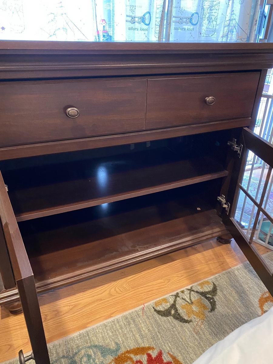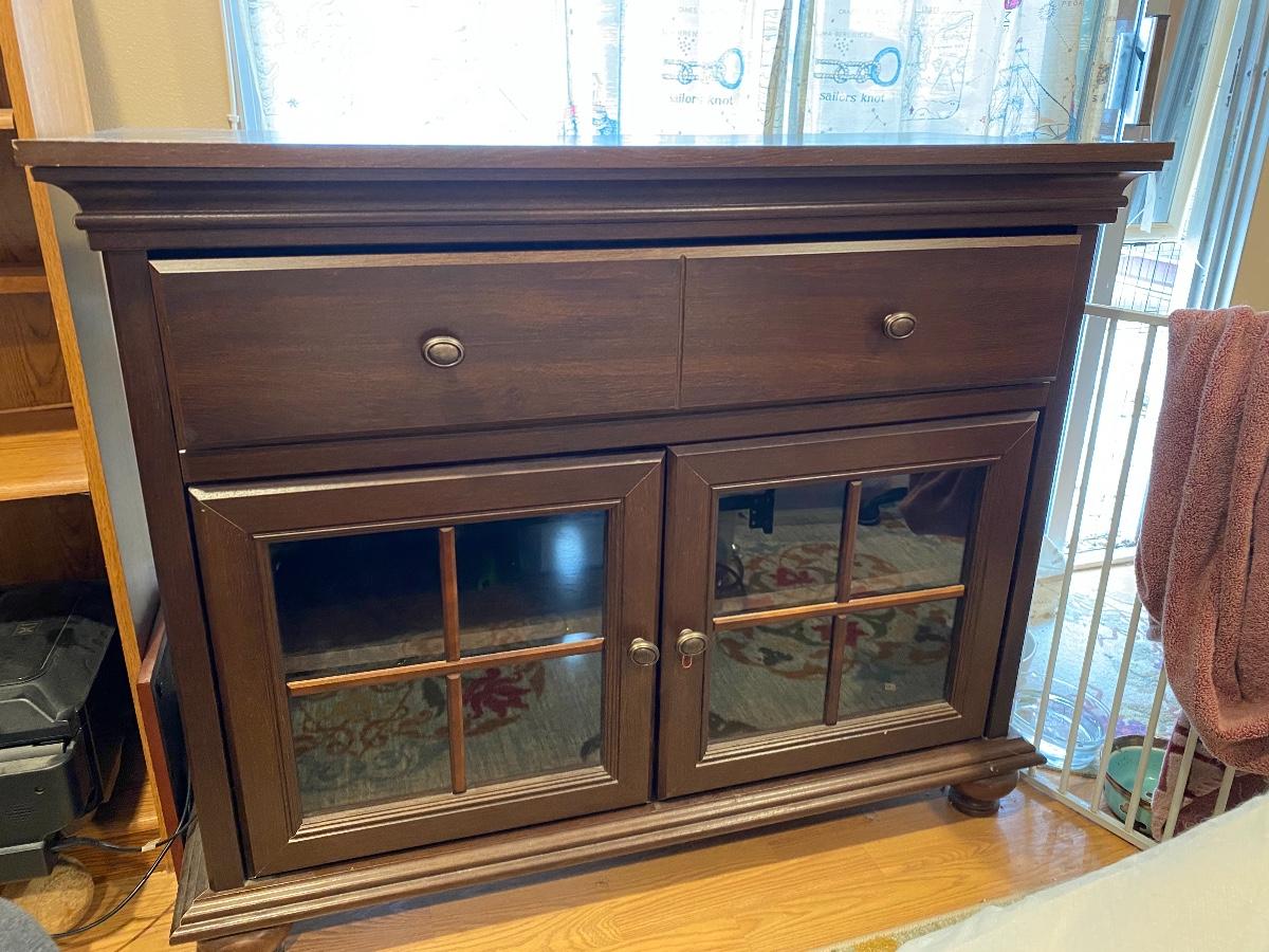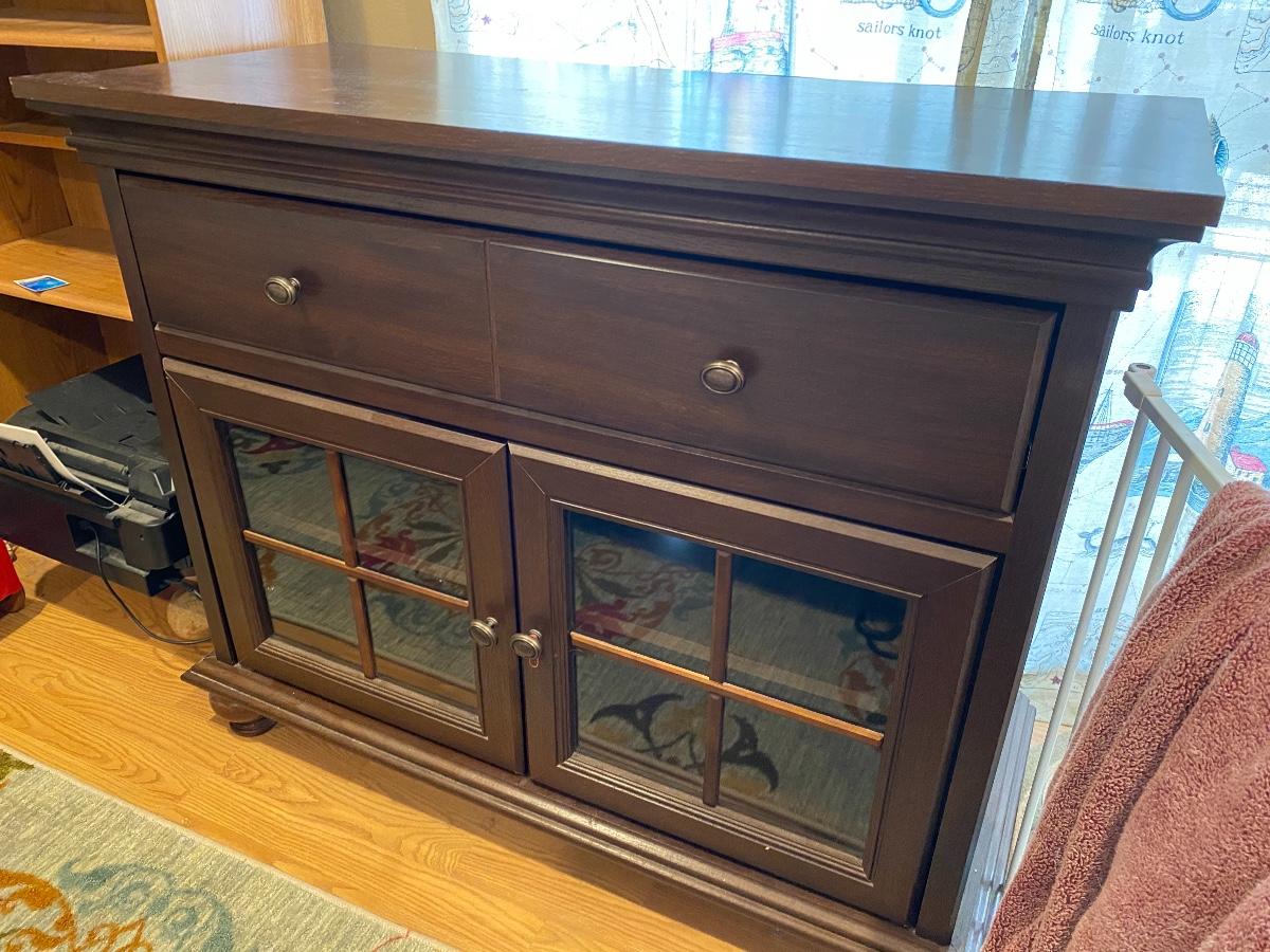Glass front cabinet. About 4’ tall. Glass cabinet doors with one long drawer. Good condition.