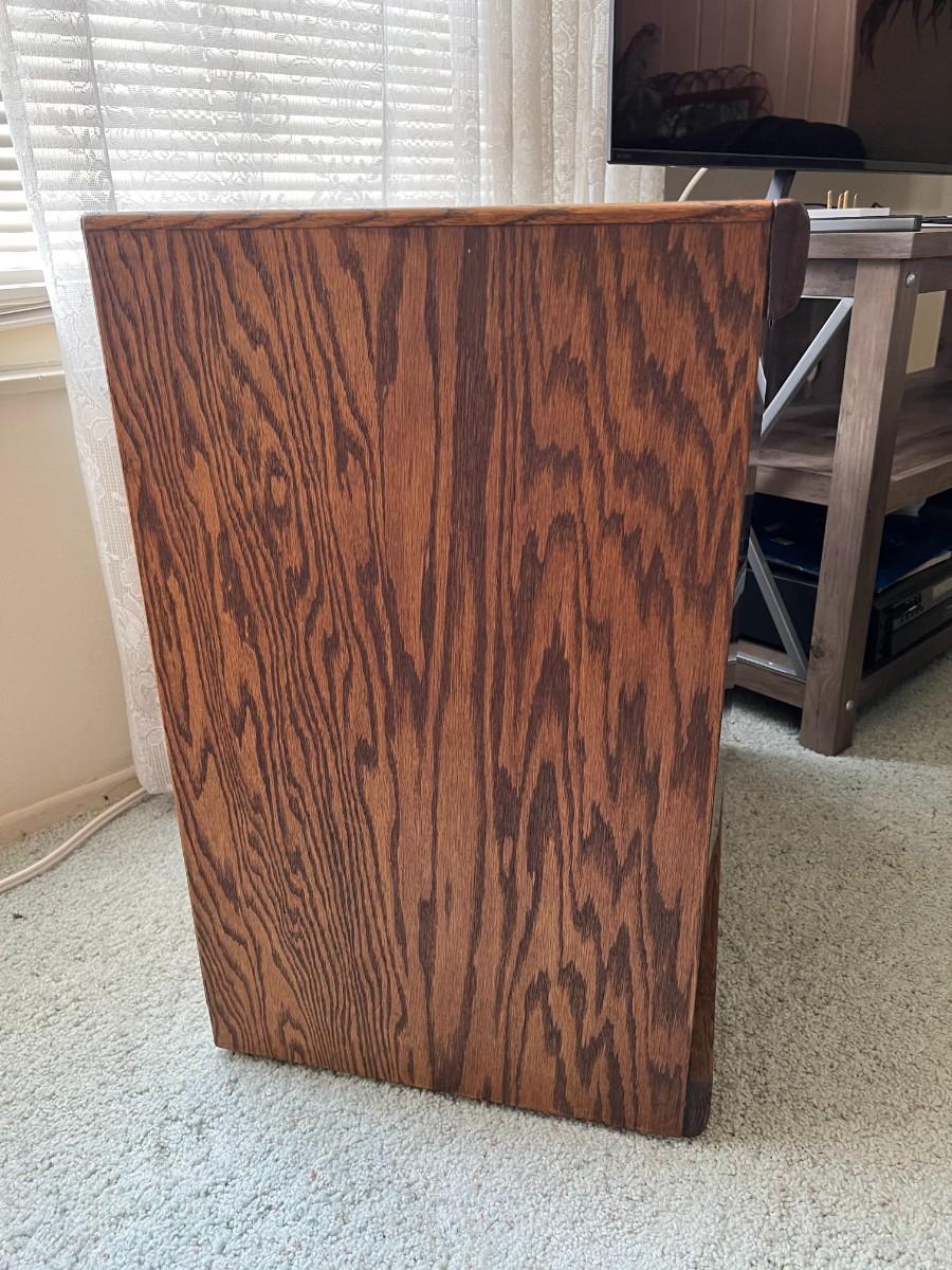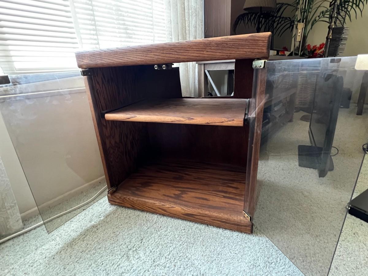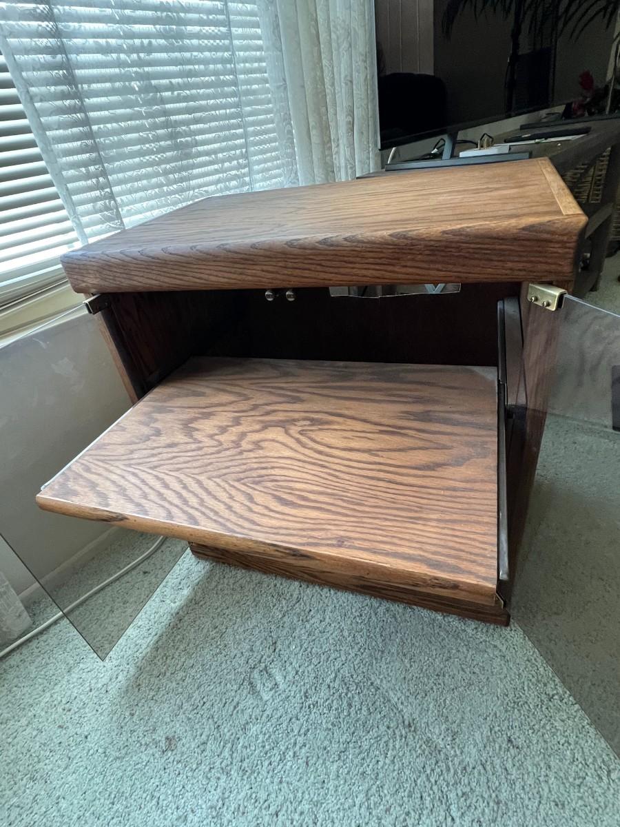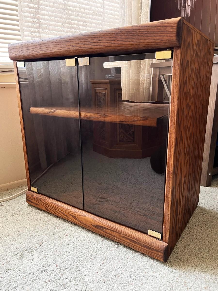 Glass Front Retro Oak Media Cabinet on Wheels. In good vintage condition. Pull out shelf.