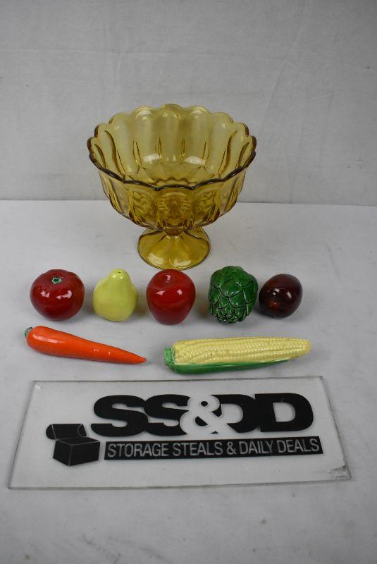 Glass Fruit Bowl with Glass: Tomato, Pear, Apple, Corn, Carrot, Artichoke, Plum