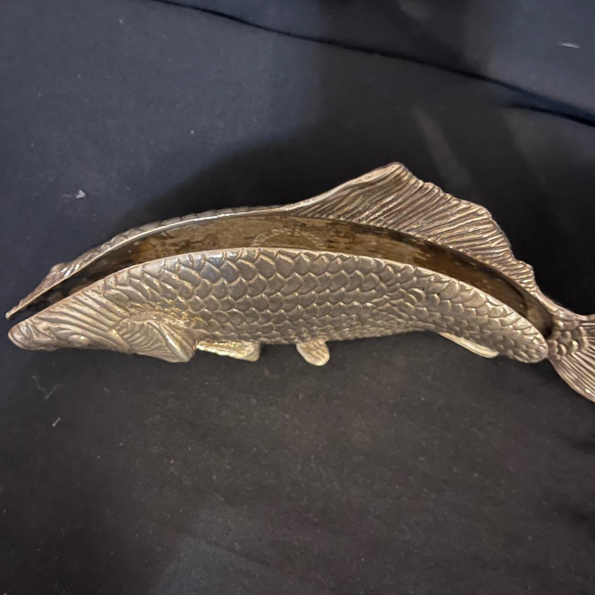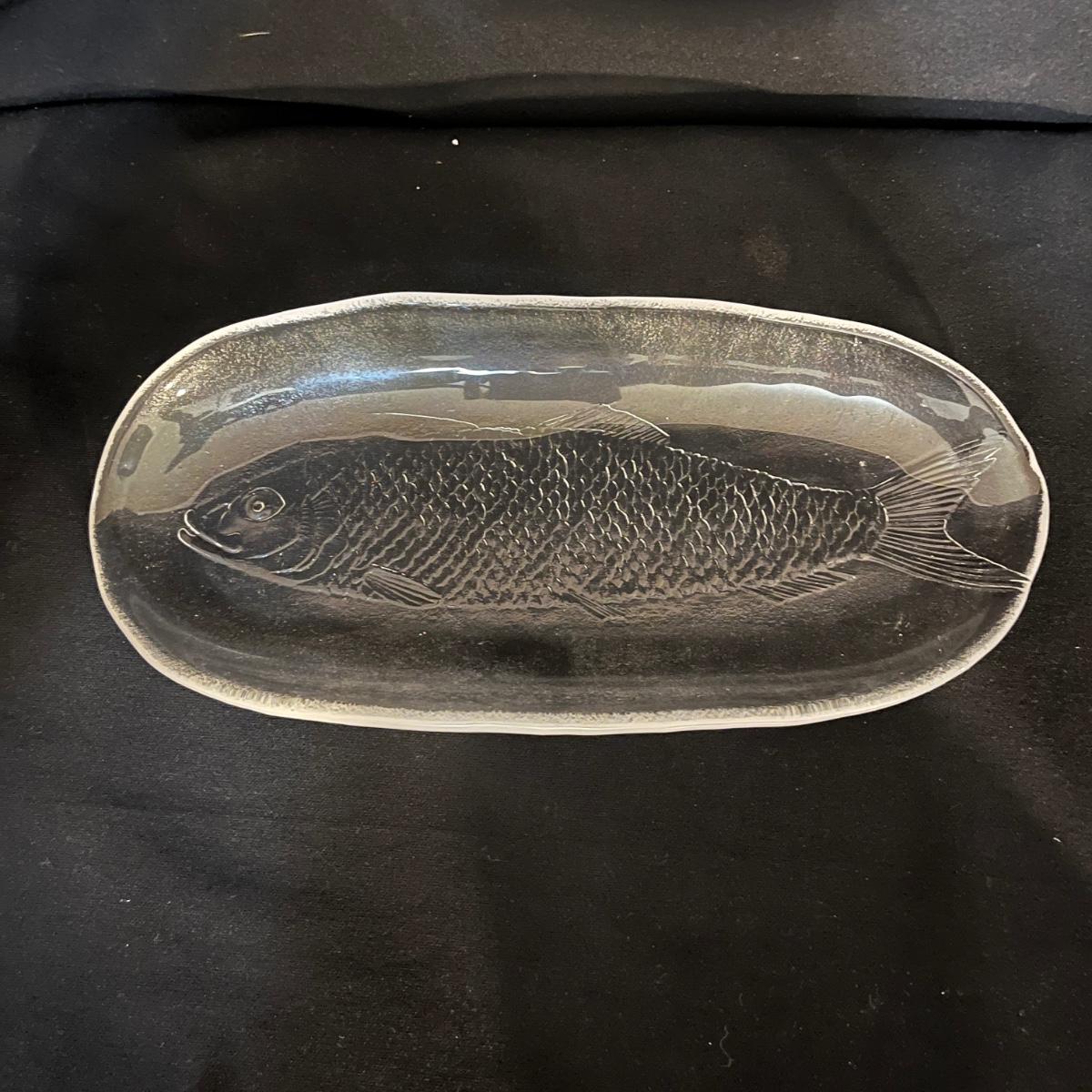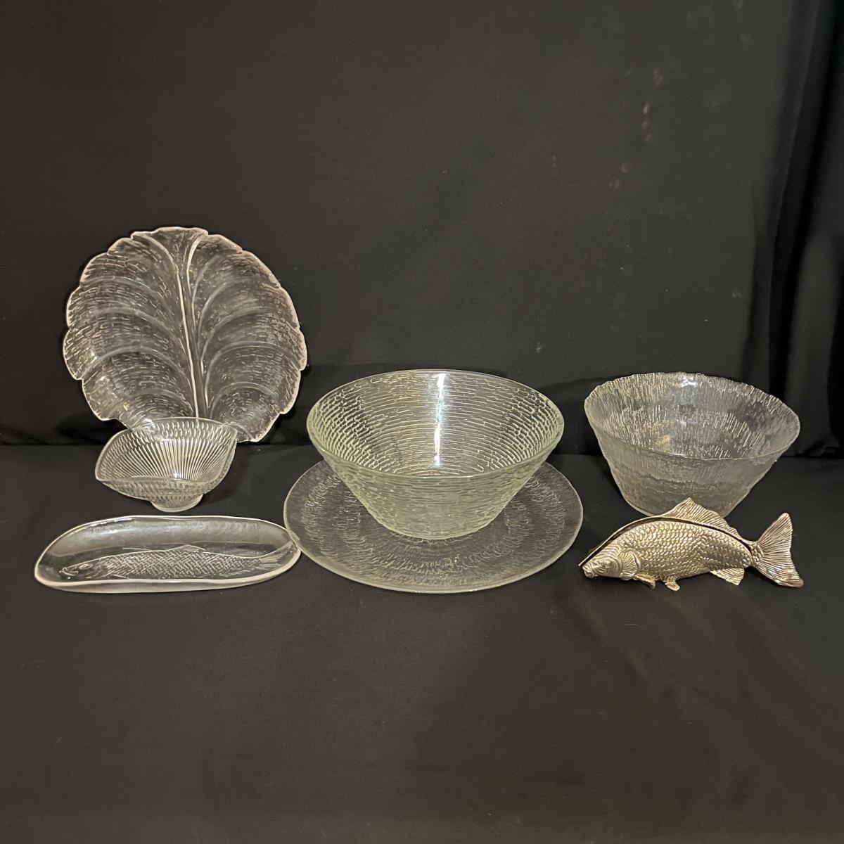 Lot includes matching fruit bowl and plate, leaf shaped plate, large fruit bowl, oblong fish adorned plate and a metal fish shaped letter holder. Largest bowl measures 11”D x 5”H.