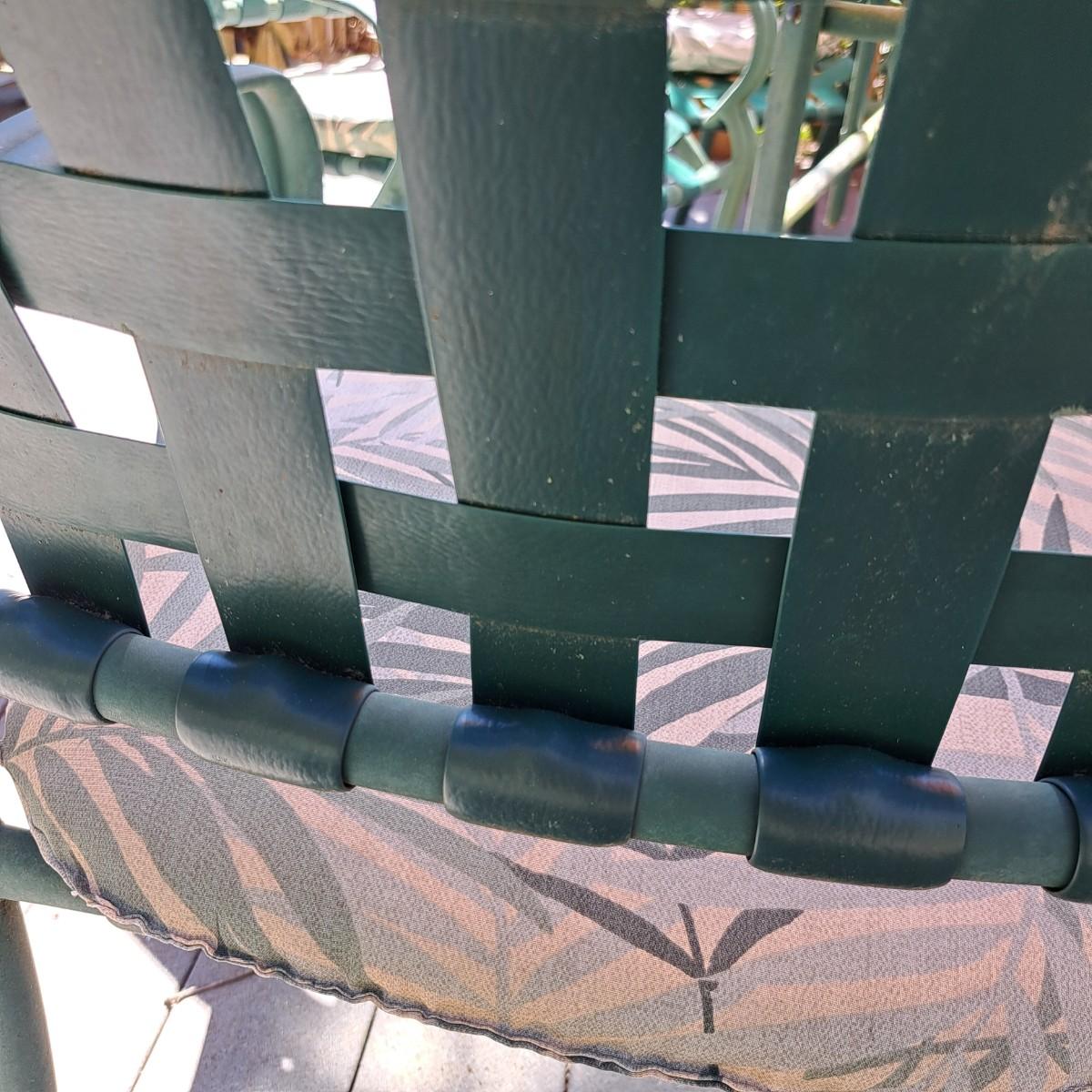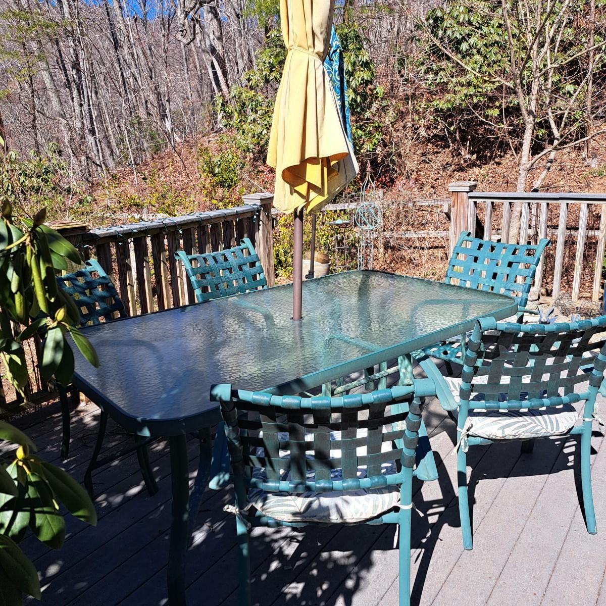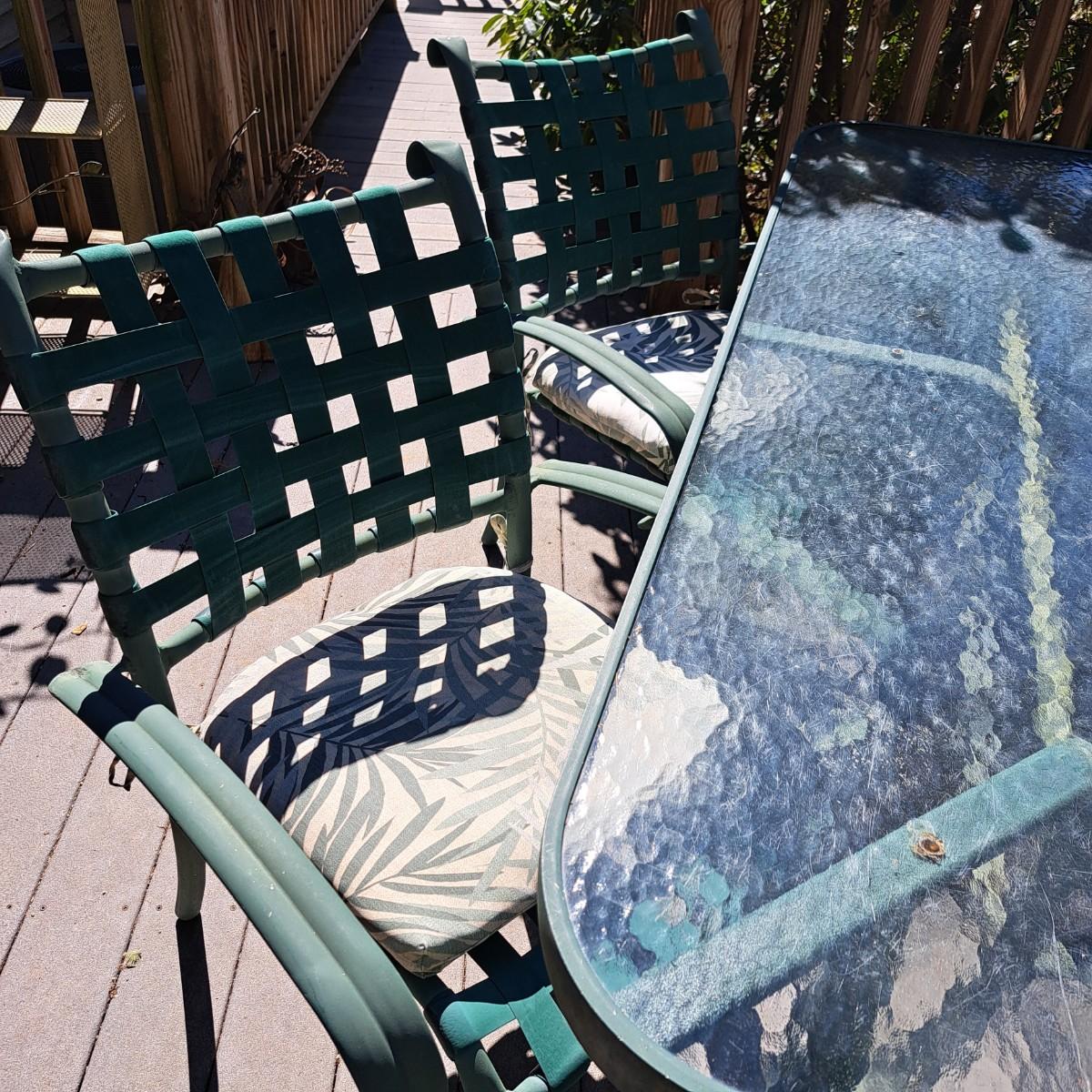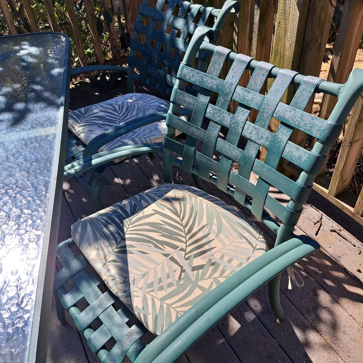 A glass patio table and chairs set that appears to be painted green aluminum. The table measures 6' in length x 3.5' in width with an inset wavy glass top and rounded corners. The five arm chairs with plastic webbed seats and backs measure 35.5"H × 25" arm-to-arm and 15" to top of seat. Each chair comes with its own matching green fern cushion, somewhat faded, and one cushion has a very small tear on bottom as shown. The umbrella stand with faded yellow umbrella is included. The umbrella pole with crank works well; only a small hole in umbrella as shown in photo. Set could use a bit of deep cleaning; otherwise, a comfortable way to spend an afternoon eating lunch on the patio! Local pickup only.