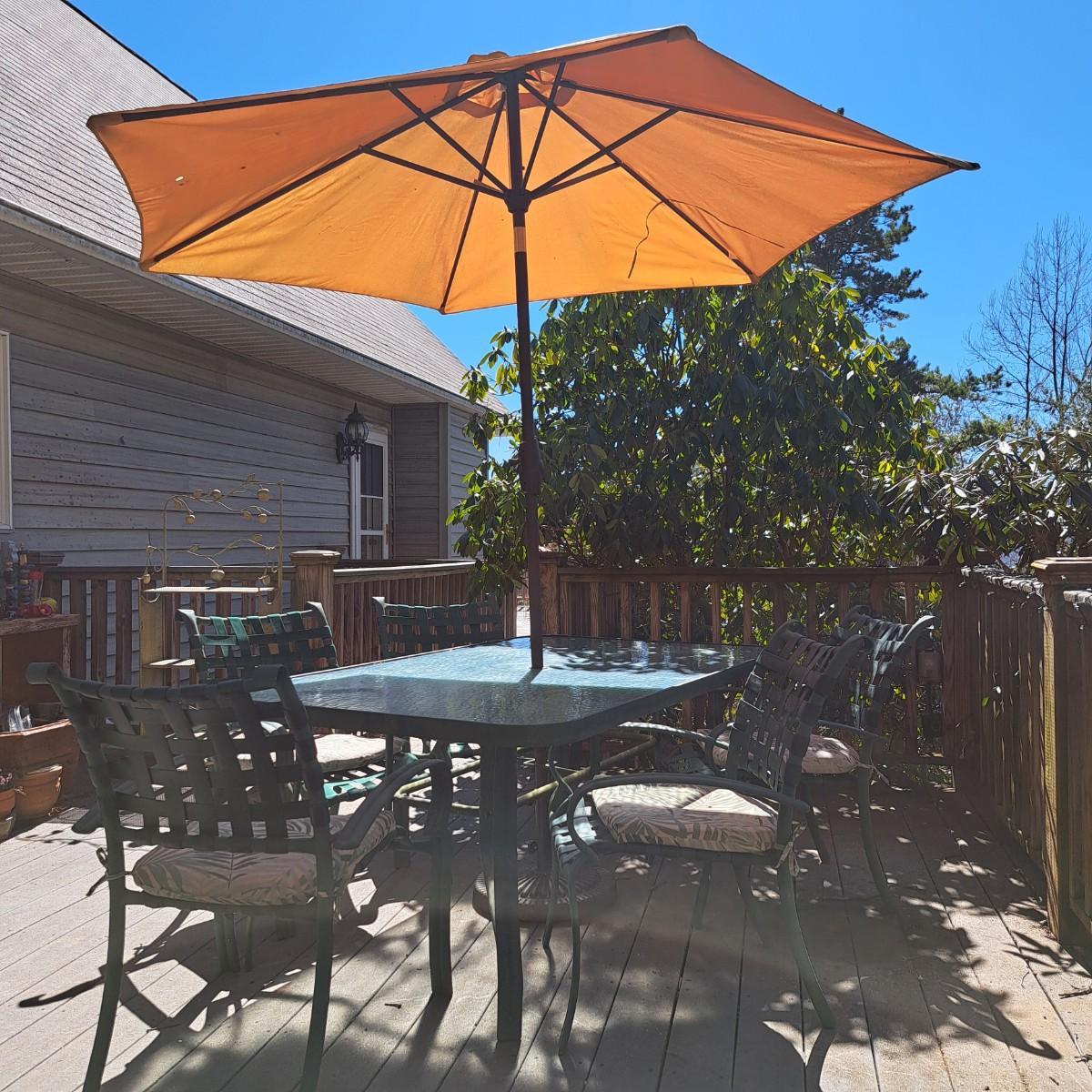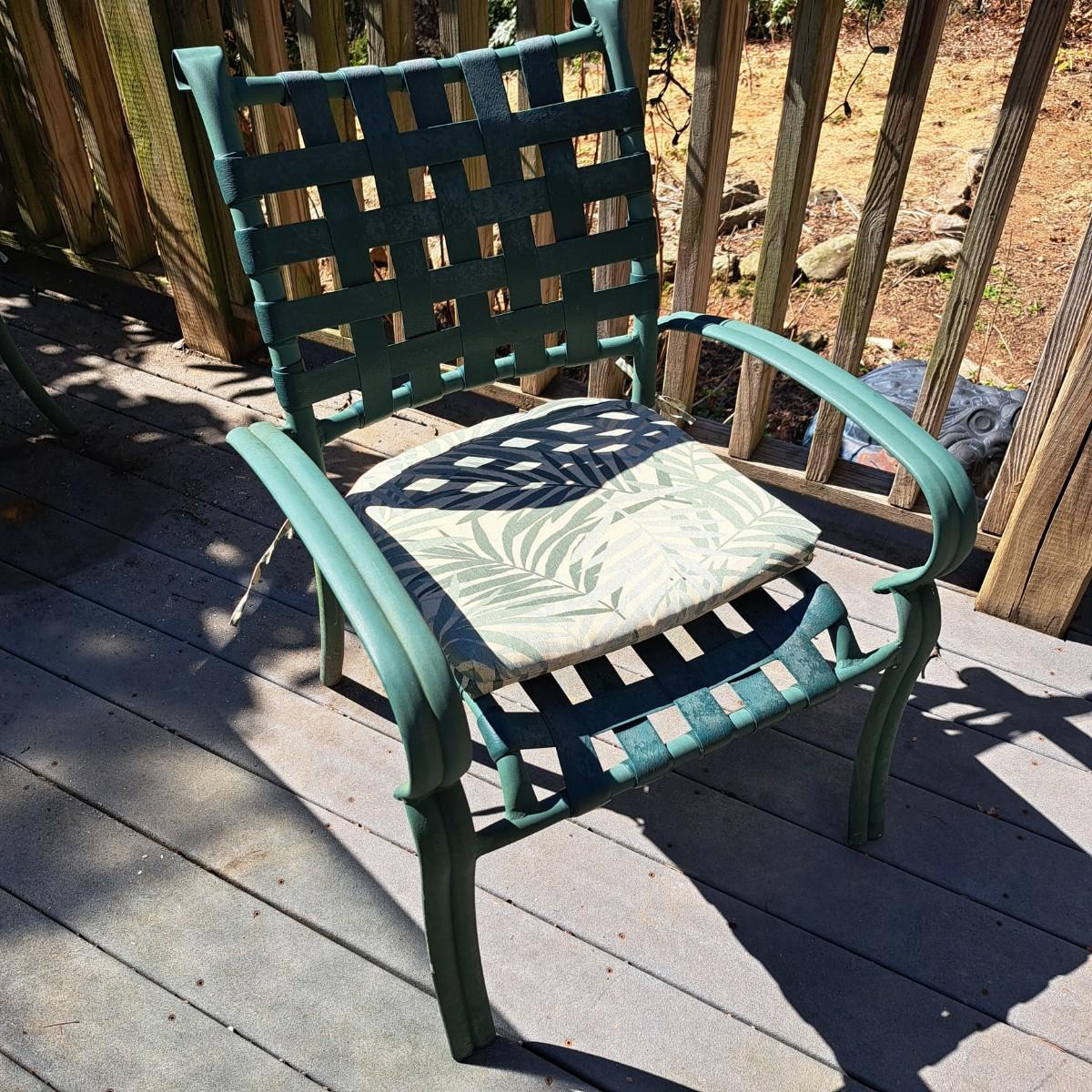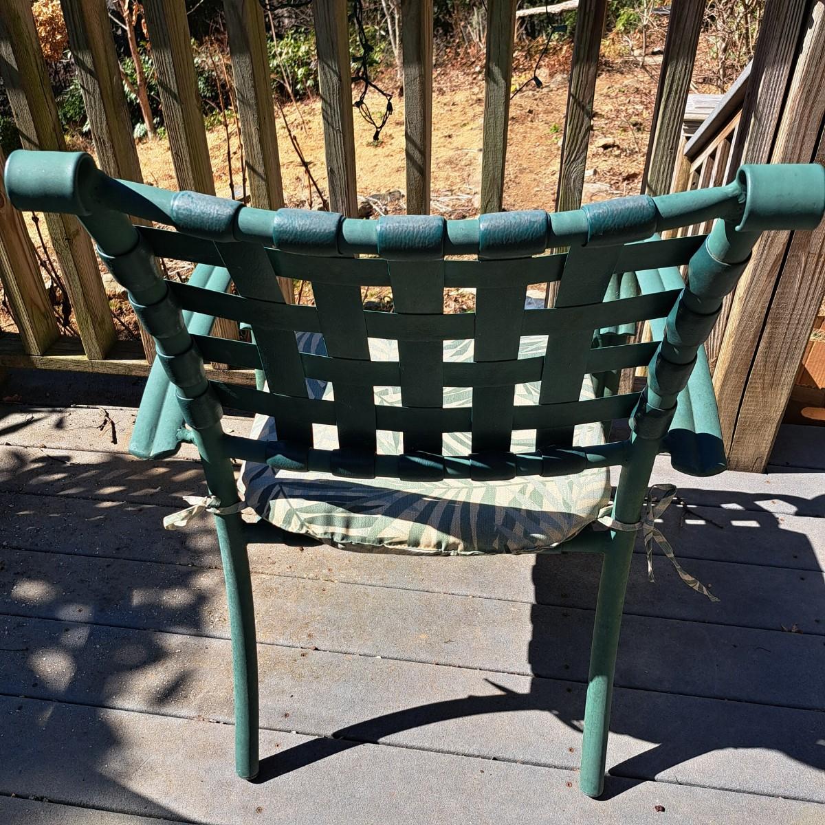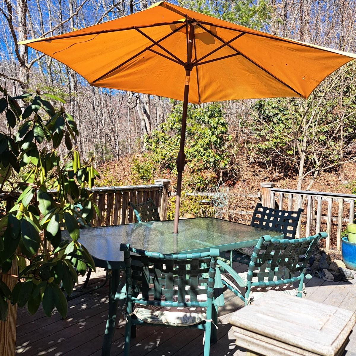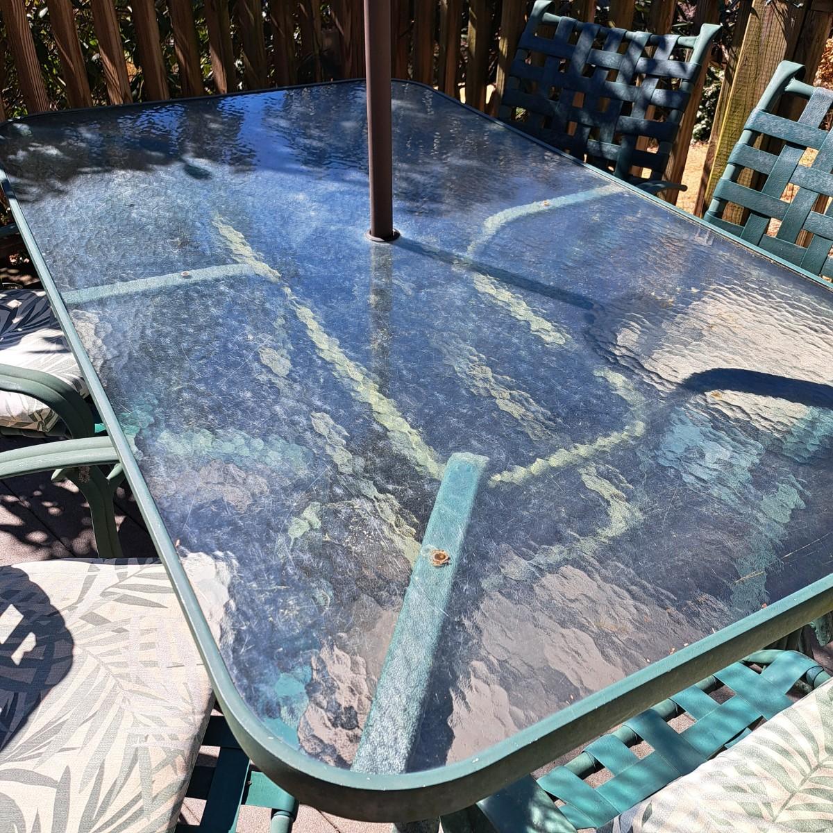 A glass patio table and chairs set that appears to be painted green aluminum. The table measures 6' in length x 3.5' in width with an inset wavy glass top and rounded corners. The five arm chairs with plastic webbed seats and backs measure 35.5"H × 25" arm-to-arm and 15" to top of seat. Each chair comes with its own matching green fern cushion, somewhat faded, and one cushion has a very small tear on bottom as shown. The umbrella stand with faded yellow umbrella is included. The umbrella pole with crank works well; only a small hole in umbrella as shown in photo. Set could use a bit of deep cleaning; otherwise, a comfortable way to spend an afternoon eating lunch on the patio! Local pickup only.