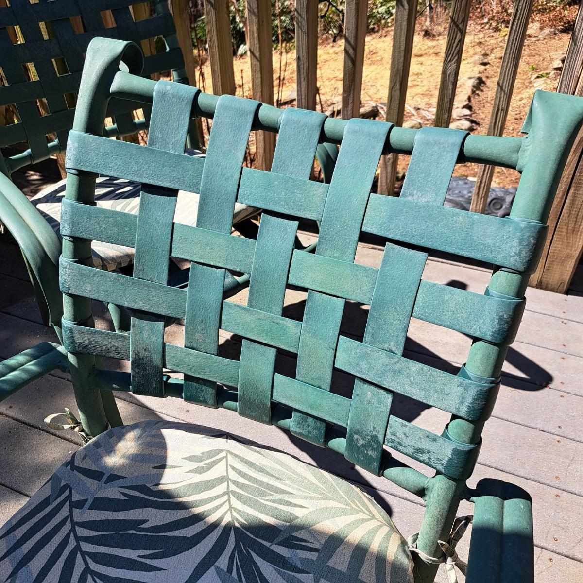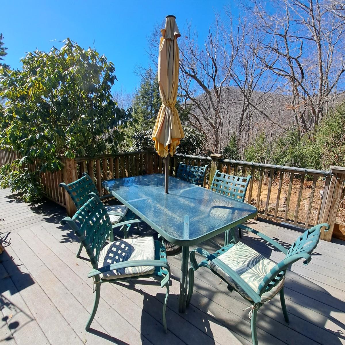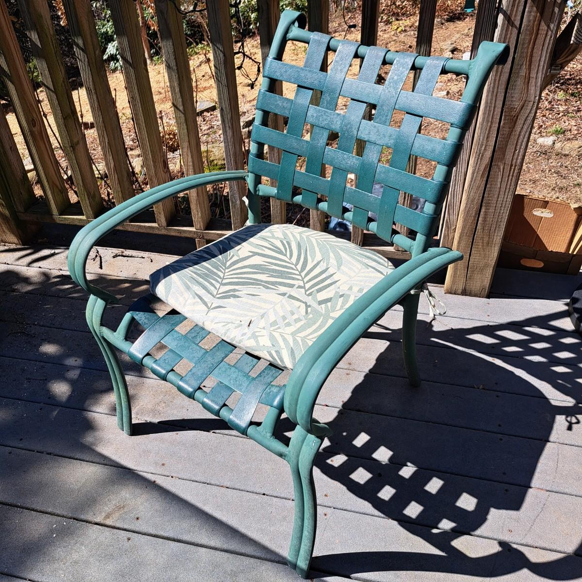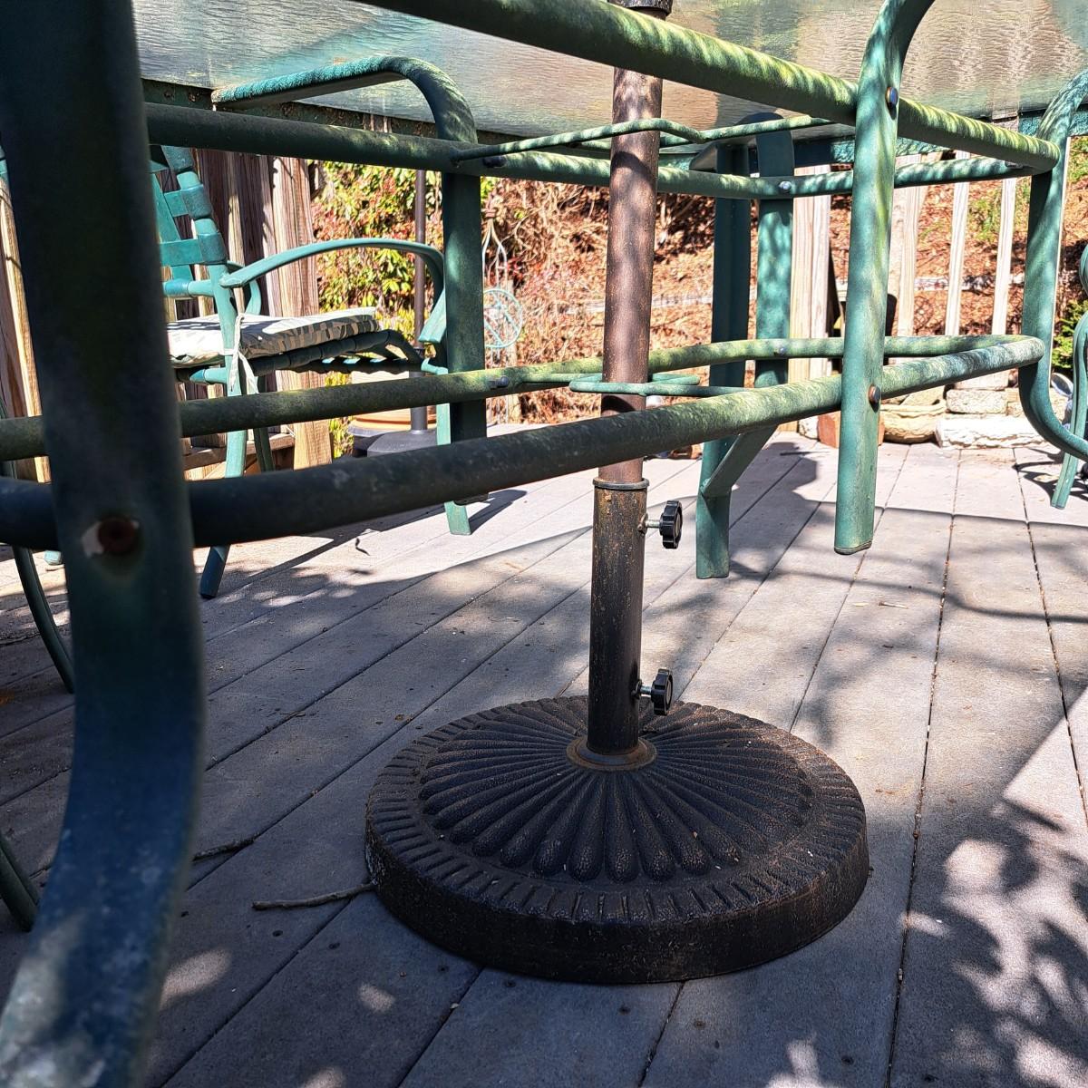 A glass patio table and chairs set that appears to be painted green aluminum. The table measures 6' in length x 3.5' in width with an inset wavy glass top and rounded corners. The five arm chairs with plastic webbed seats and backs measure 35.5"H × 25" arm-to-arm and 15" to top of seat. Each chair comes with its own matching green fern cushion, somewhat faded, and one cushion has a very small tear on bottom as shown. The umbrella stand with faded yellow umbrella is included. The umbrella pole with crank works well; only a small hole in umbrella as shown in photo. Set could use a bit of deep cleaning; otherwise, a comfortable way to spend an afternoon eating lunch on the patio! Local pickup only.