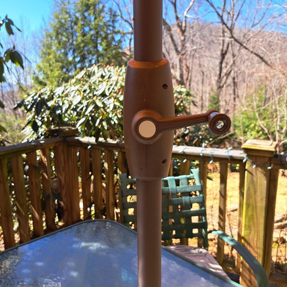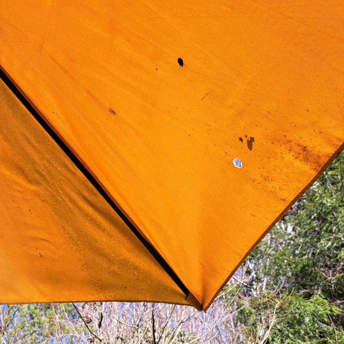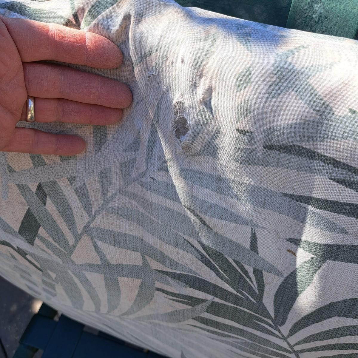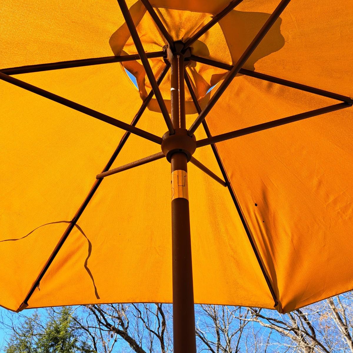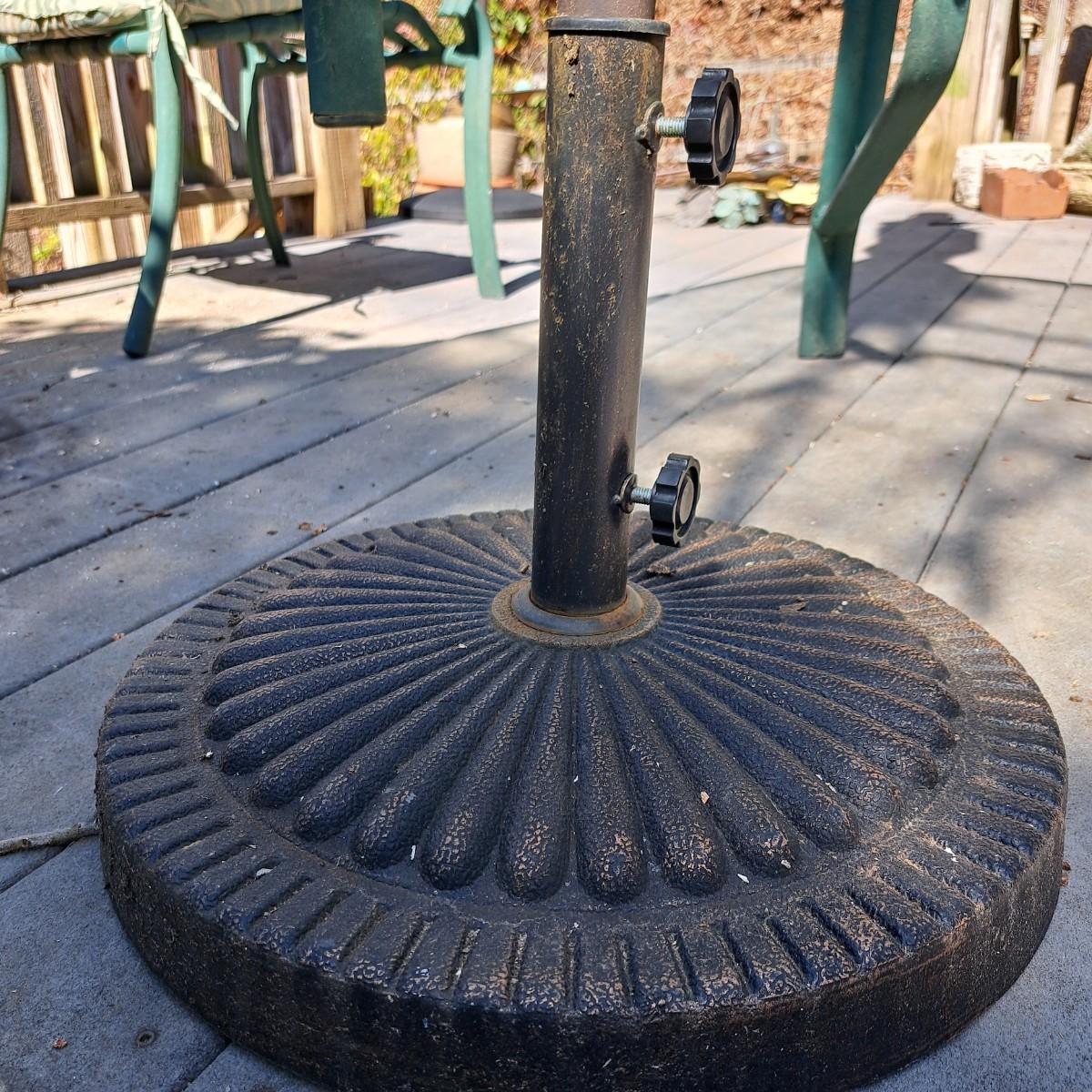 A glass patio table and chairs set that appears to be painted green aluminum. The table measures 6' in length x 3.5' in width with an inset wavy glass top and rounded corners. The five arm chairs with plastic webbed seats and backs measure 35.5"H × 25" arm-to-arm and 15" to top of seat. Each chair comes with its own matching green fern cushion, somewhat faded, and one cushion has a very small tear on bottom as shown. The umbrella stand with faded yellow umbrella is included. The umbrella pole with crank works well; only a small hole in umbrella as shown in photo. Set could use a bit of deep cleaning; otherwise, a comfortable way to spend an afternoon eating lunch on the patio! Local pickup only.