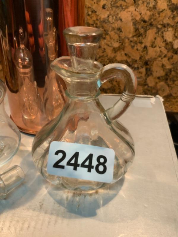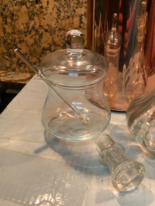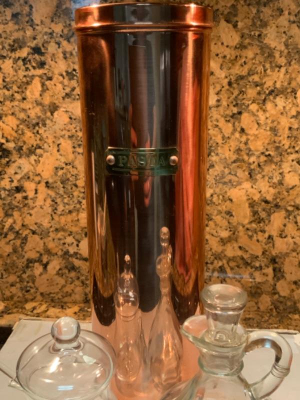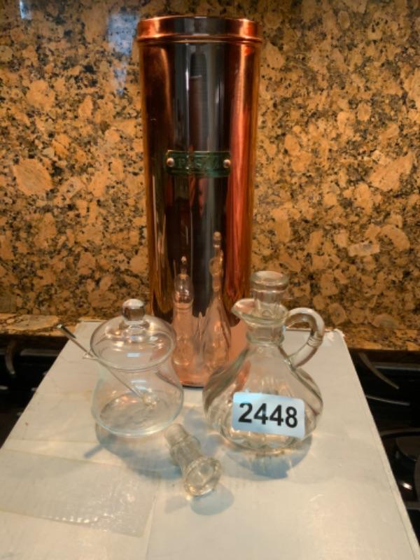 Glass honey jar with dipper, vinegar cruet with extra top, copper pasta container lot 2448