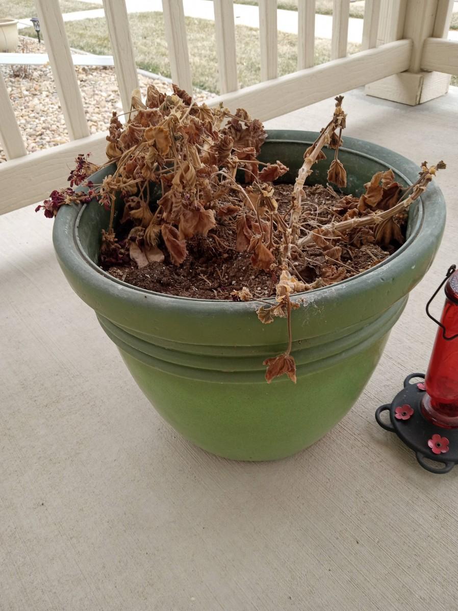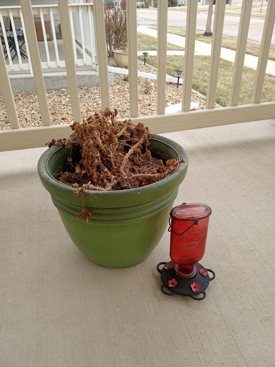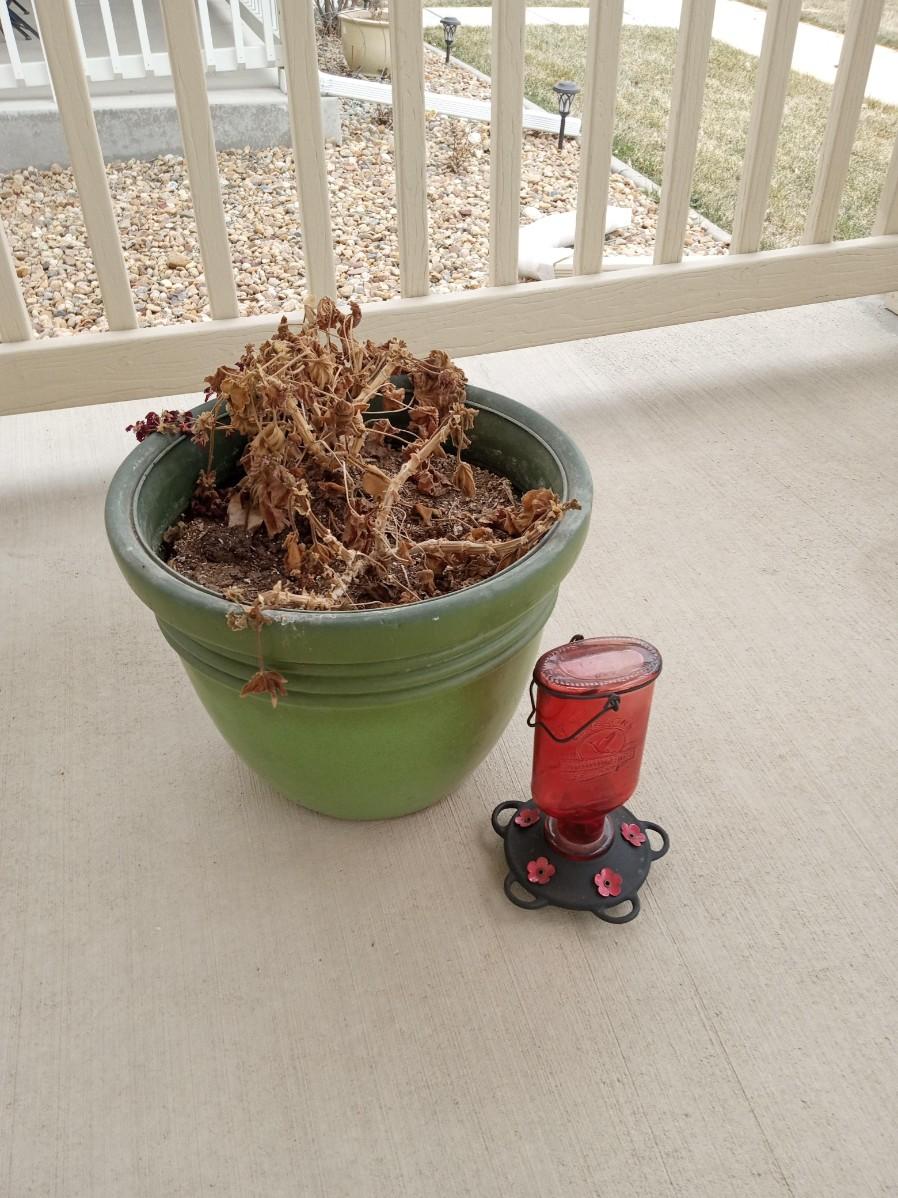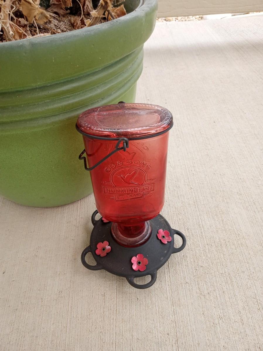 GLASS HUMMINGBIRD FEEDER AND A CLAY FLOWER POT