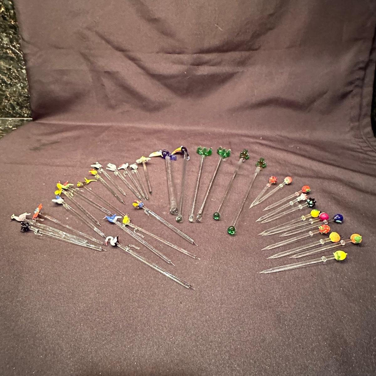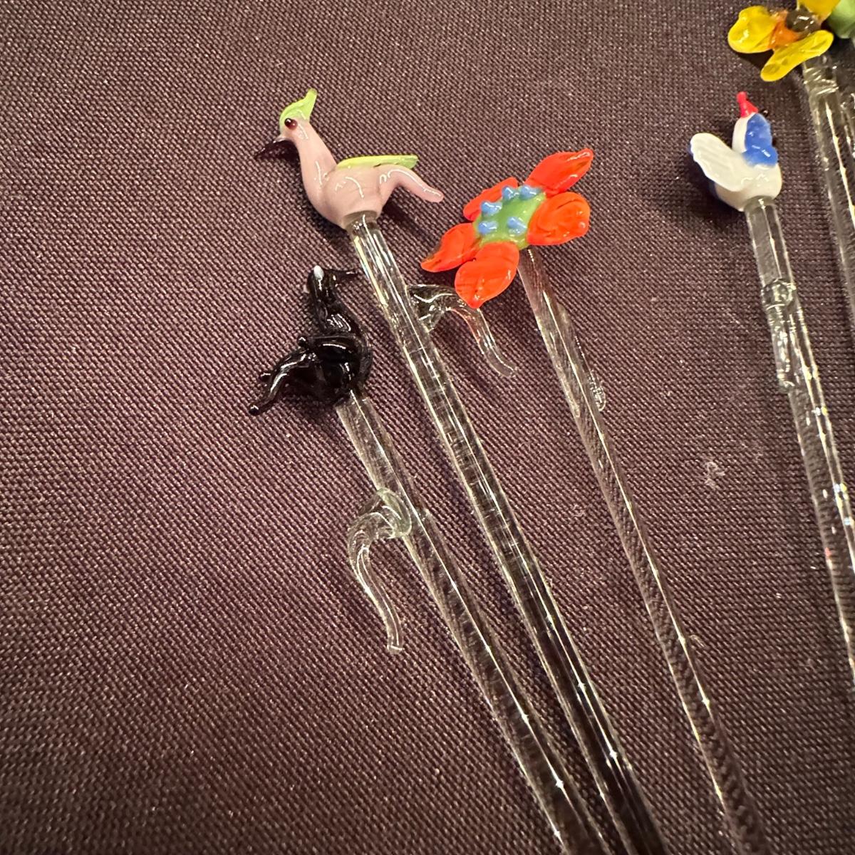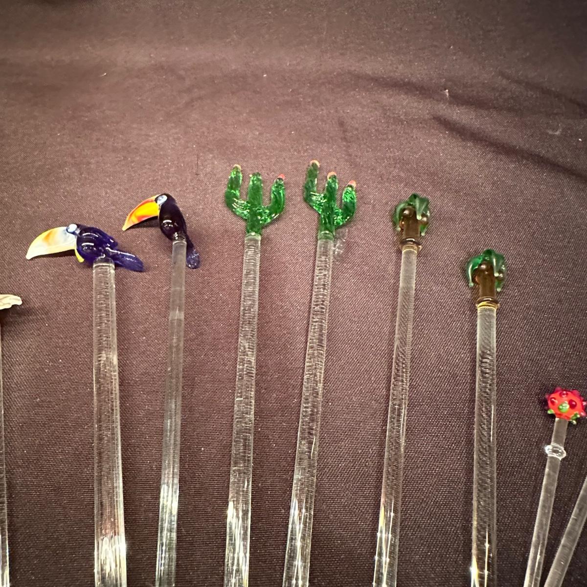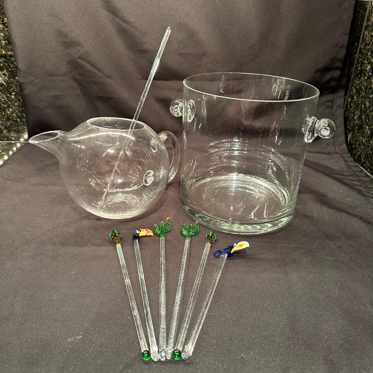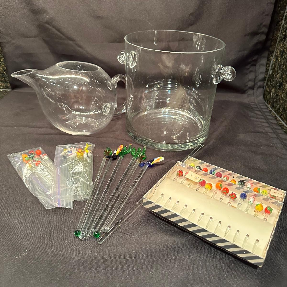 Glass ice bucket, pitcher, and decorative glass swizzle sticks. Ice bucket measures 7.5”D x 7..5”H. Shipping available.
