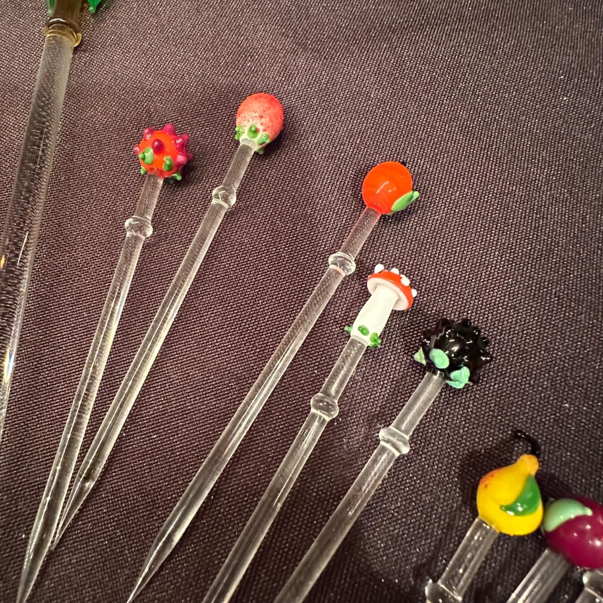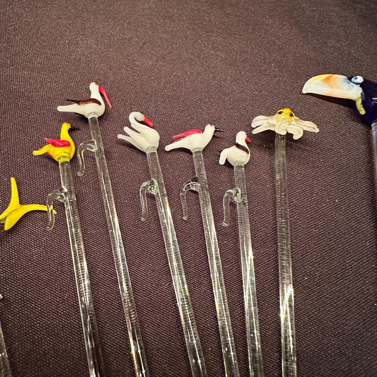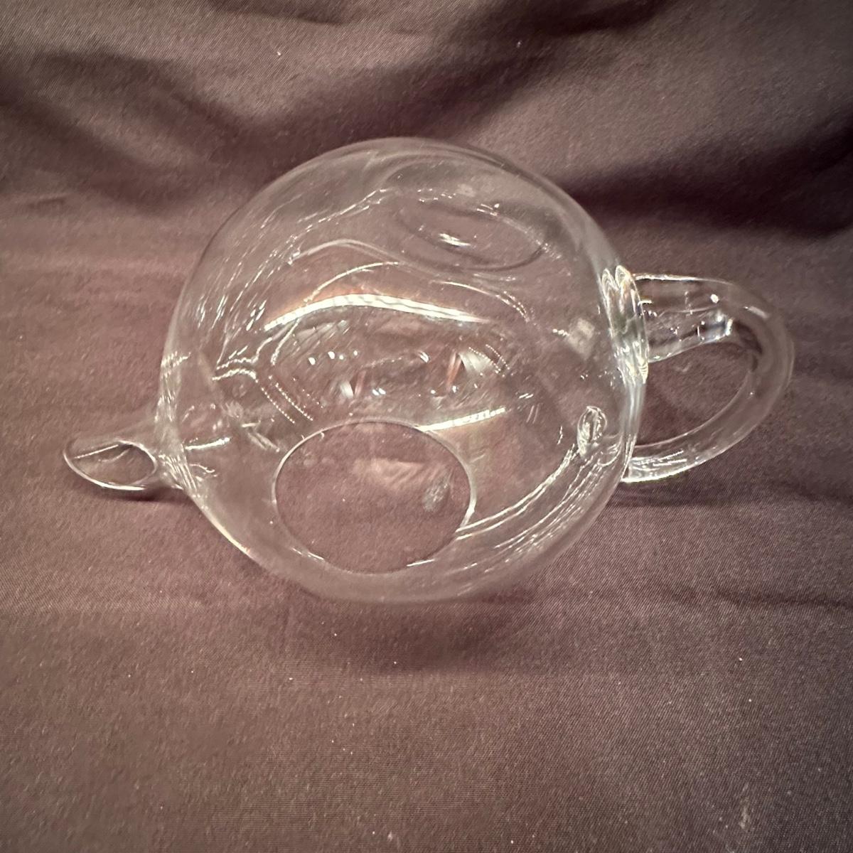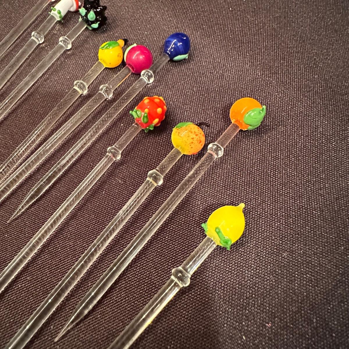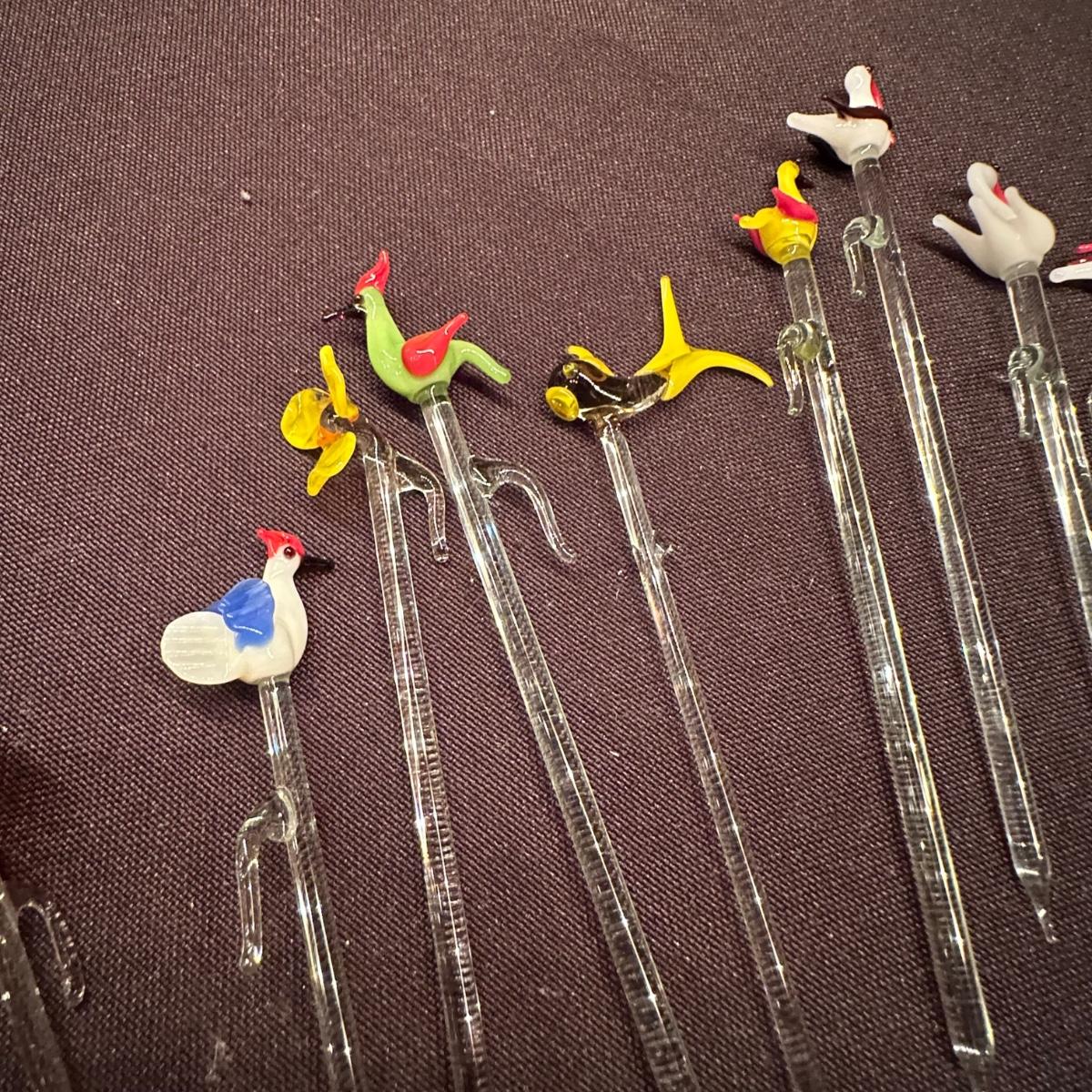 Glass ice bucket, pitcher, and decorative glass swizzle sticks. Ice bucket measures 7.5”D x 7..5”H. Shipping available.
