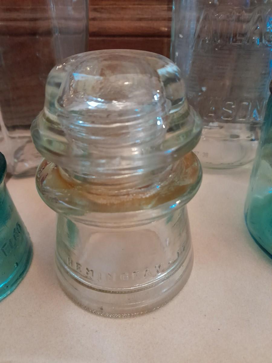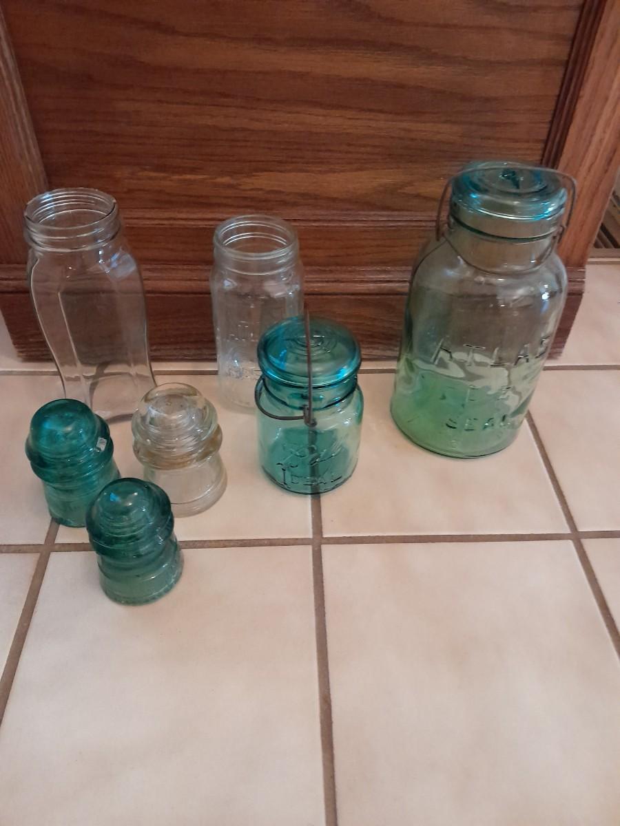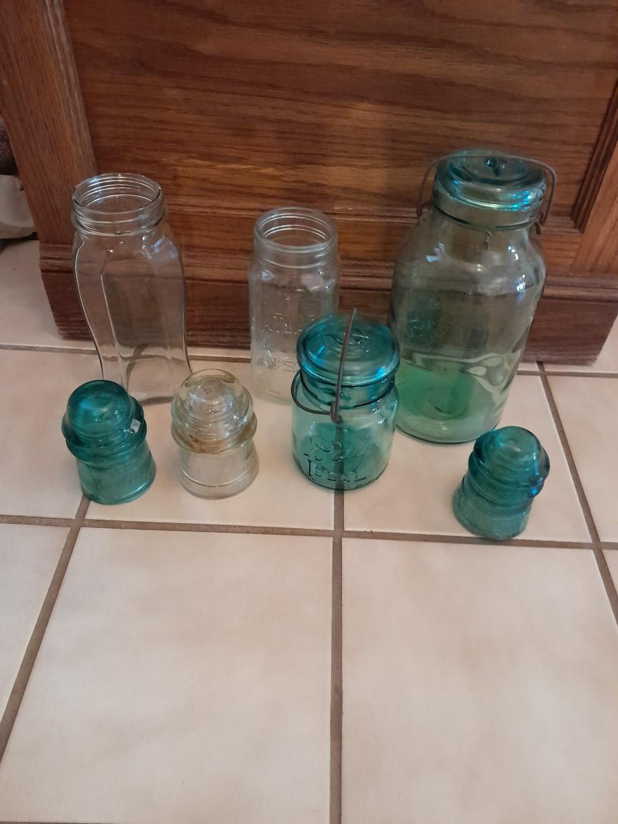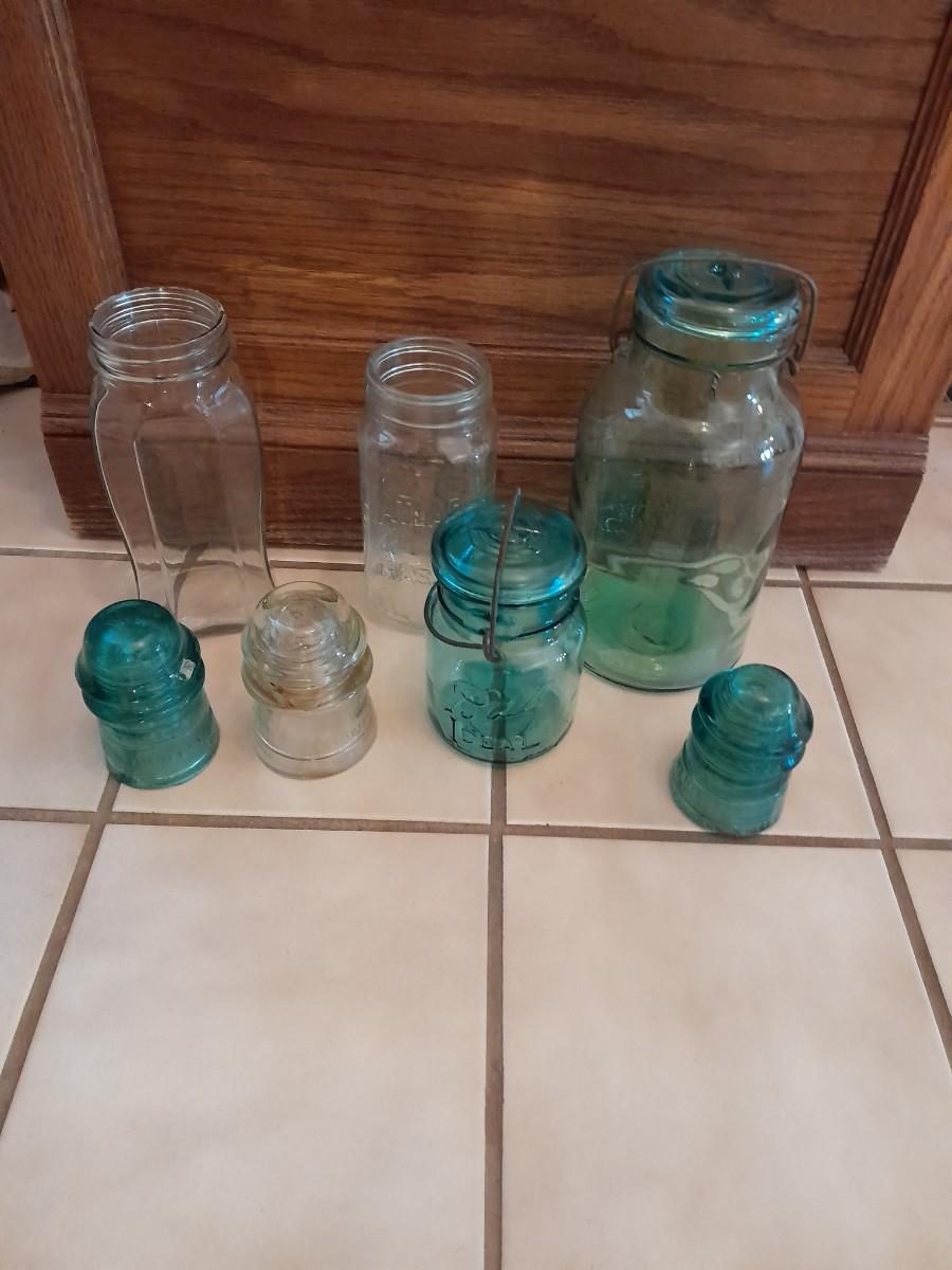 GLASS INSULATORS, SOME BLUE GLASS, AND VINTAGE JARS