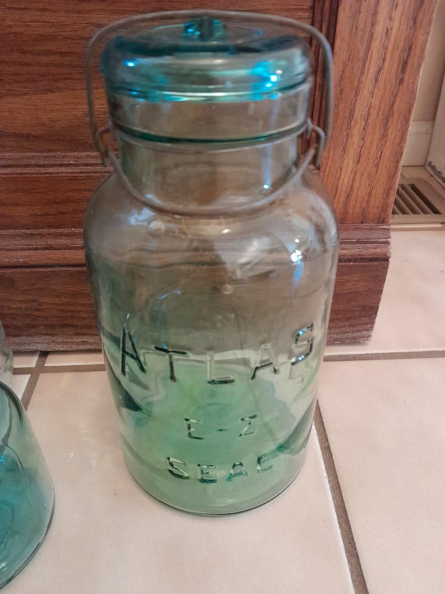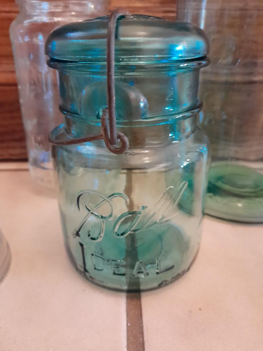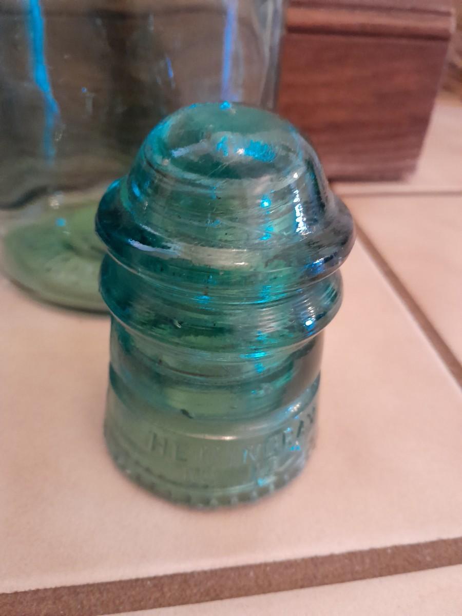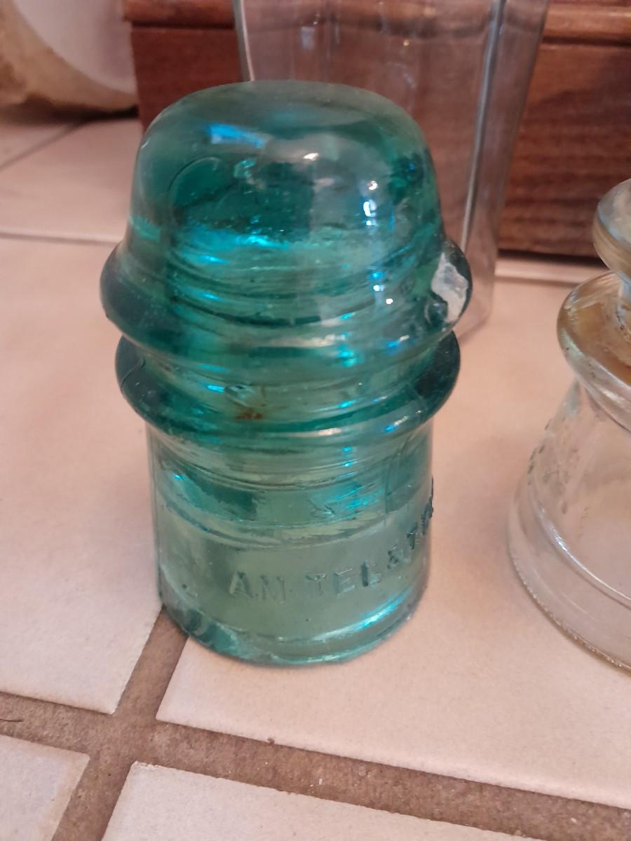 GLASS INSULATORS, SOME BLUE GLASS, AND VINTAGE JARS