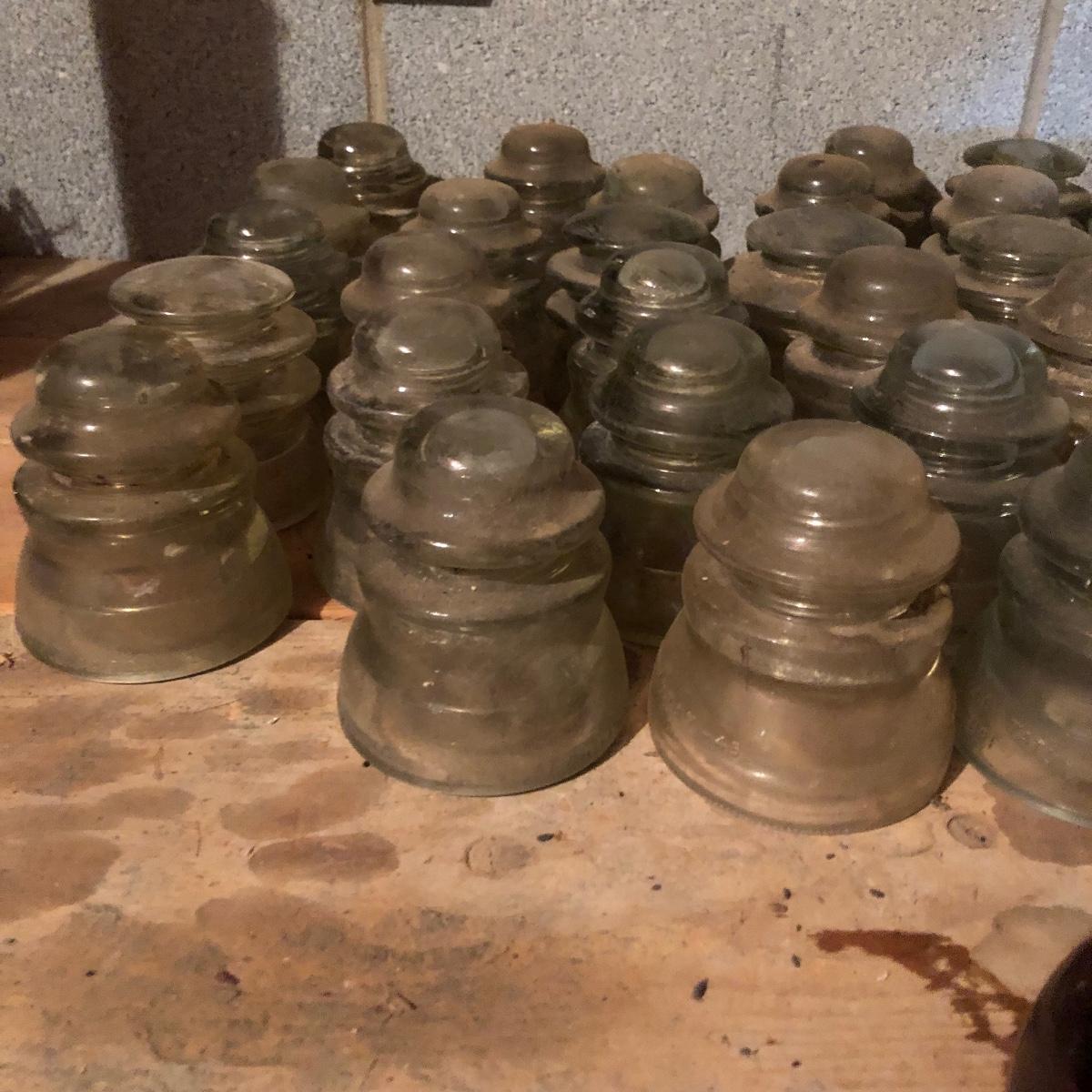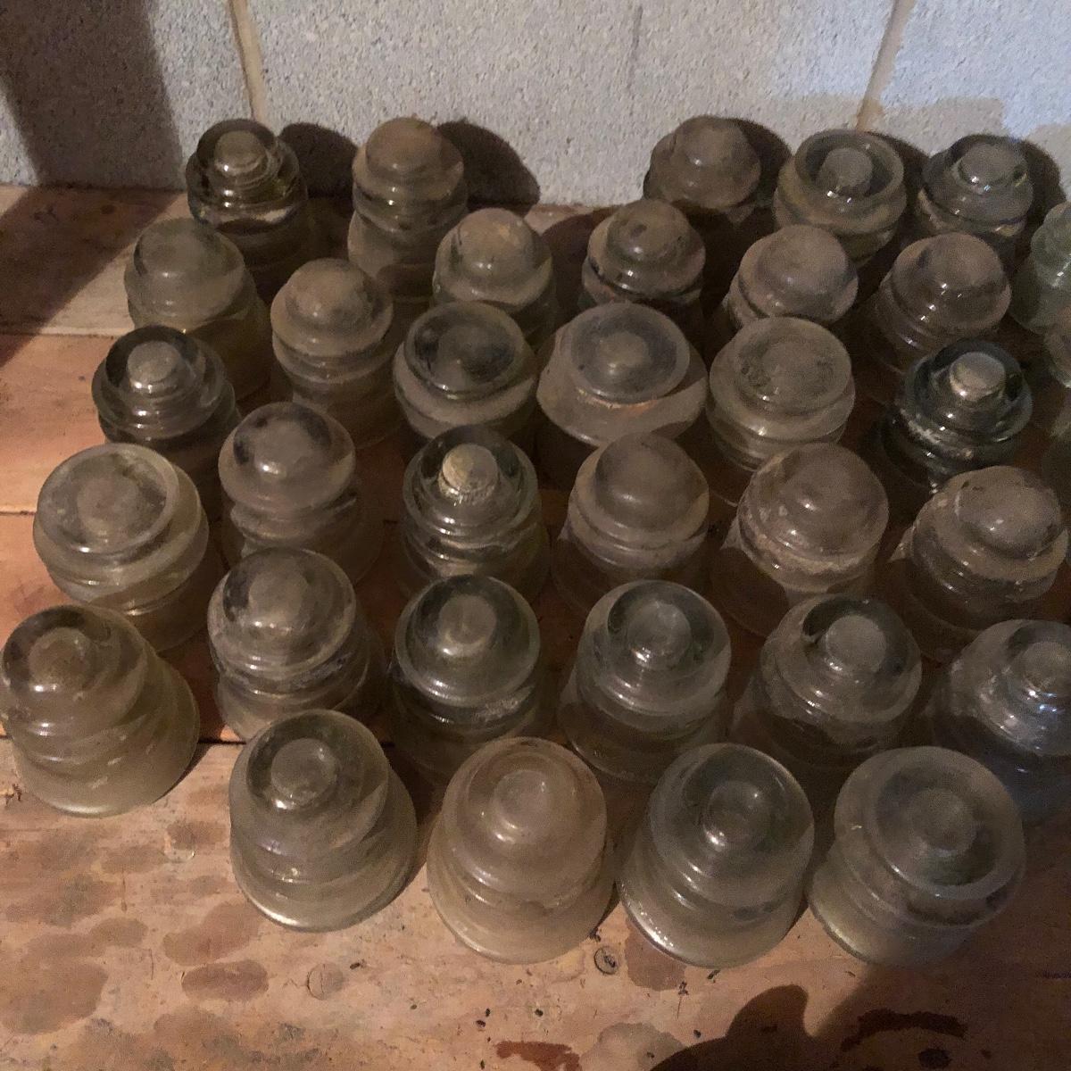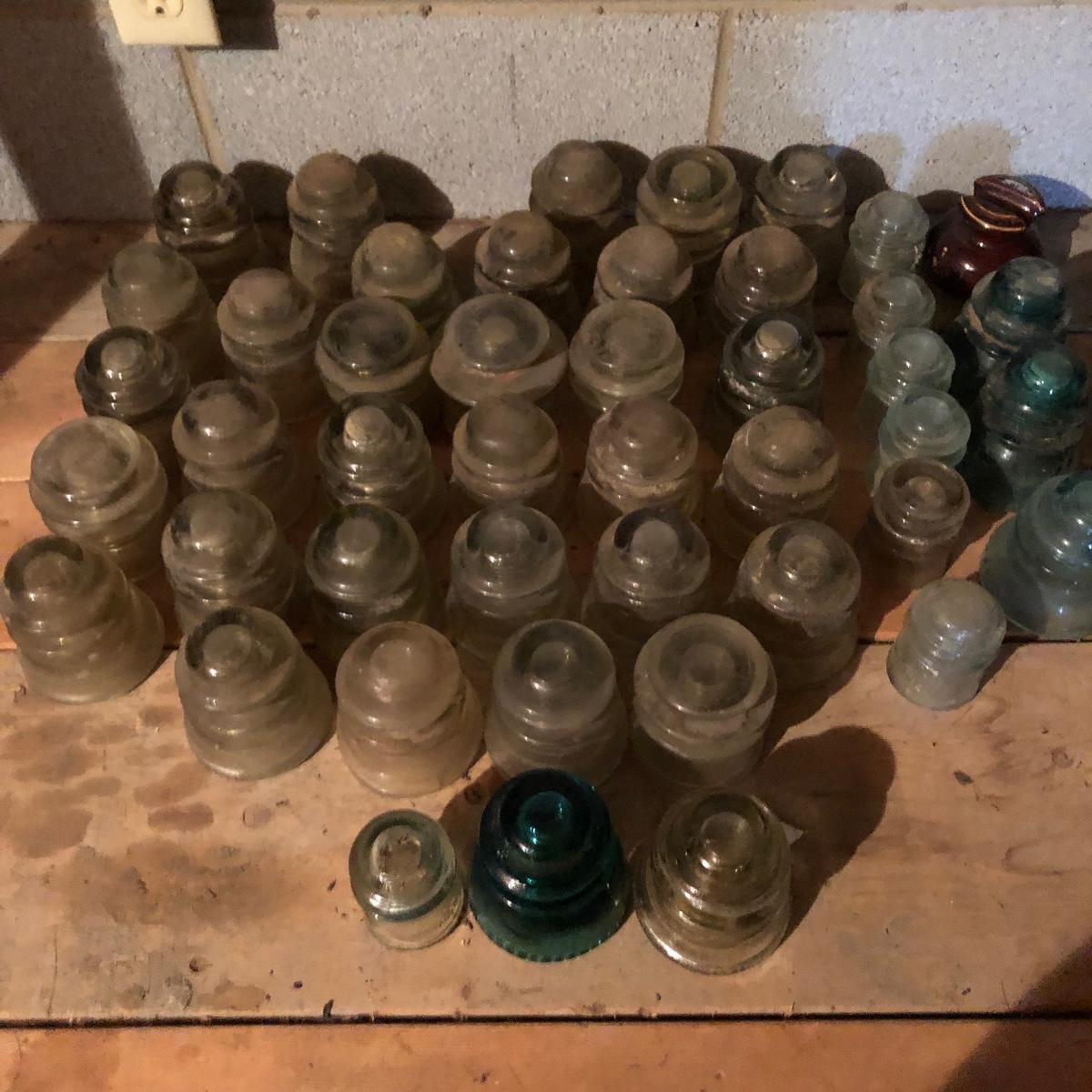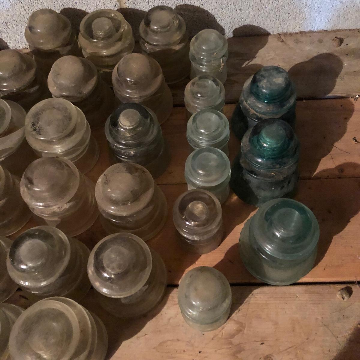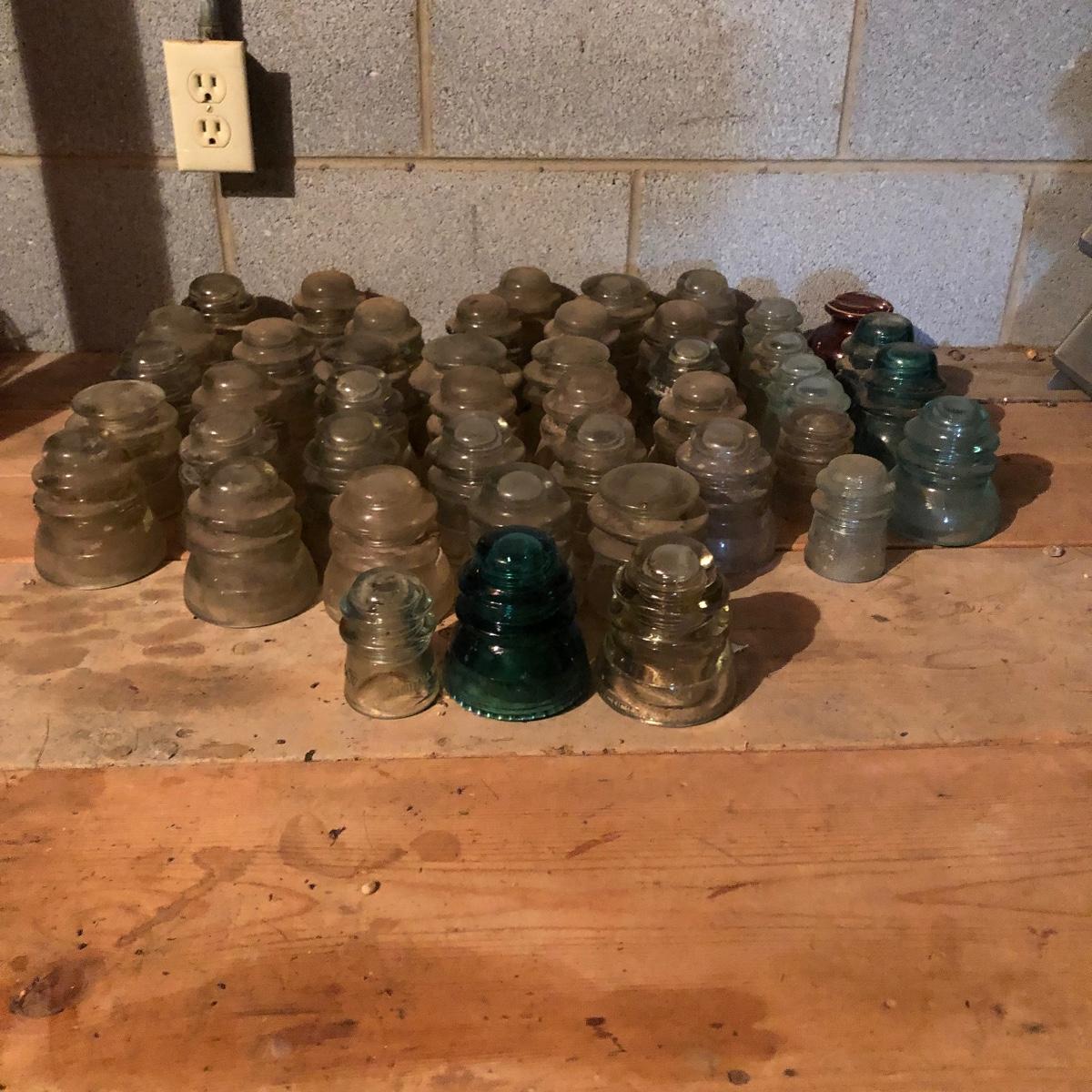 Lot includes over forty vintage glass insulators in a variety of sizes and colors. Largest insulator measures 3.5”D x 4” tall. They could use a good clean as they are very dusty.