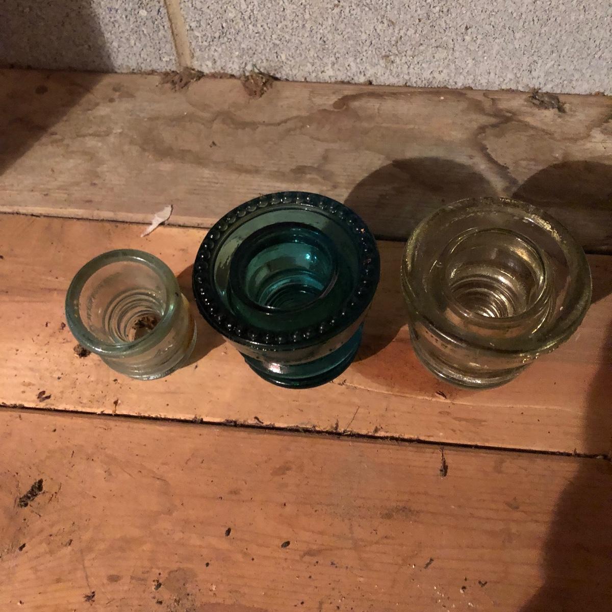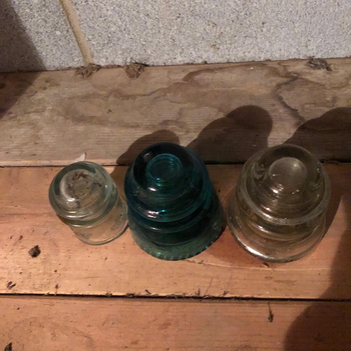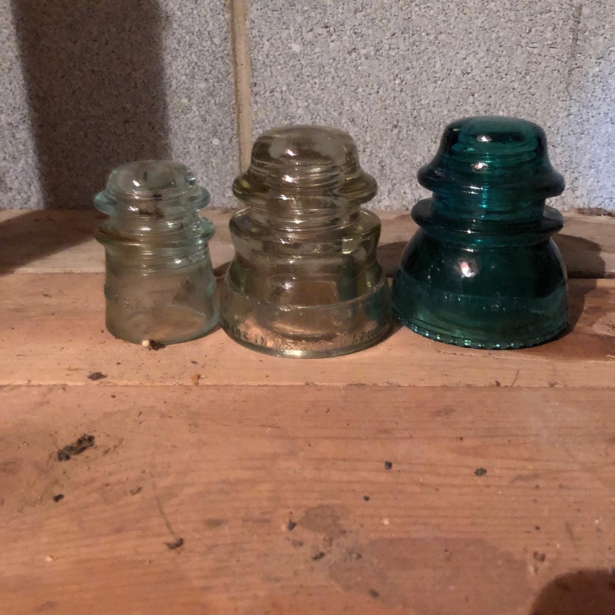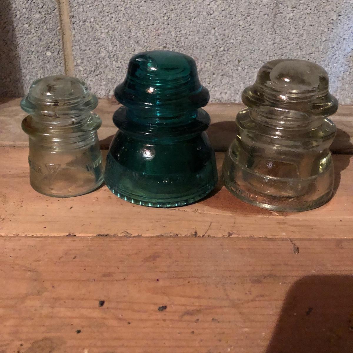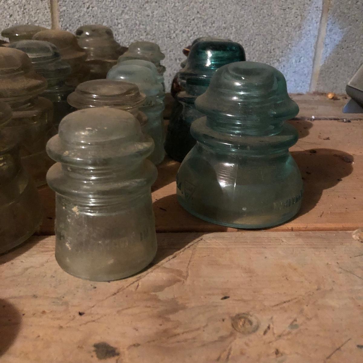 Lot includes over forty vintage glass insulators in a variety of sizes and colors. Largest insulator measures 3.5”D x 4” tall. They could use a good clean as they are very dusty.