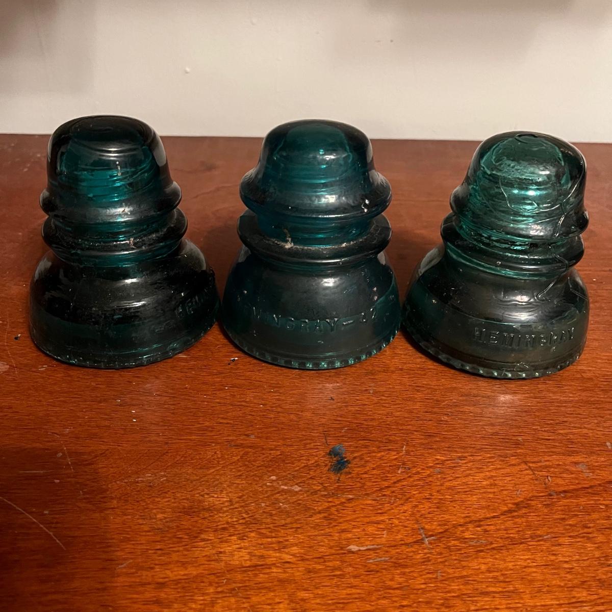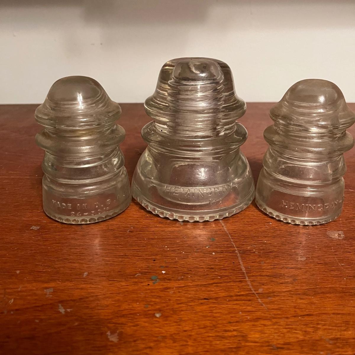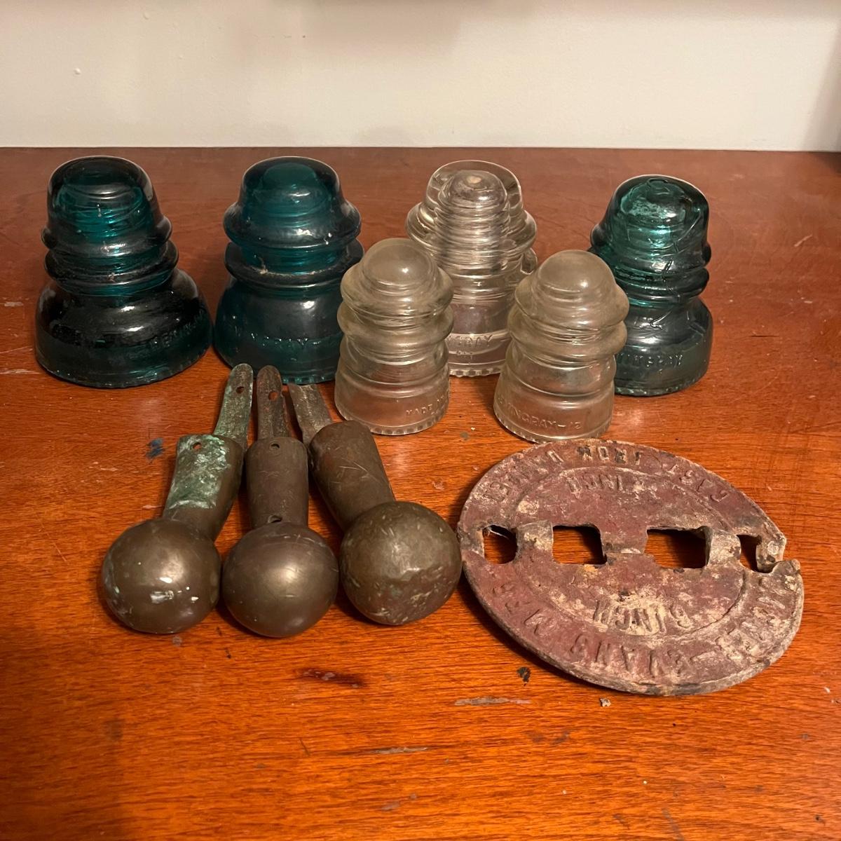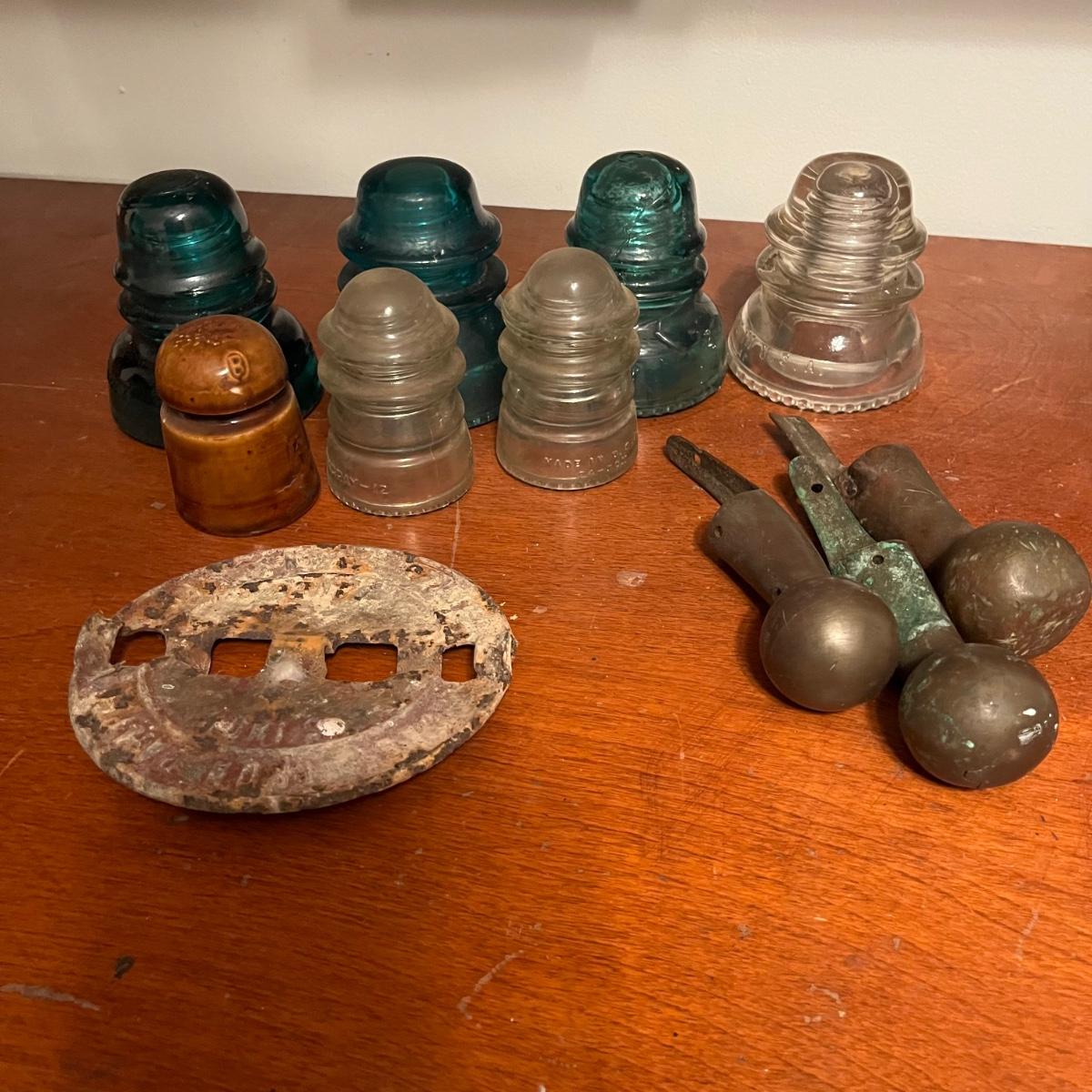 Lot includes three blue glass insulators, three clear glass insulators, ceramic insulator, three brass ball feet and a cast iron damper piece. Largest insulator measures 3.5”D x 4” tall.
