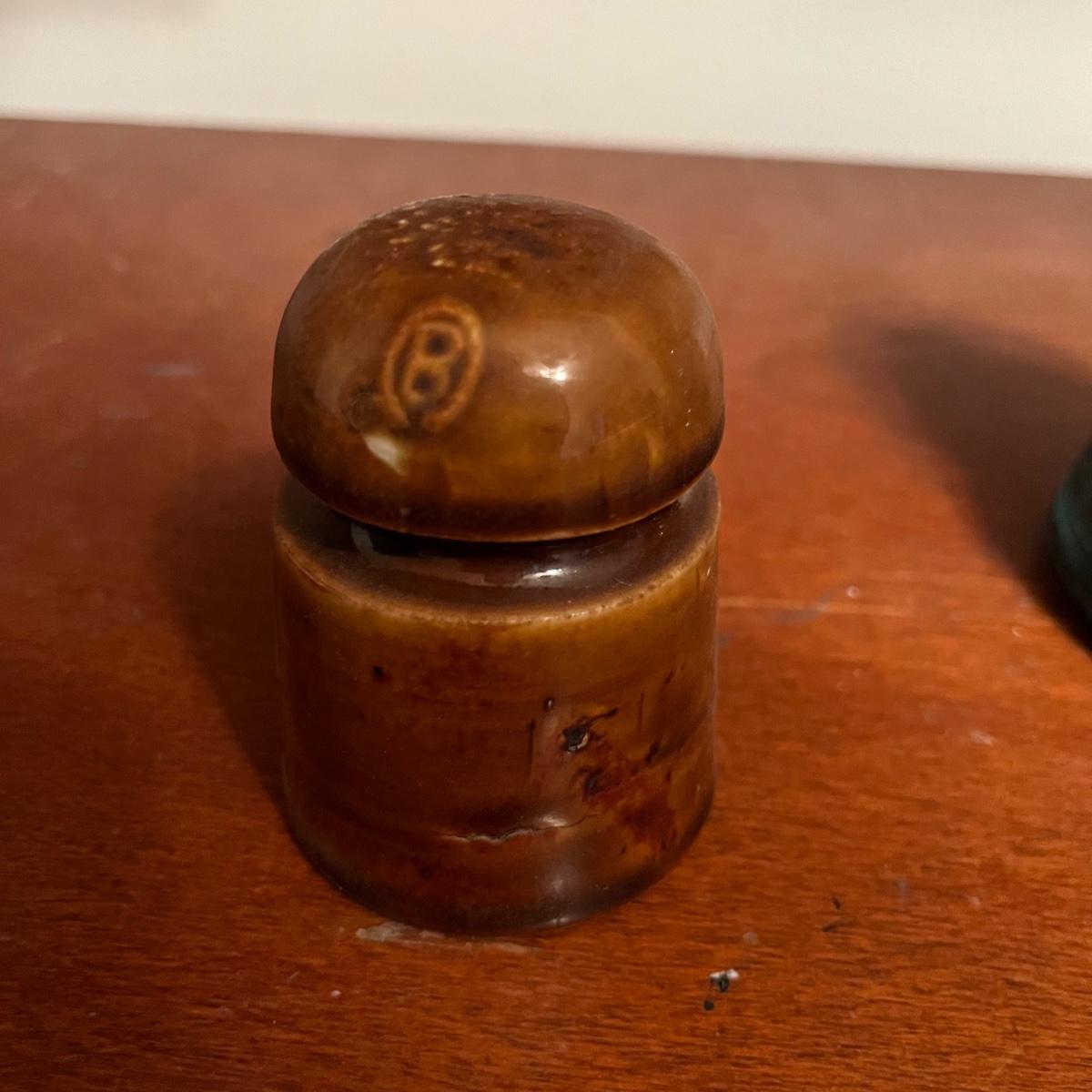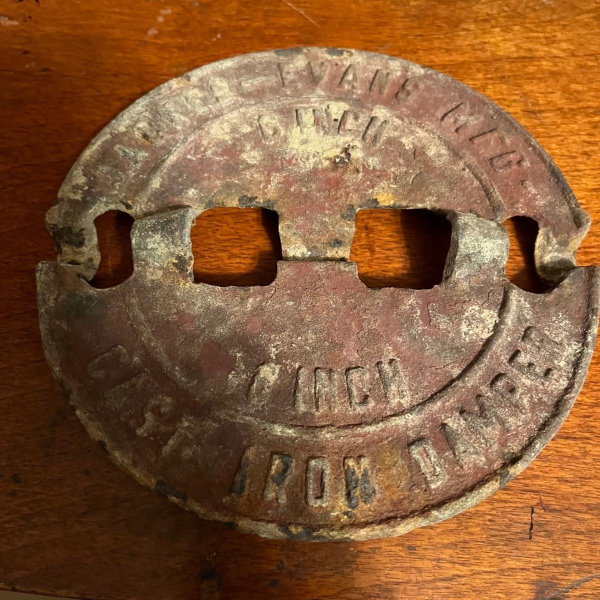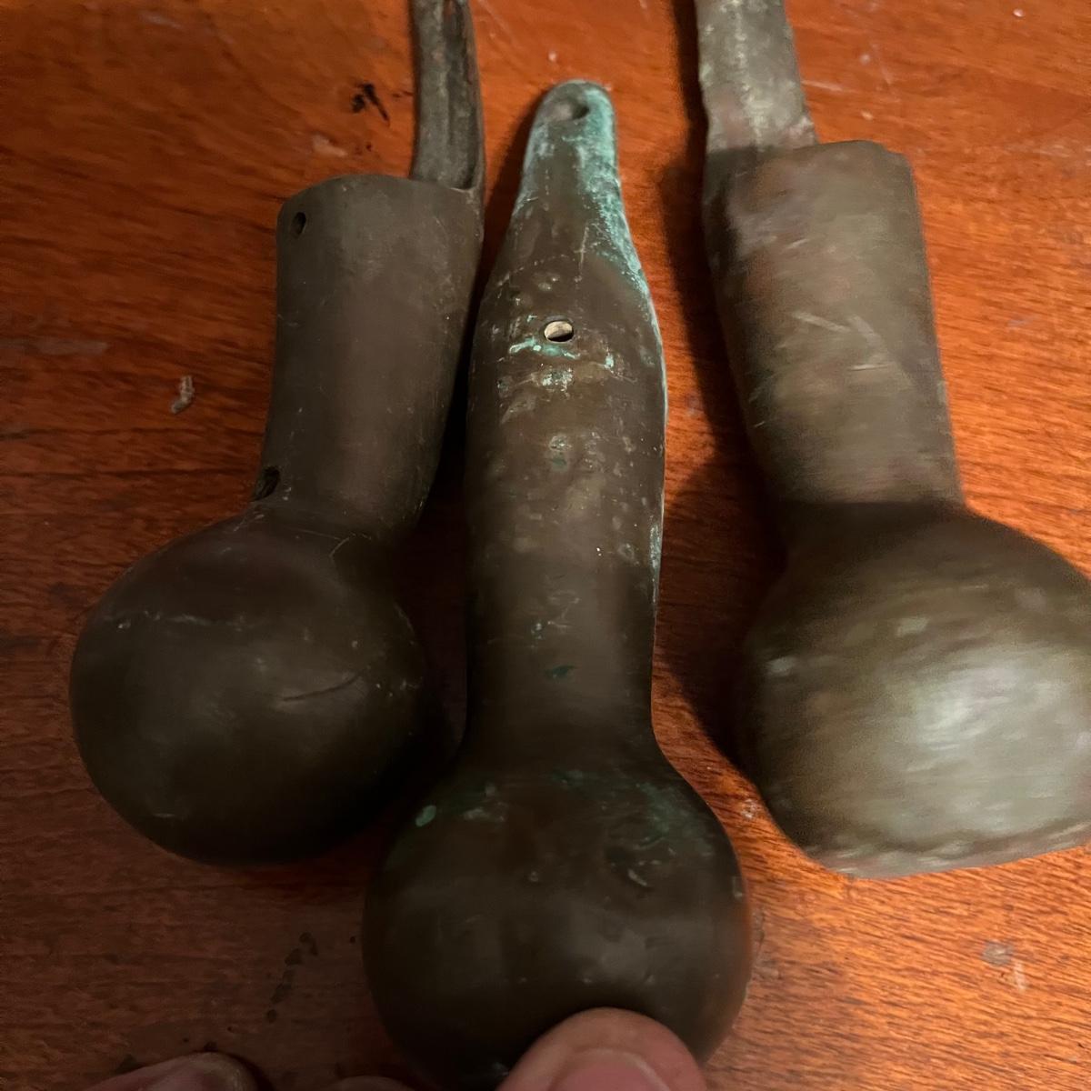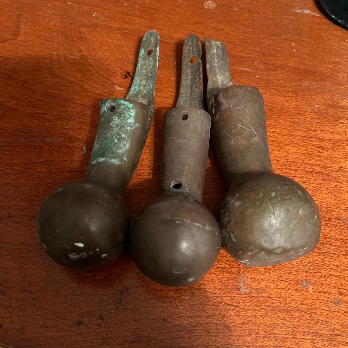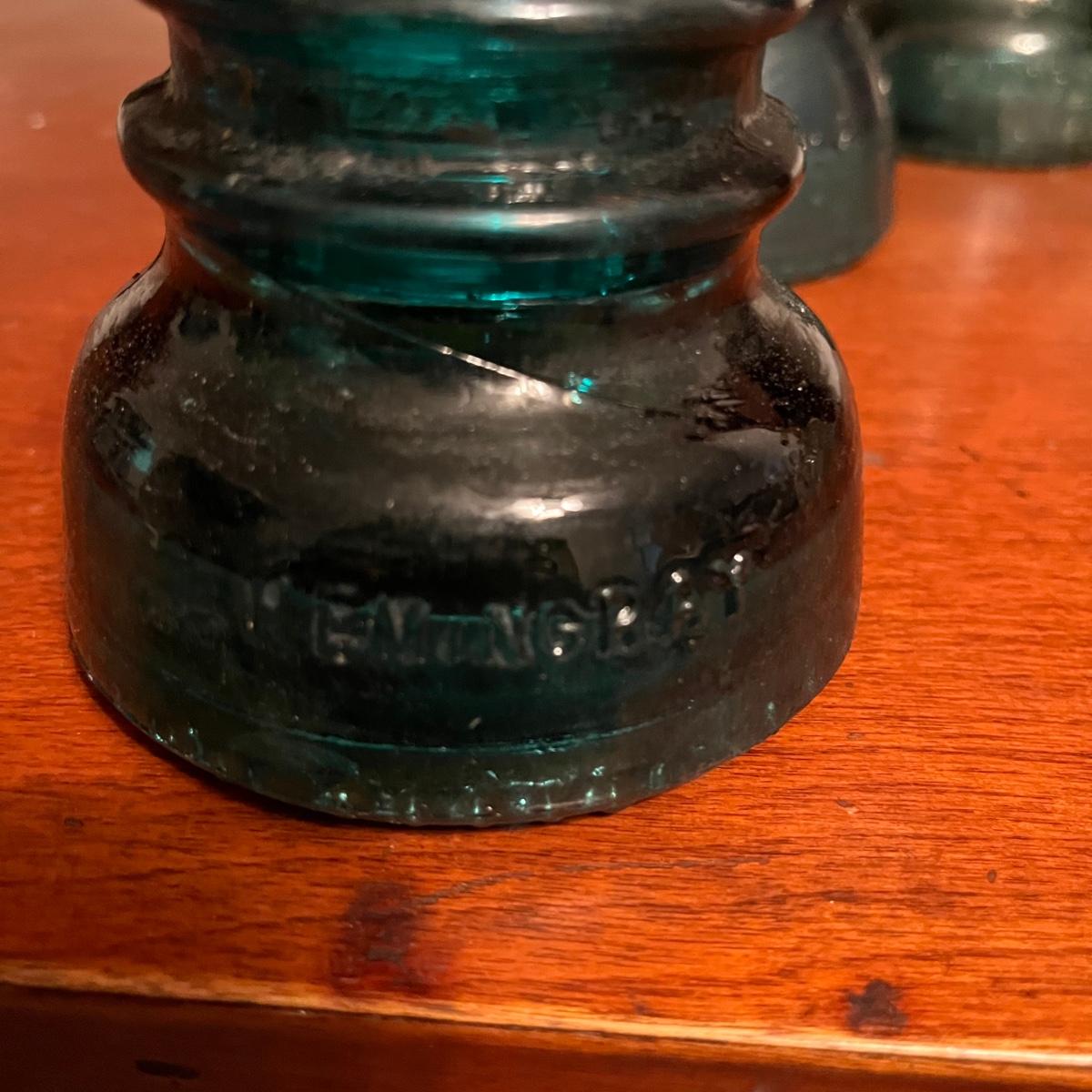 Lot includes three blue glass insulators, three clear glass insulators, ceramic insulator, three brass ball feet and a cast iron damper piece. Largest insulator measures 3.5”D x 4” tall.