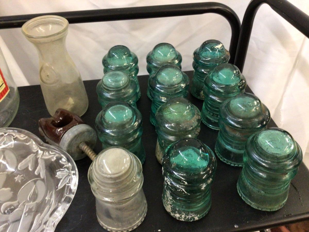 You get this great glass lot. Large pickle jar with lid, 11 blue glass insulators, 1 clear glass insulator and one pottery insulator. You also get a small glass milk bottle and a nice oval glass holiday tray with candles etched in it.