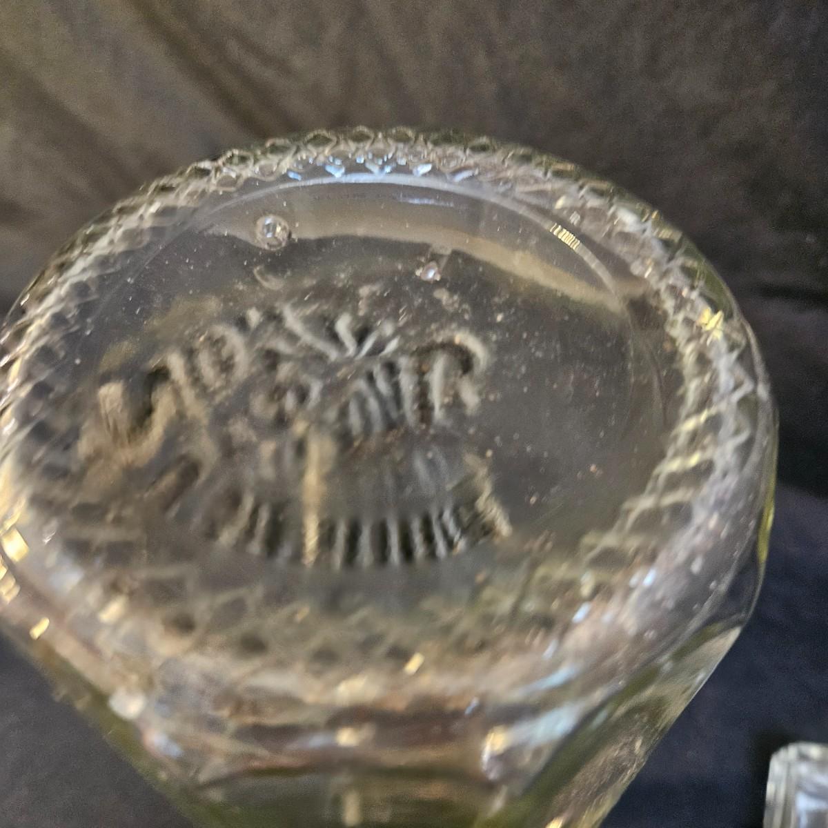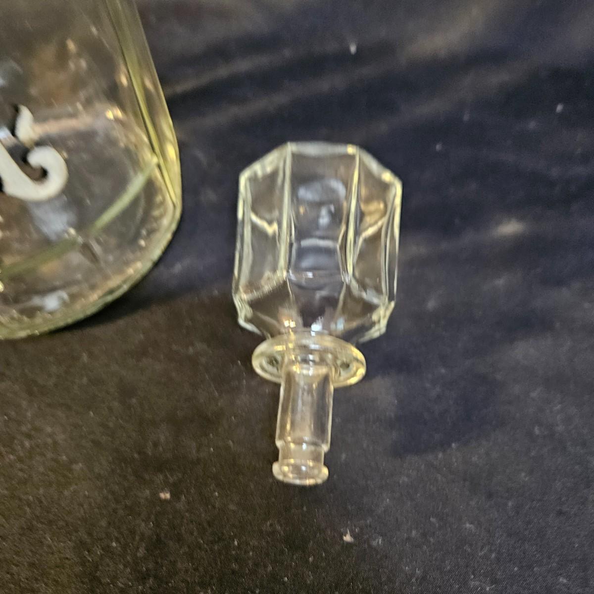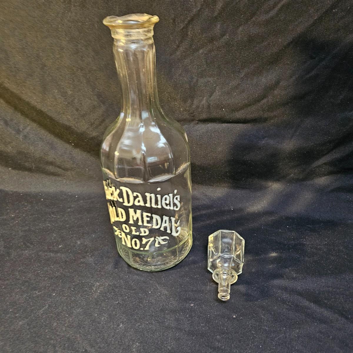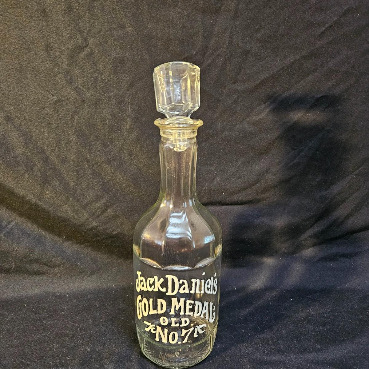 A glass decanter with Jack Daniel's Old No. 7 printed on it. It measures approximately 5"D x 15.5"H. The lid appears to missing a cork piece that would allow it to fit tightly, but could possibly be replaced. Otherwise, a great decor piece for the bar! Shipping available