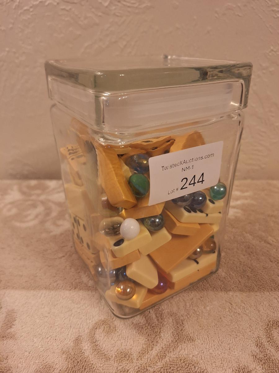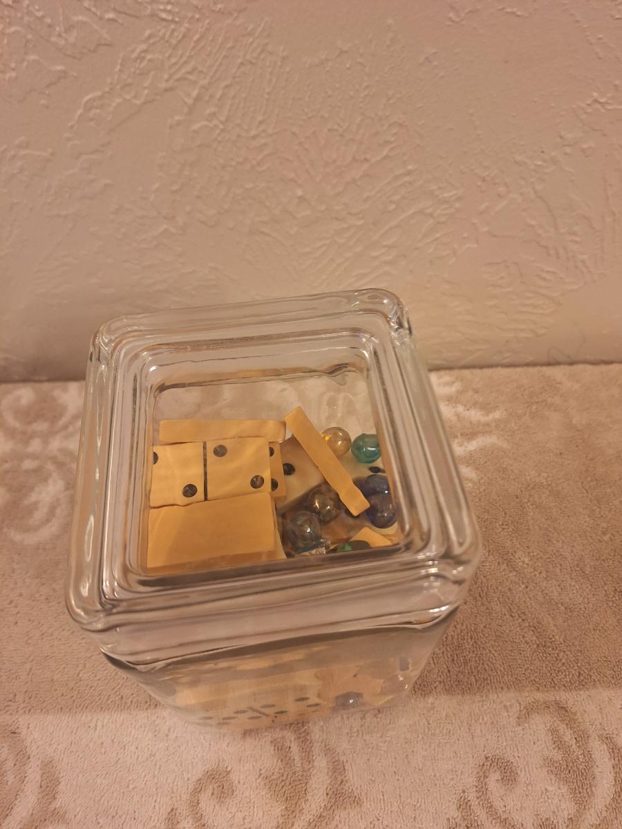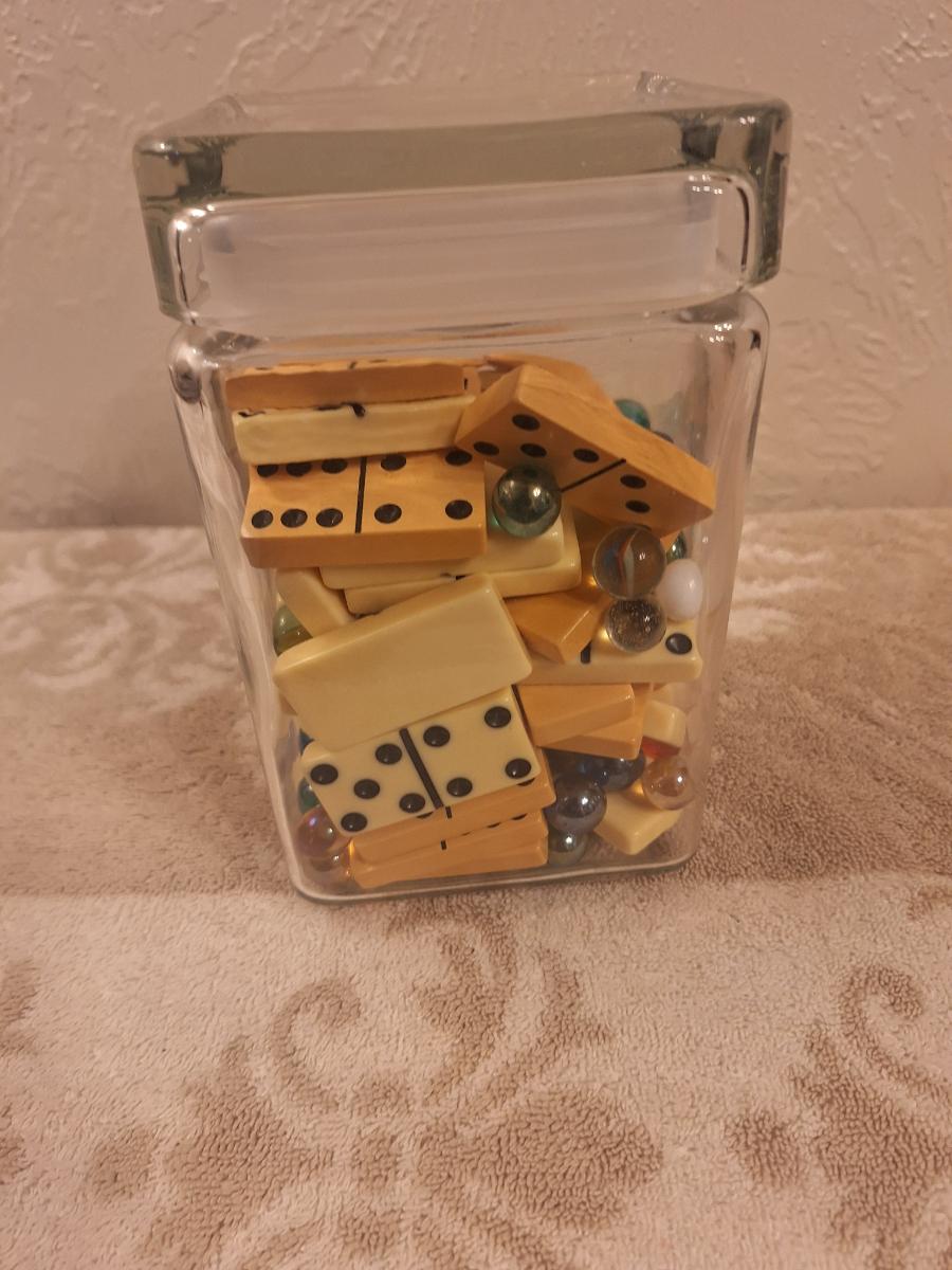 glass jar with 2 sets of dominoes and various glass beads or marbles