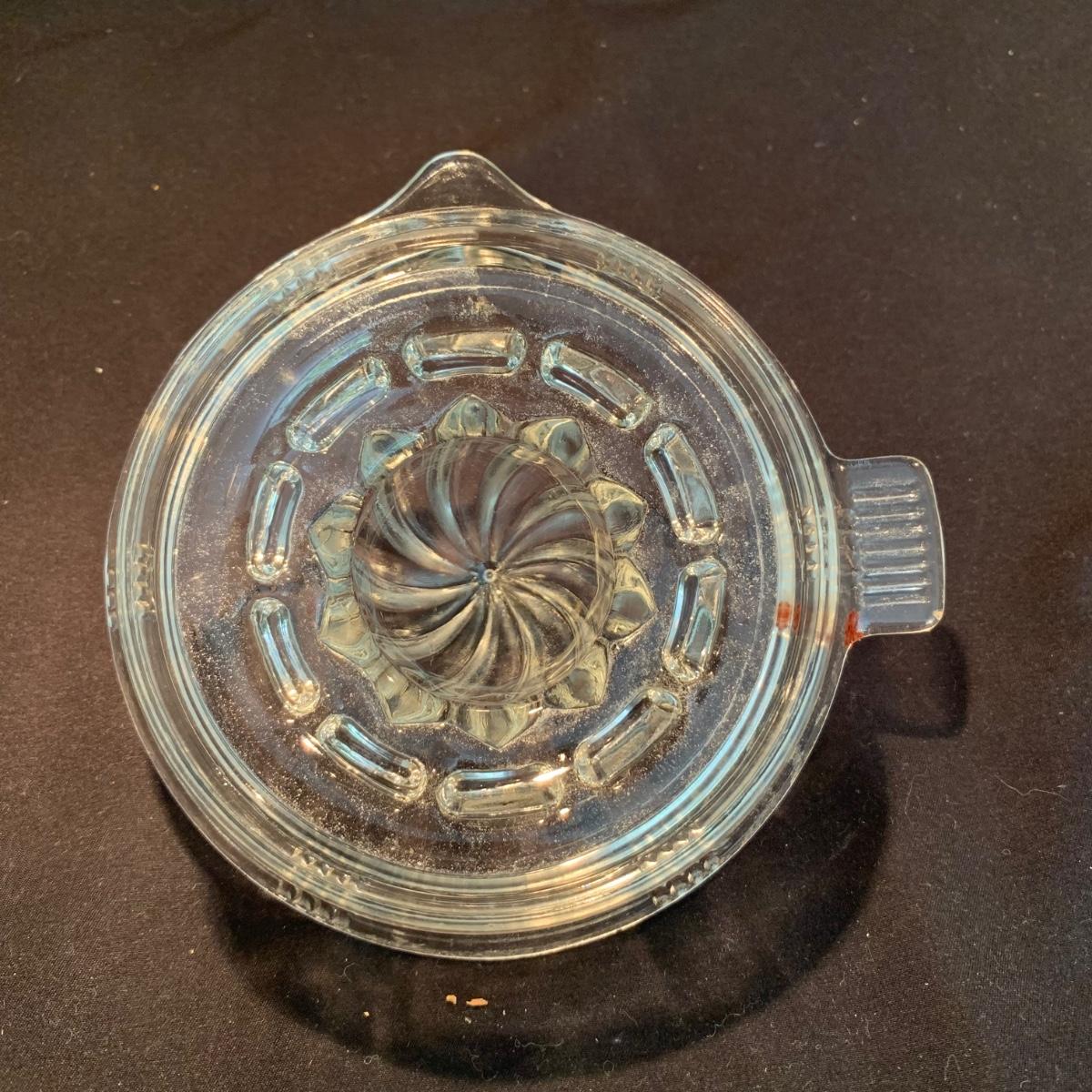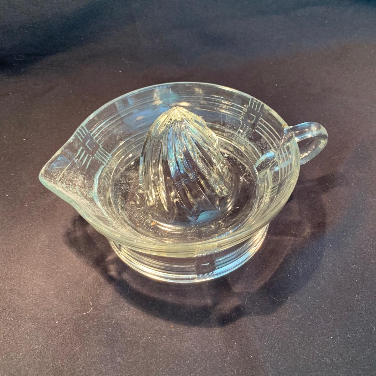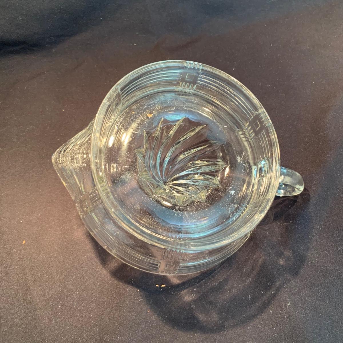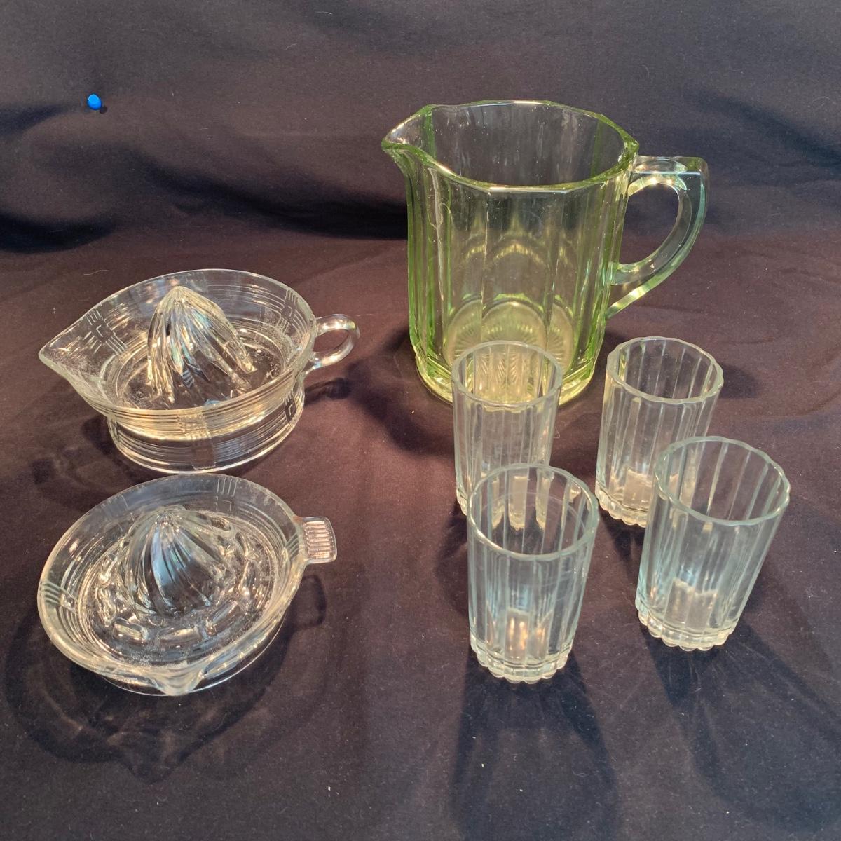 This lot includes a set of four glass cups, two glass lemon juicers, and a glass pitcher. All the pieces are in good condition but need to be cleaned and washed. The largest piece measures about 7in x 7.5in. Shipping available.