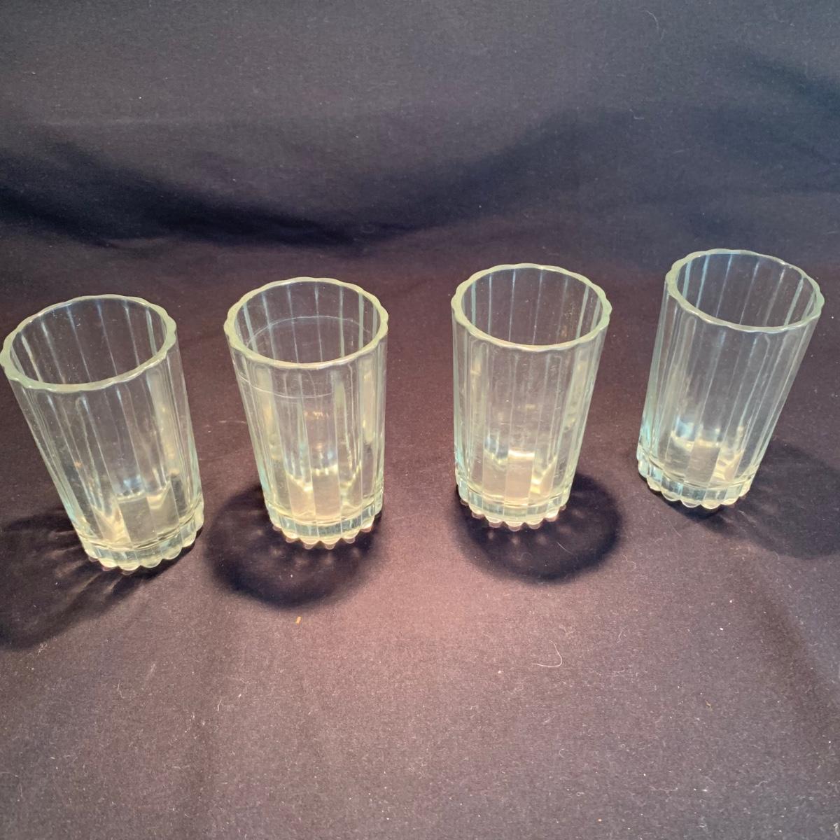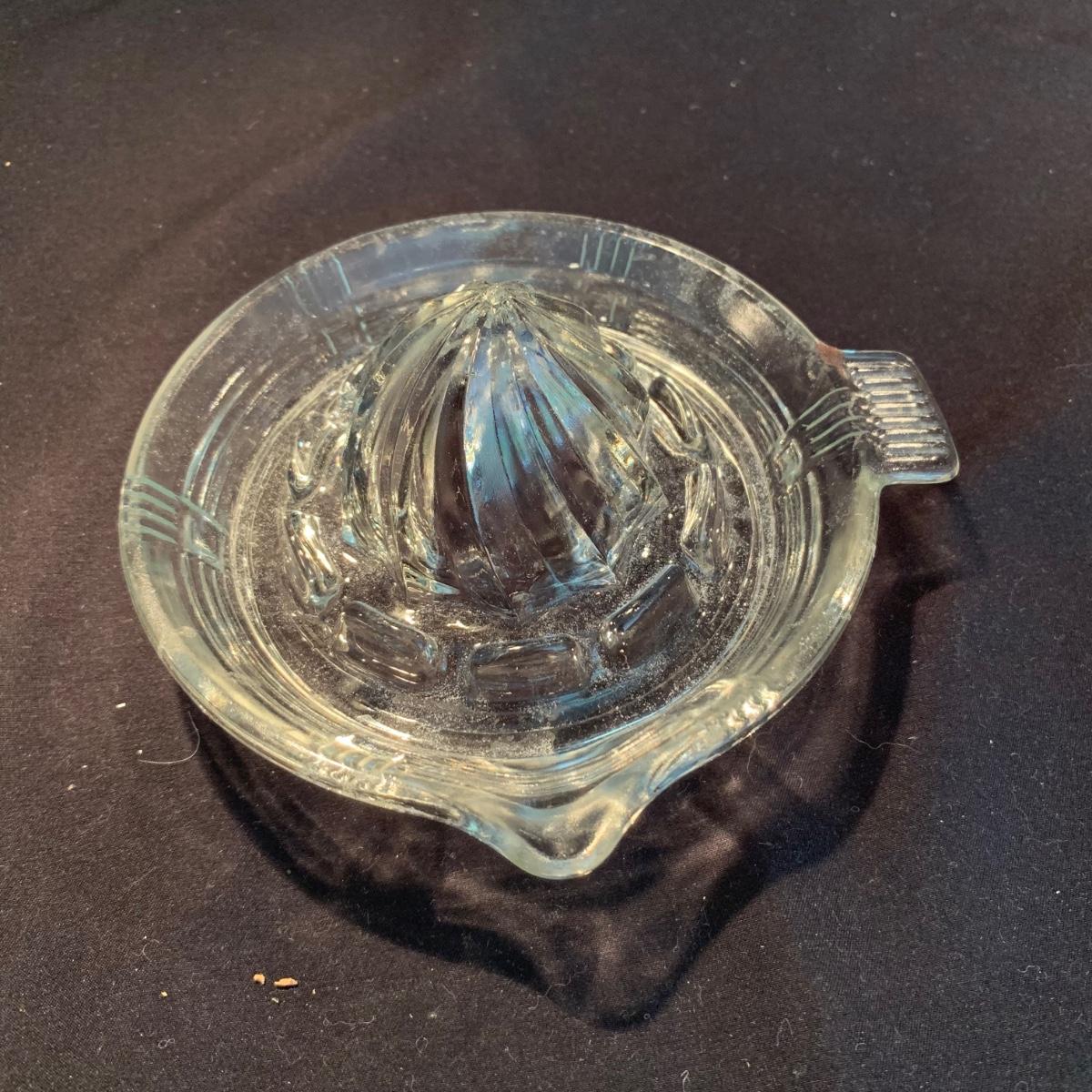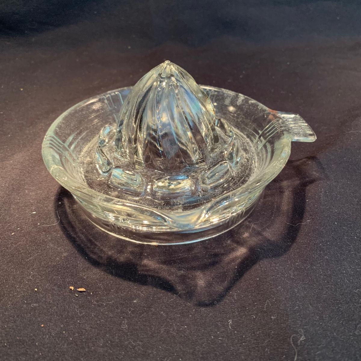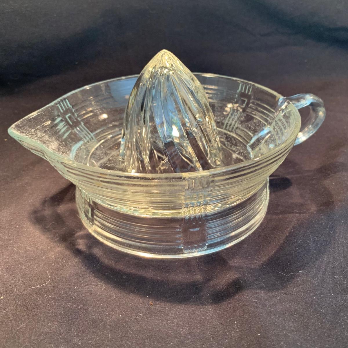 This lot includes a set of four glass cups, two glass lemon juicers, and a glass pitcher. All the pieces are in good condition but need to be cleaned and washed. The largest piece measures about 7in x 7.5in. Shipping available.
