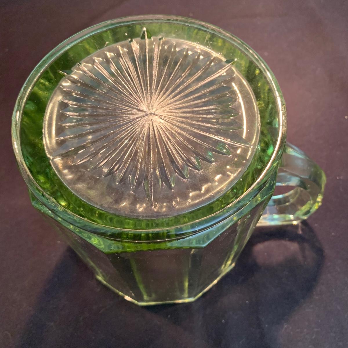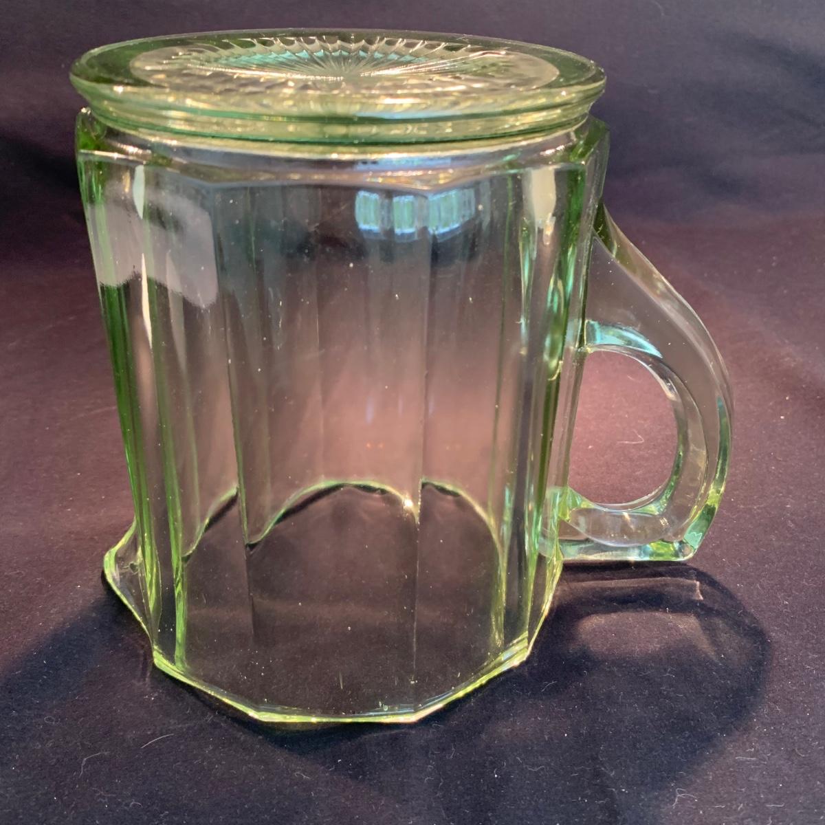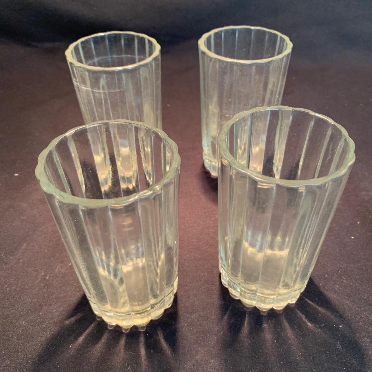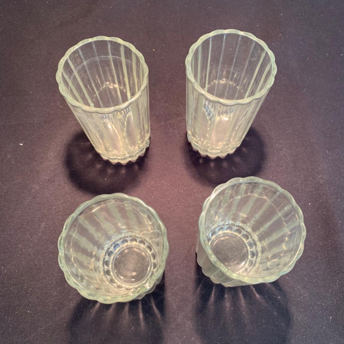 This lot includes a set of four glass cups, two glass lemon juicers, and a glass pitcher. All the pieces are in good condition but need to be cleaned and washed. The largest piece measures about 7in x 7.5in. Shipping available.