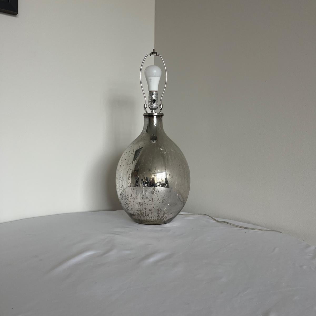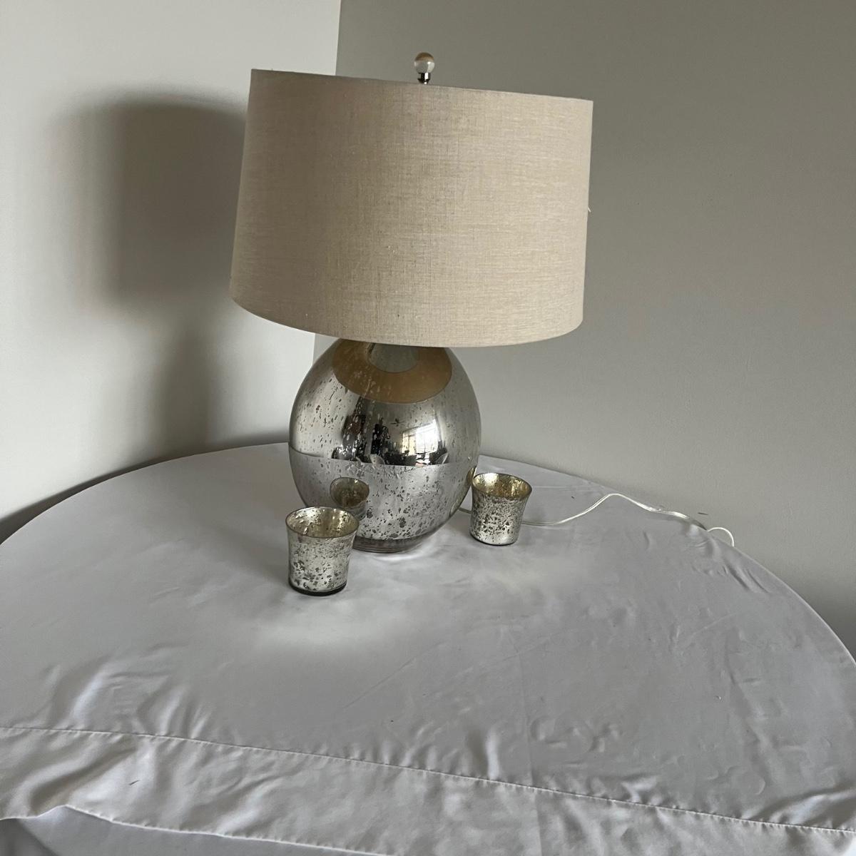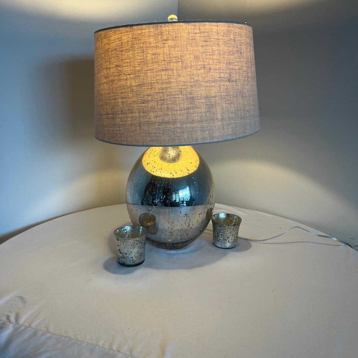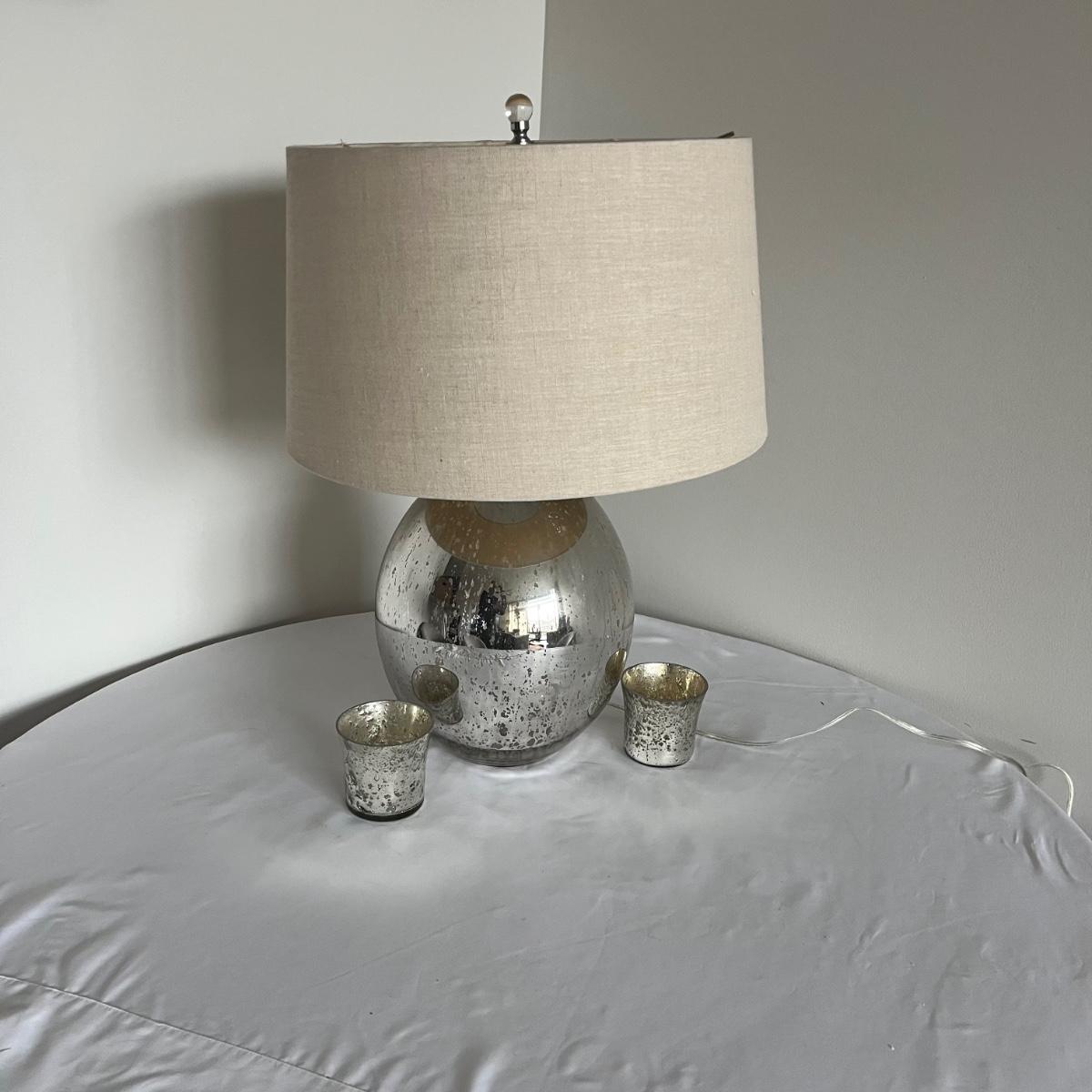 Lot includes a glass lamp with a speckled mirror like finish on the outer surface and similar candle holders. Lamp measures 9.5”D x 24” tall not including shade. Shade is cream colored and measures 15.5”D x 10” tall. Lamp worked when tested.