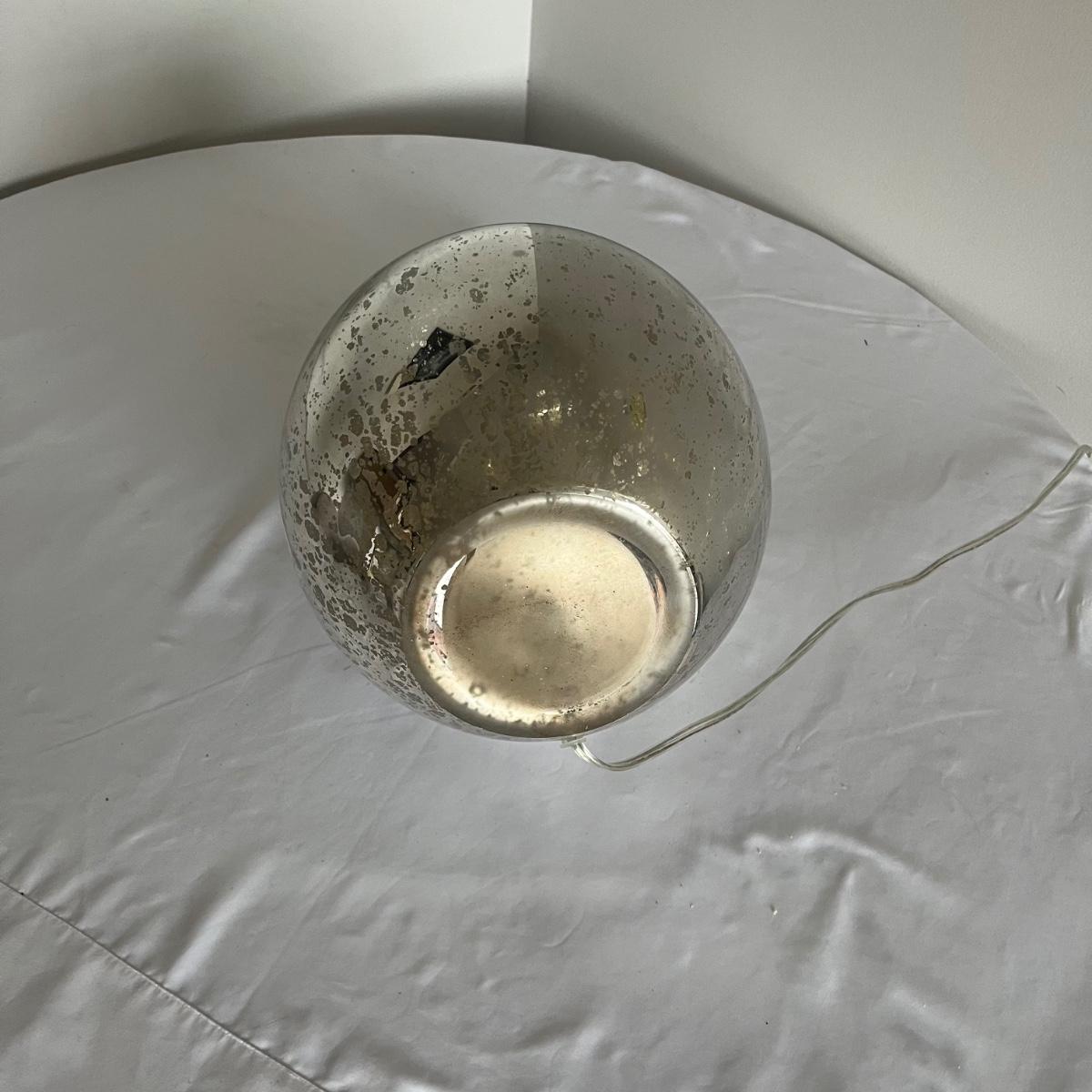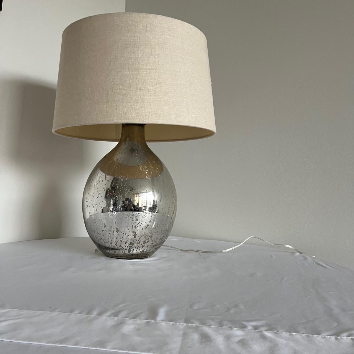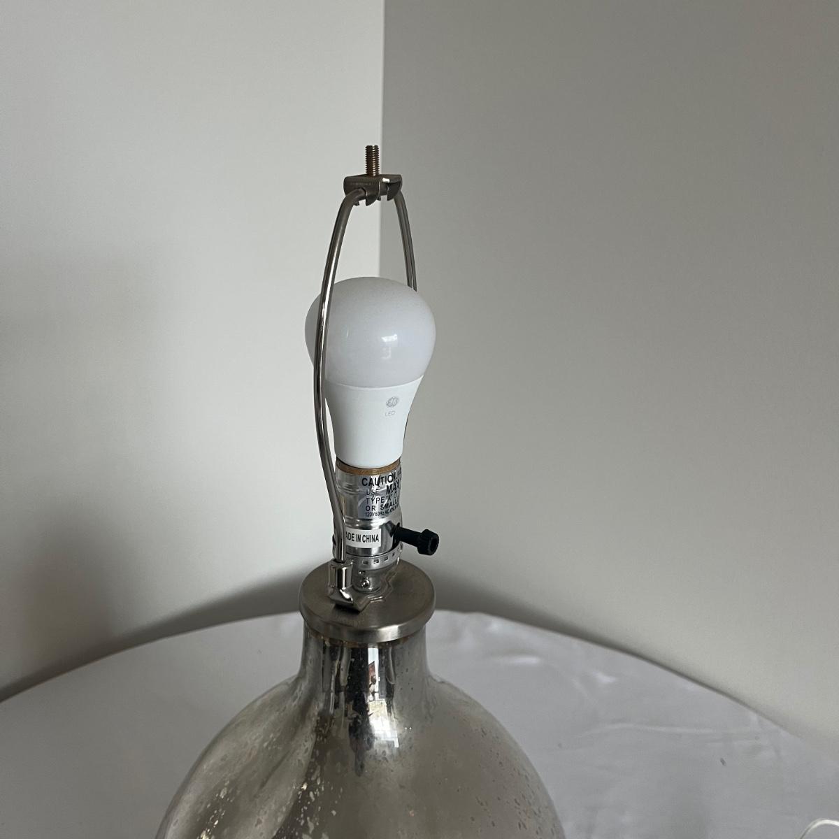 Lot includes a glass lamp with a speckled mirror like finish on the outer surface and similar candle holders. Lamp measures 9.5”D x 24” tall not including shade. Shade is cream colored and measures 15.5”D x 10” tall. Lamp worked when tested.