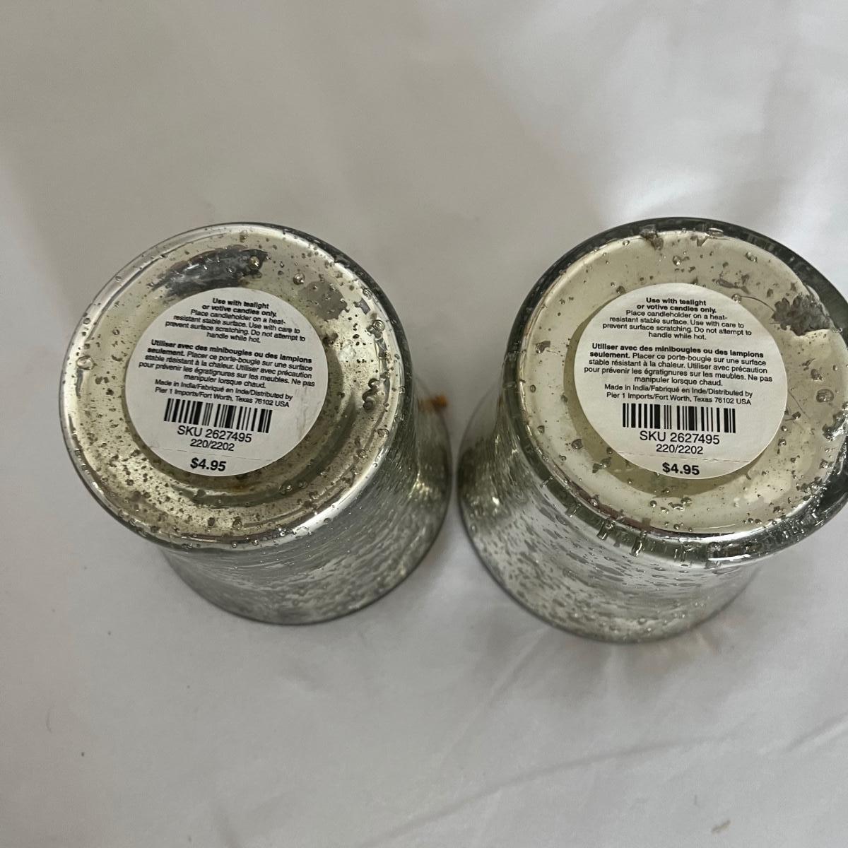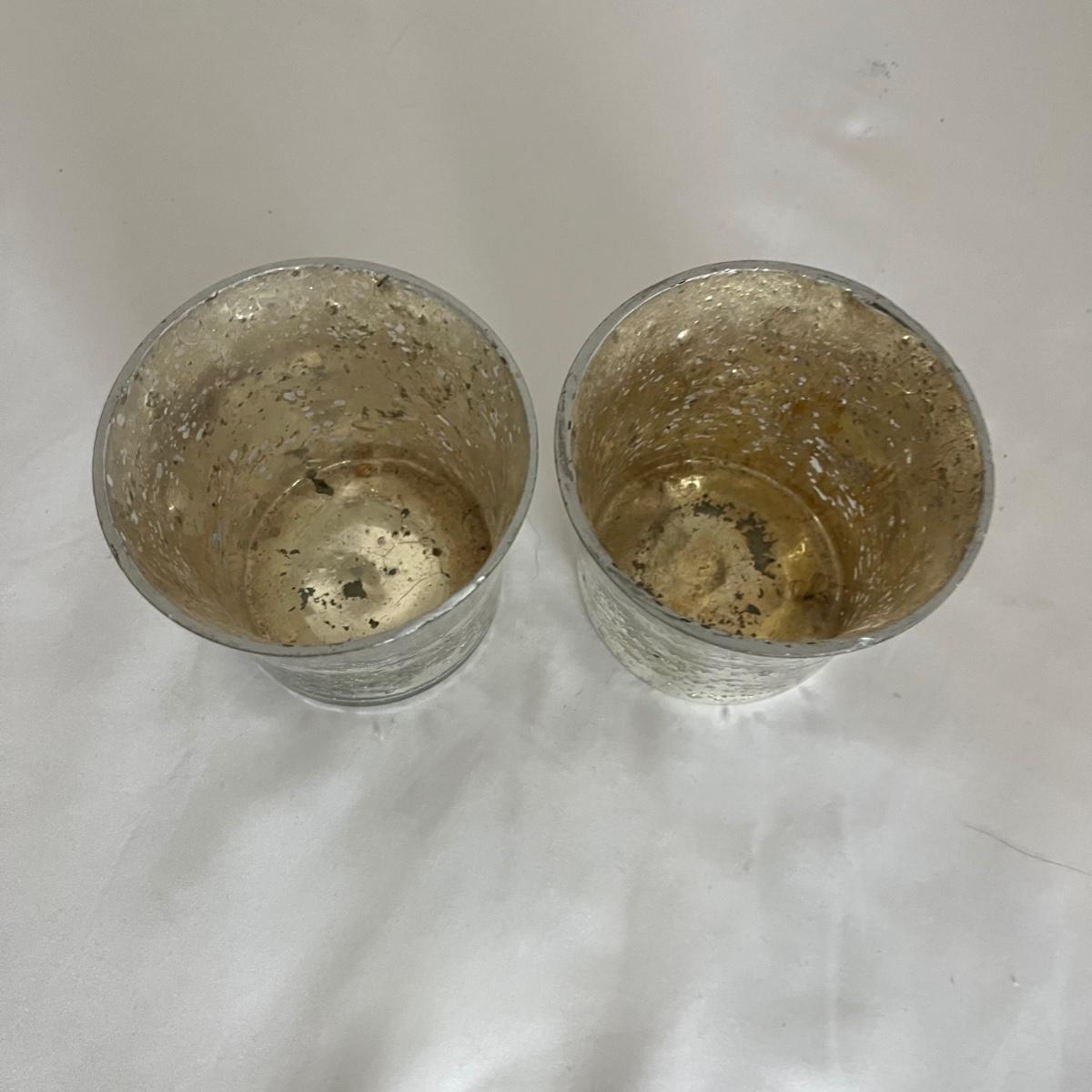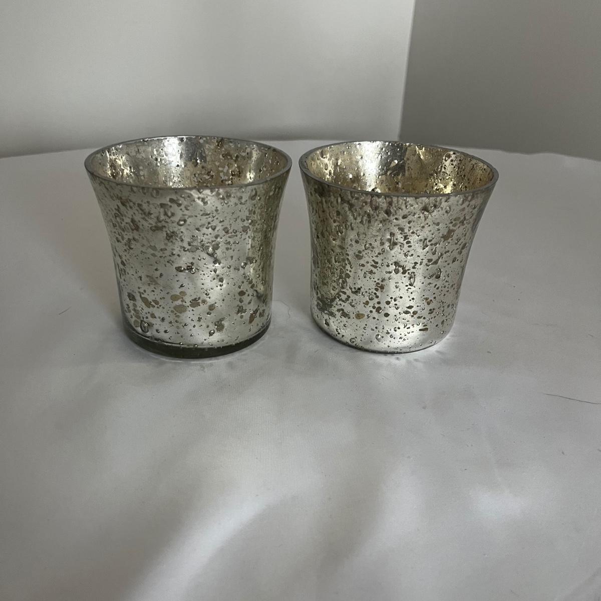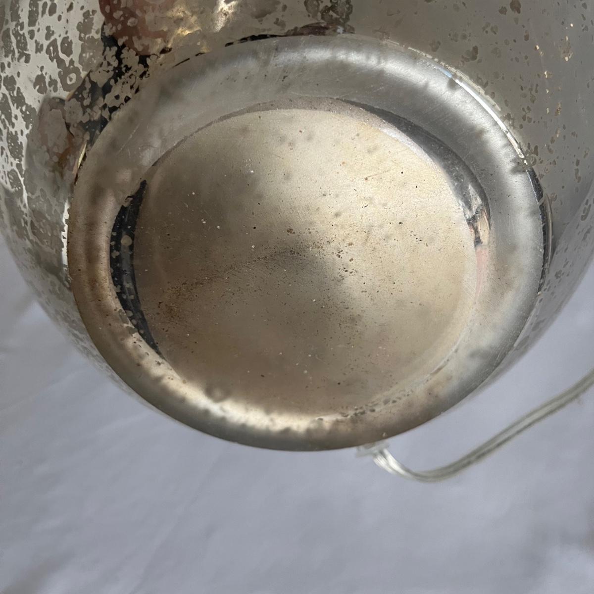 Lot includes a glass lamp with a speckled mirror like finish on the outer surface and similar candle holders. Lamp measures 9.5”D x 24” tall not including shade. Shade is cream colored and measures 15.5”D x 10” tall. Lamp worked when tested.