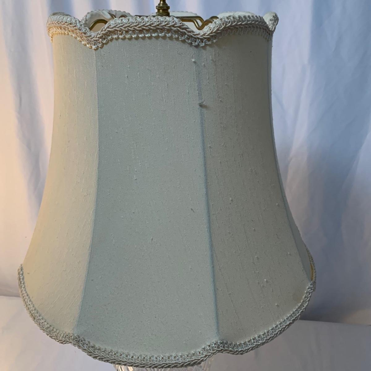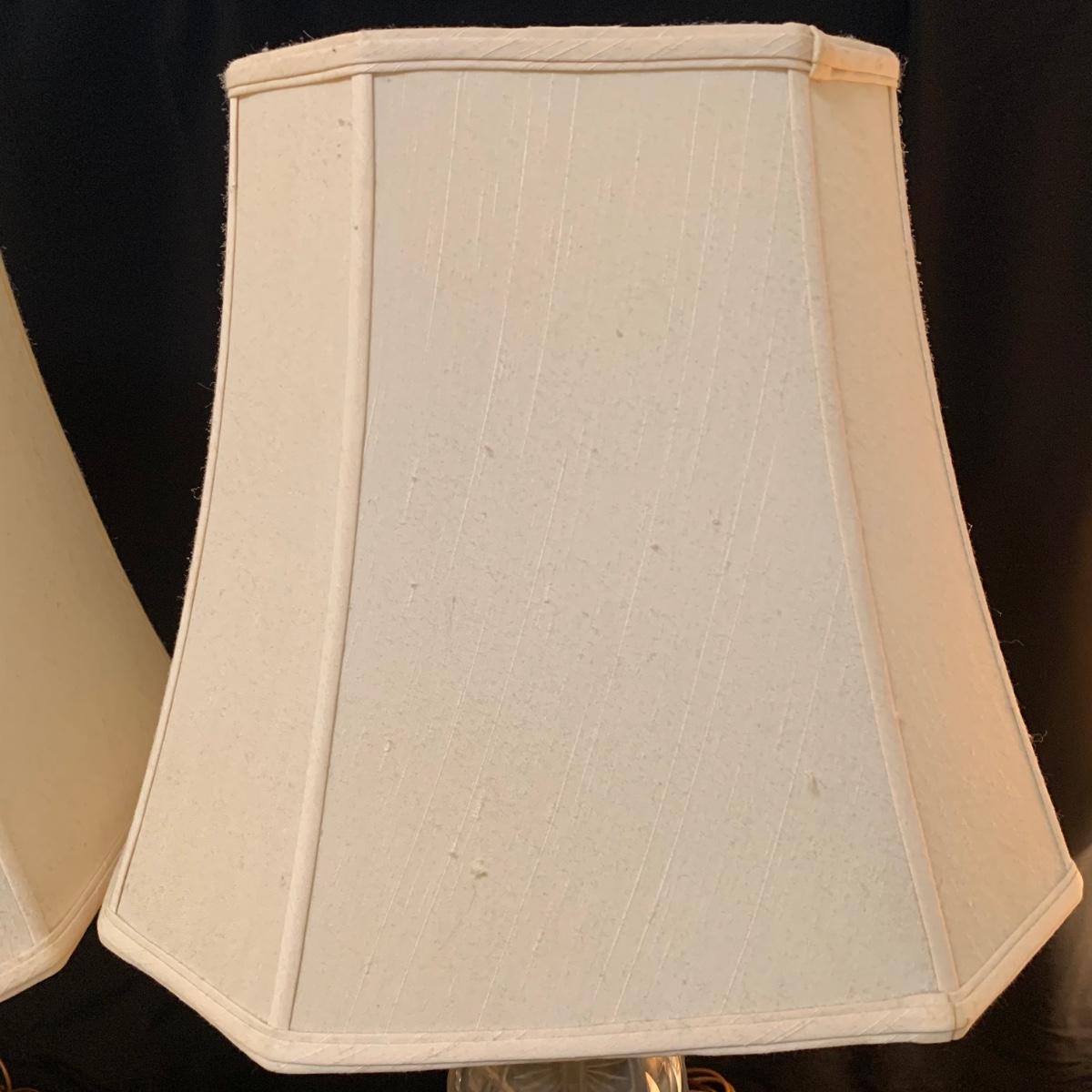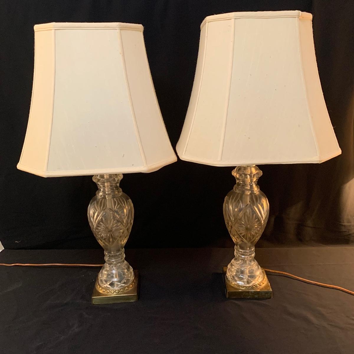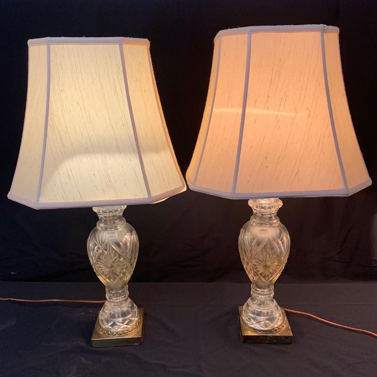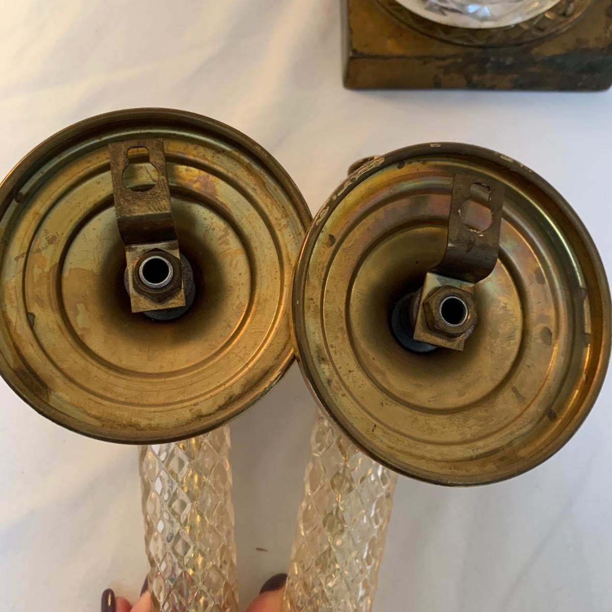 Lot includes three glass lamps and a pair of glass candle sconces. Two of the lamps are a matching set with brass-like bases and matching shades. One shade is in good condition, while the other needs to be fastened back onto the frame. With a little glue, it could be like new! See photos for details. Lamps themselves are in good condition. Lamp base measures 5.5”L x 5.5”W and the lamp is 32.5”H including the shade. A third similar lamp is also included. It also has a metal base and cream colored shade. It has a lovely crystal finial. Lamp is just a little shorter than the other two. All three turned on when tested. The sconces have metal bases with glass hurricanes and lower glass decor. Note the split in the metal on one sconce. It is not visible from the front.