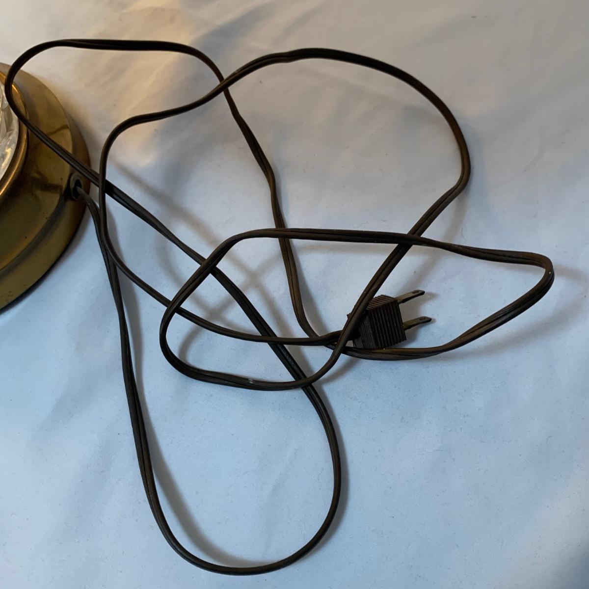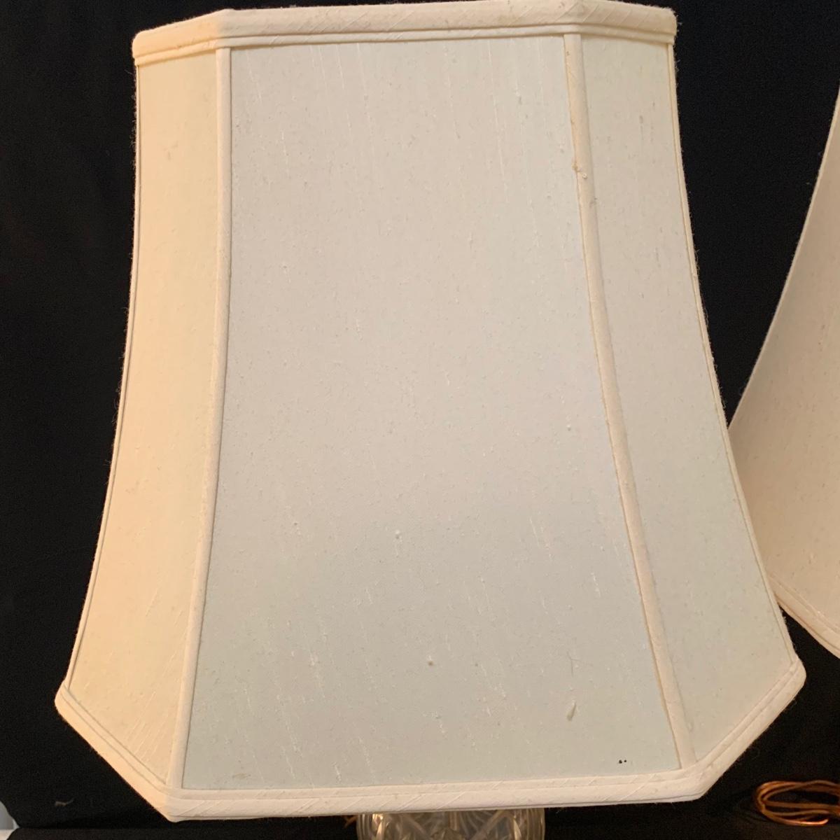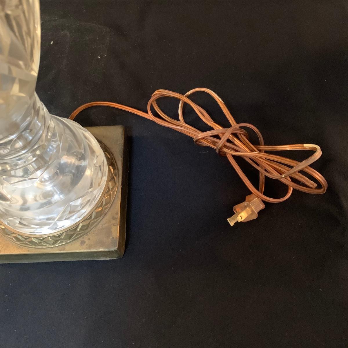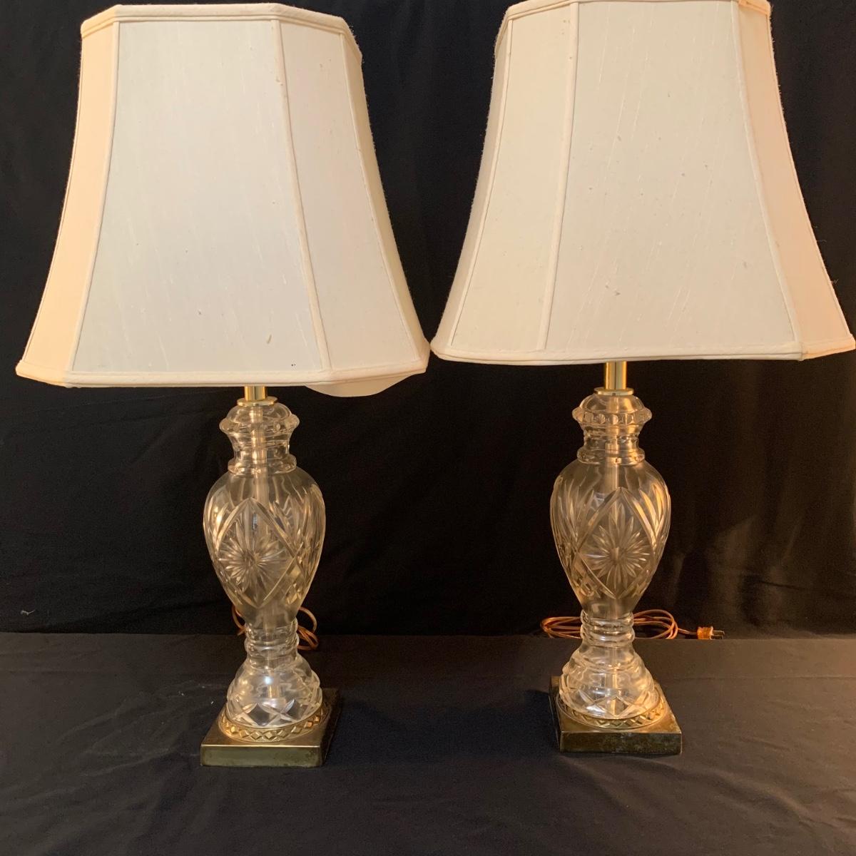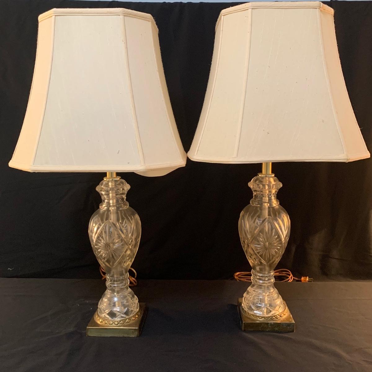Lot includes three glass lamps and a pair of glass candle sconces. Two of the lamps are a matching set with brass-like bases and matching shades. One shade is in good condition, while the other needs to be fastened back onto the frame. With a little glue, it could be like new! See photos for details. Lamps themselves are in good condition. Lamp base measures 5.5”L x 5.5”W and the lamp is 32.5”H including the shade. A third similar lamp is also included. It also has a metal base and cream colored shade. It has a lovely crystal finial. Lamp is just a little shorter than the other two. All three turned on when tested. The sconces have metal bases with glass hurricanes and lower glass decor. Note the split in the metal on one sconce. It is not visible from the front.