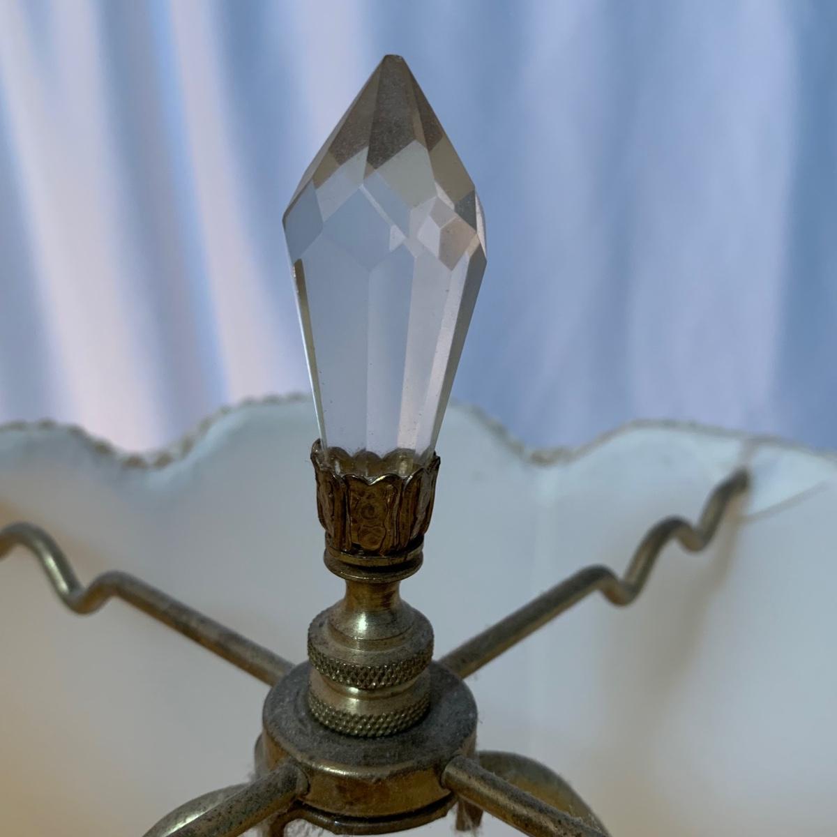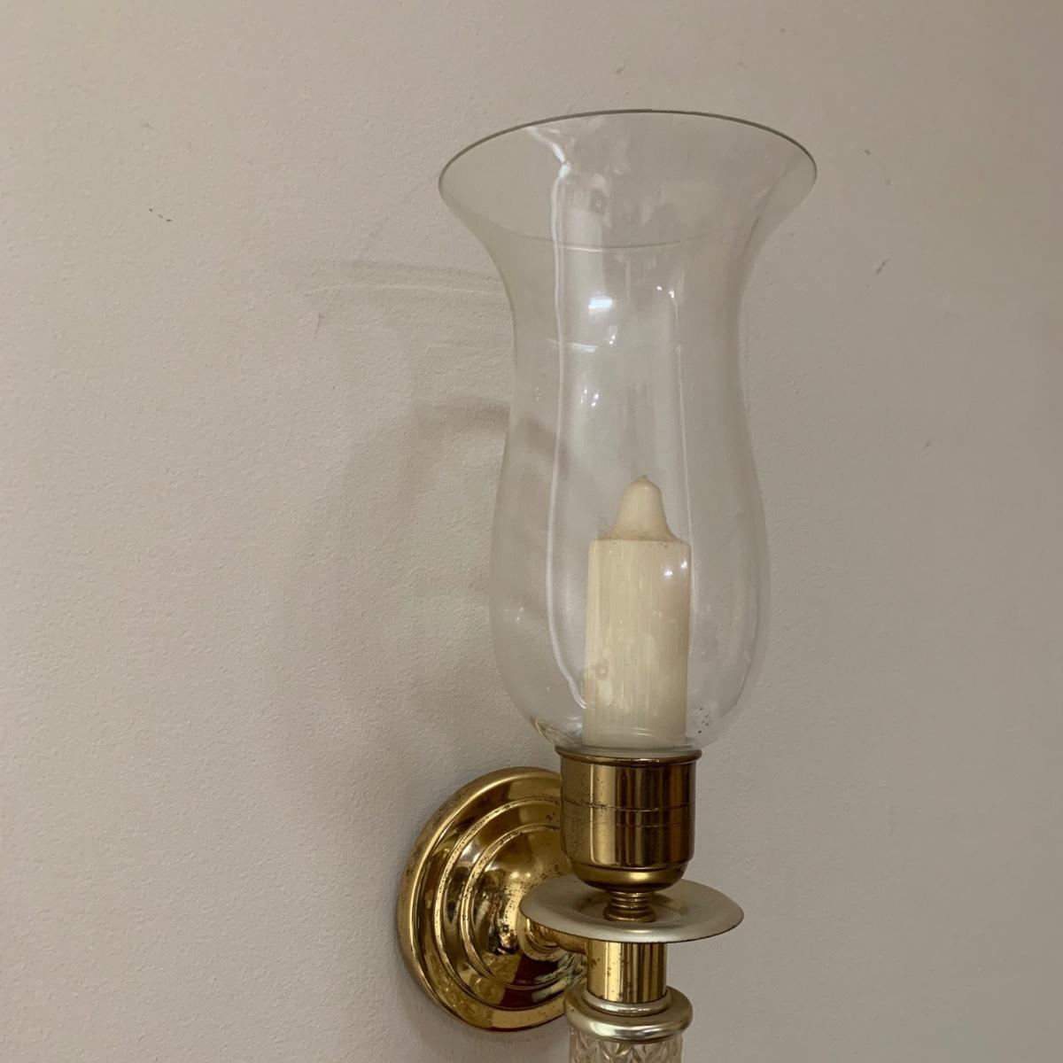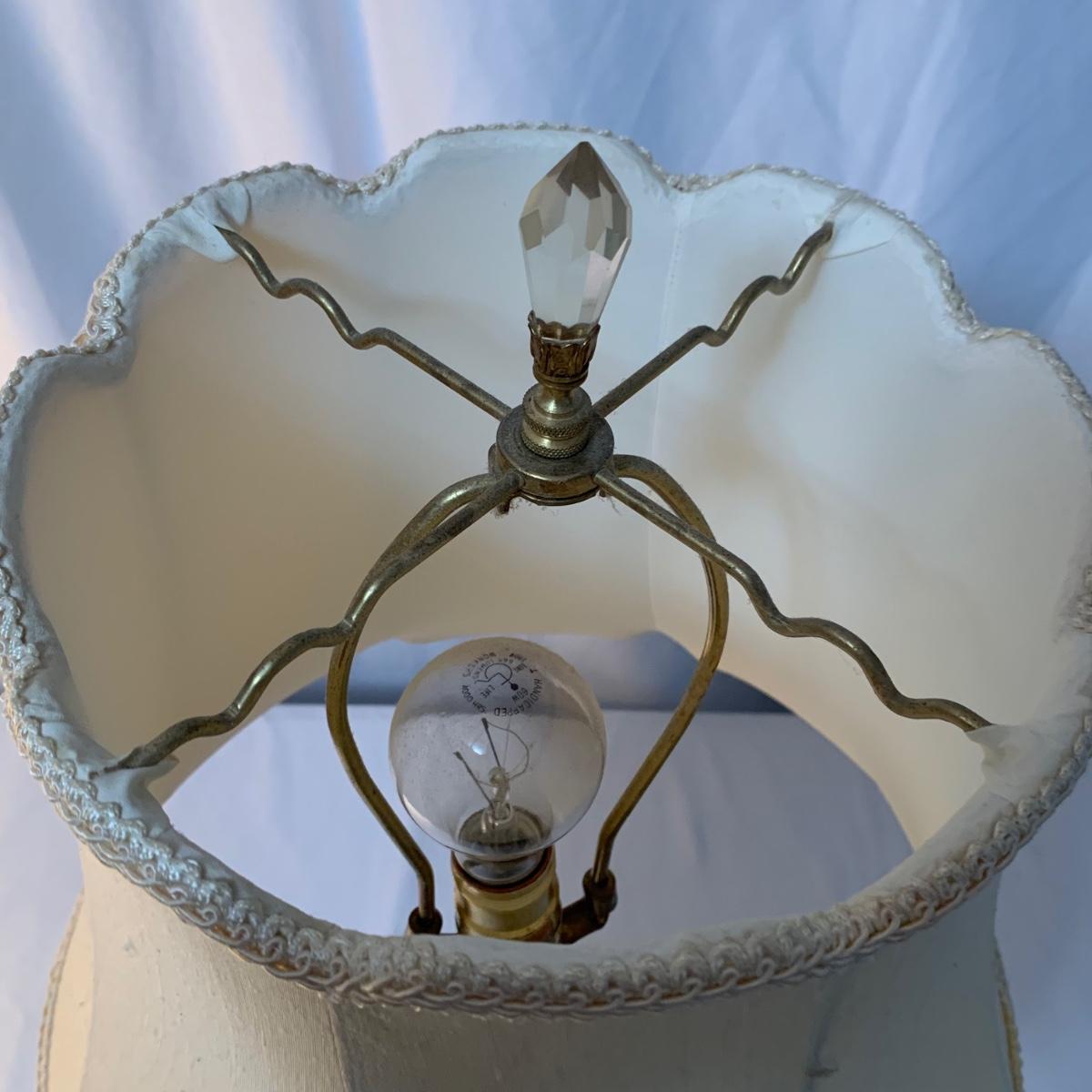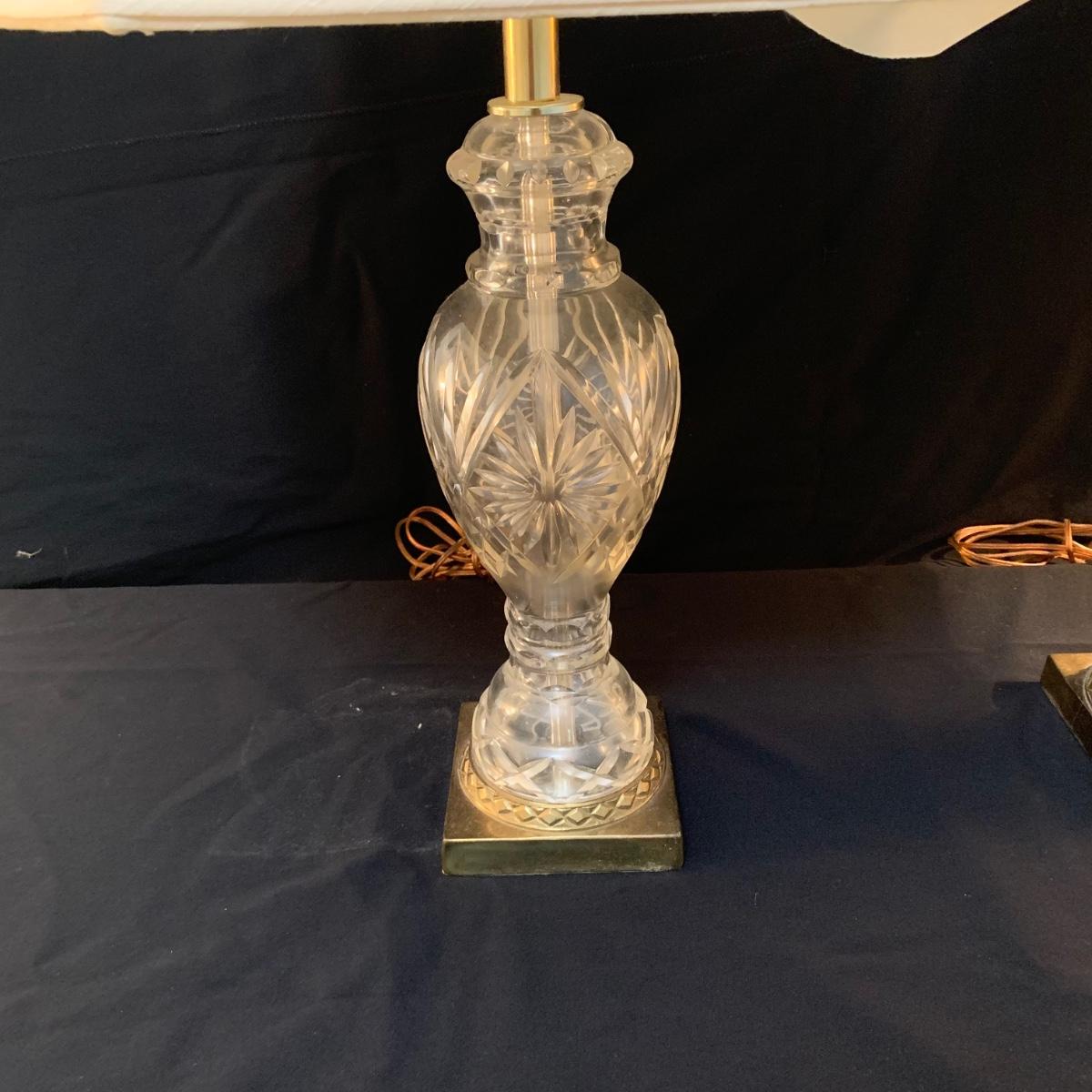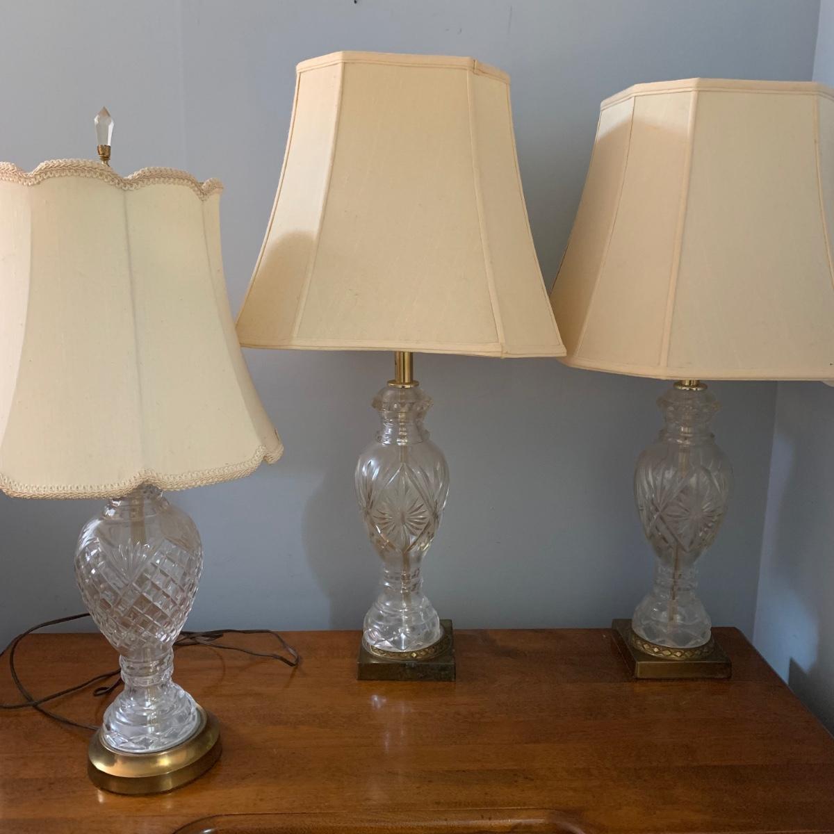 Lot includes three glass lamps and a pair of glass candle sconces. Two of the lamps are a matching set with brass-like bases and matching shades. One shade is in good condition, while the other needs to be fastened back onto the frame. With a little glue, it could be like new! See photos for details. Lamps themselves are in good condition. Lamp base measures 5.5”L x 5.5”W and the lamp is 32.5”H including the shade. A third similar lamp is also included. It also has a metal base and cream colored shade. It has a lovely crystal finial. Lamp is just a little shorter than the other two. All three turned on when tested. The sconces have metal bases with glass hurricanes and lower glass decor. Note the split in the metal on one sconce. It is not visible from the front.