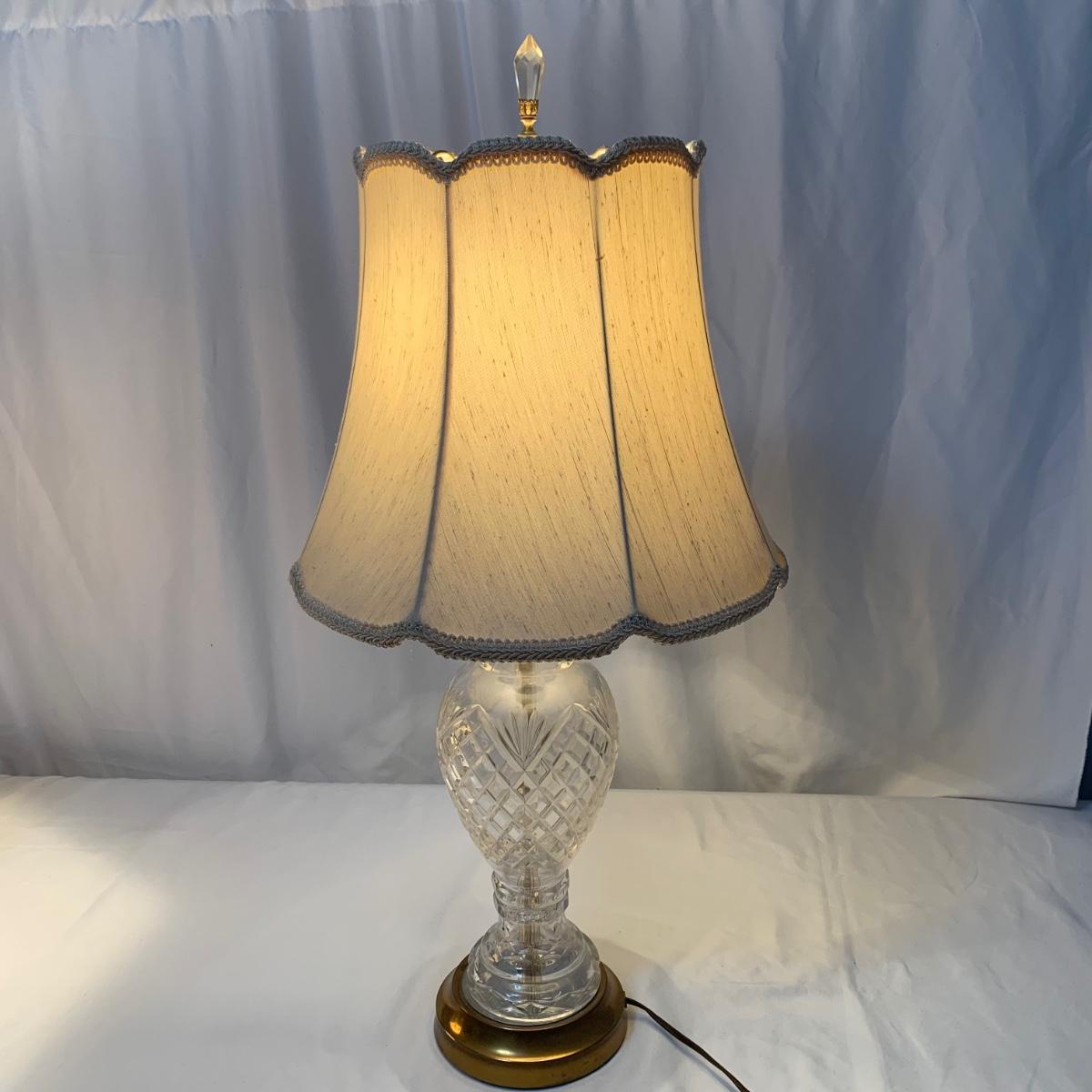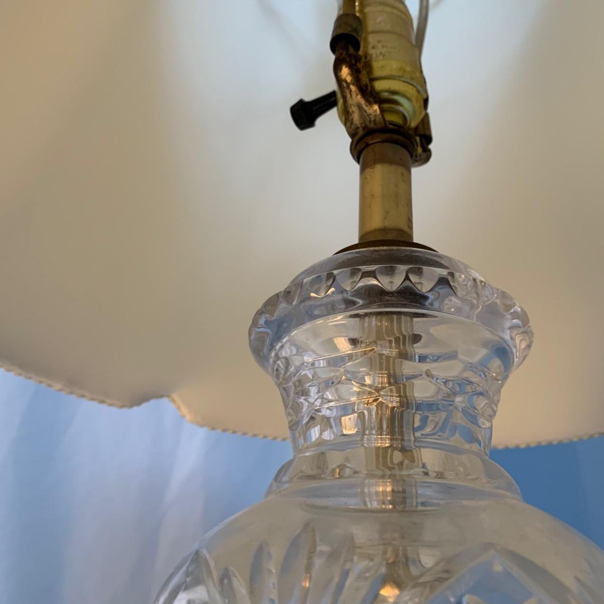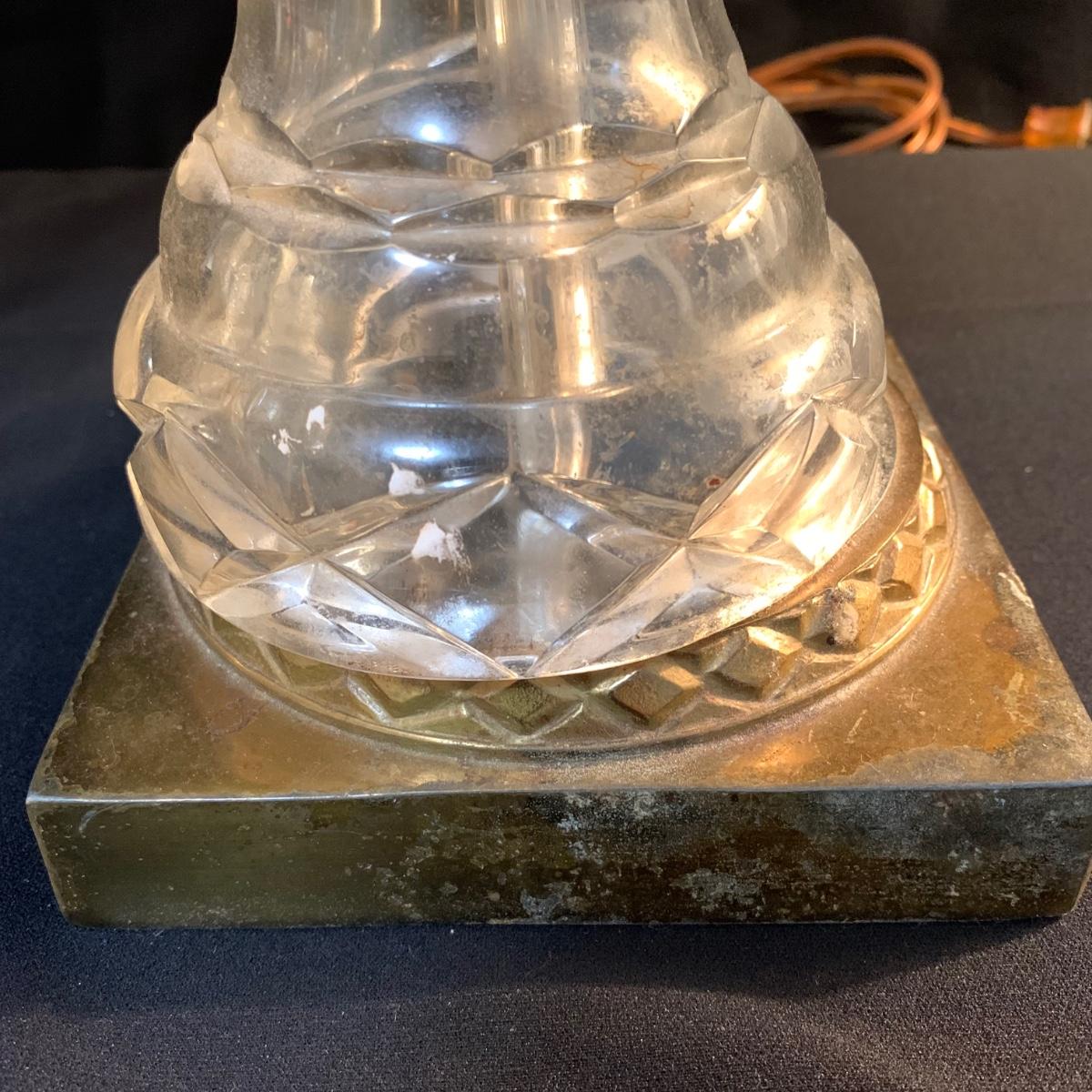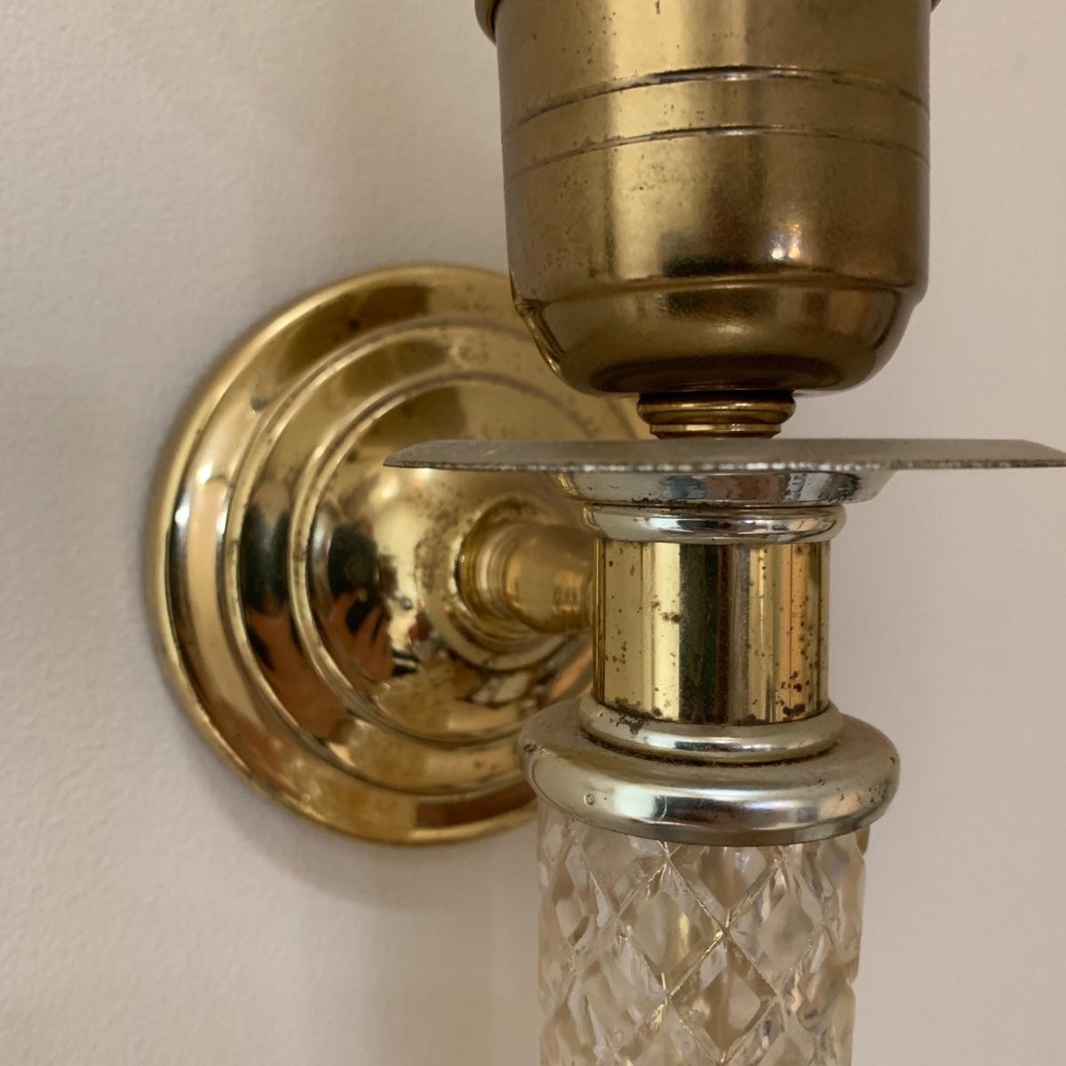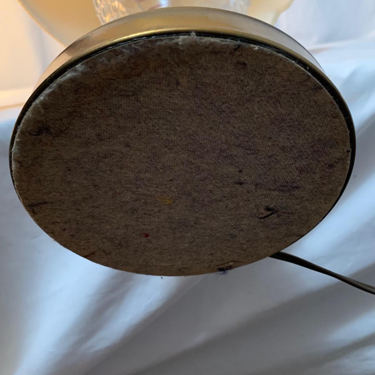 Lot includes three glass lamps and a pair of glass candle sconces. Two of the lamps are a matching set with brass-like bases and matching shades. One shade is in good condition, while the other needs to be fastened back onto the frame. With a little glue, it could be like new! See photos for details. Lamps themselves are in good condition. Lamp base measures 5.5”L x 5.5”W and the lamp is 32.5”H including the shade. A third similar lamp is also included. It also has a metal base and cream colored shade. It has a lovely crystal finial. Lamp is just a little shorter than the other two. All three turned on when tested. The sconces have metal bases with glass hurricanes and lower glass decor. Note the split in the metal on one sconce. It is not visible from the front.