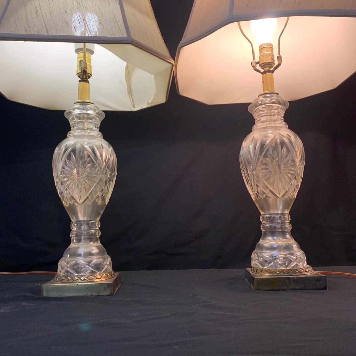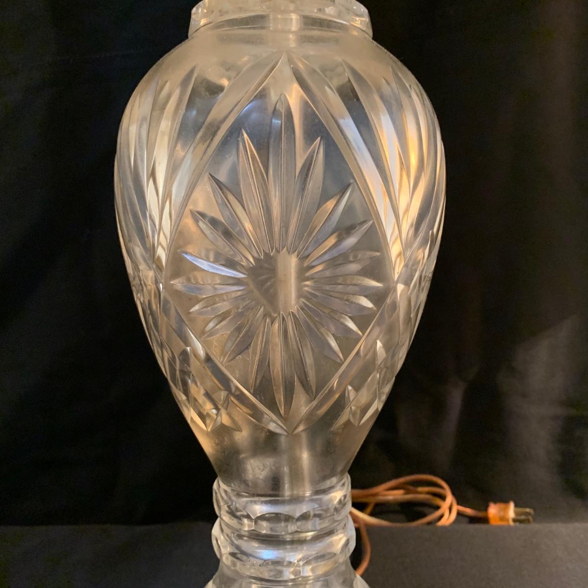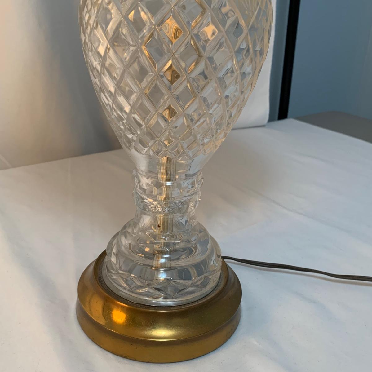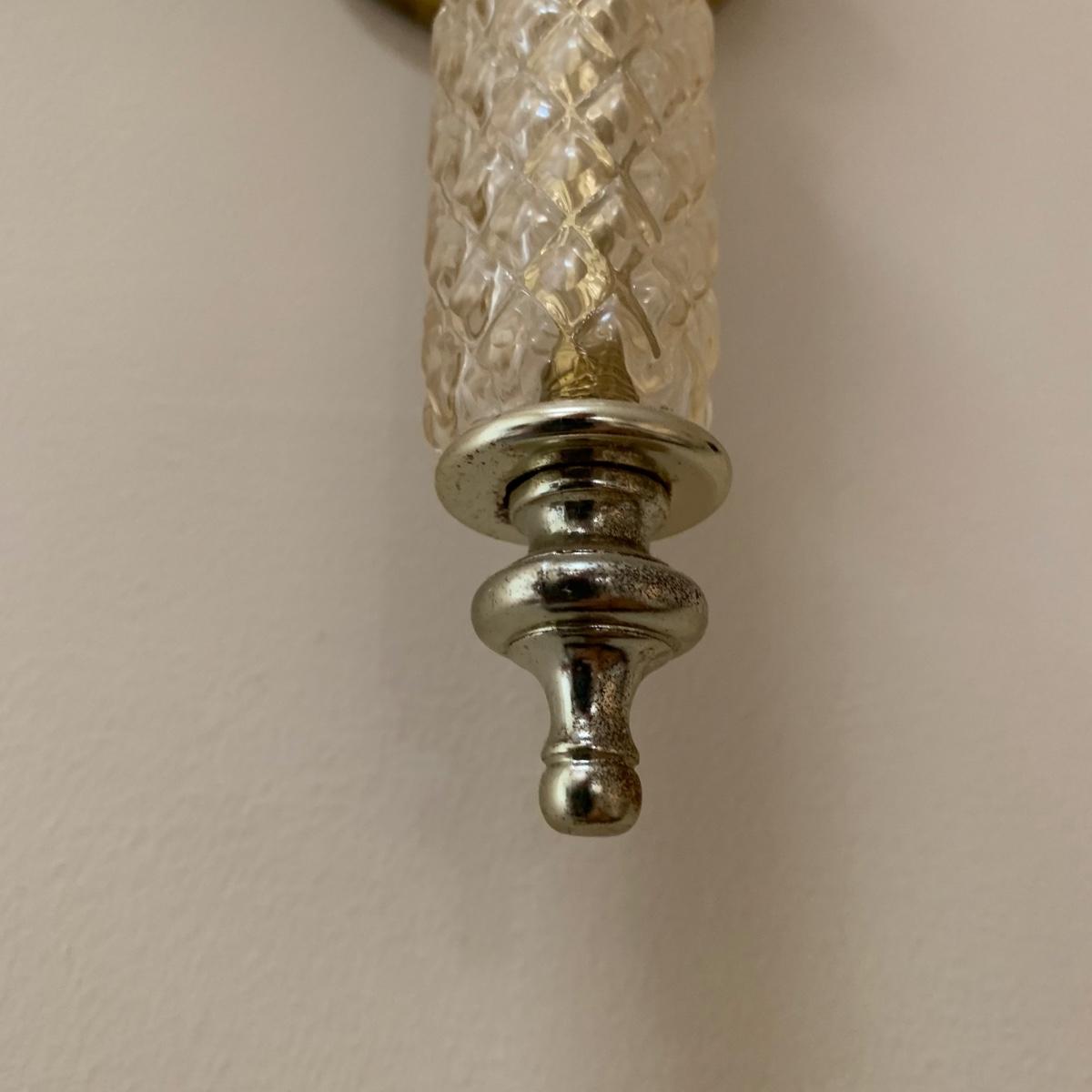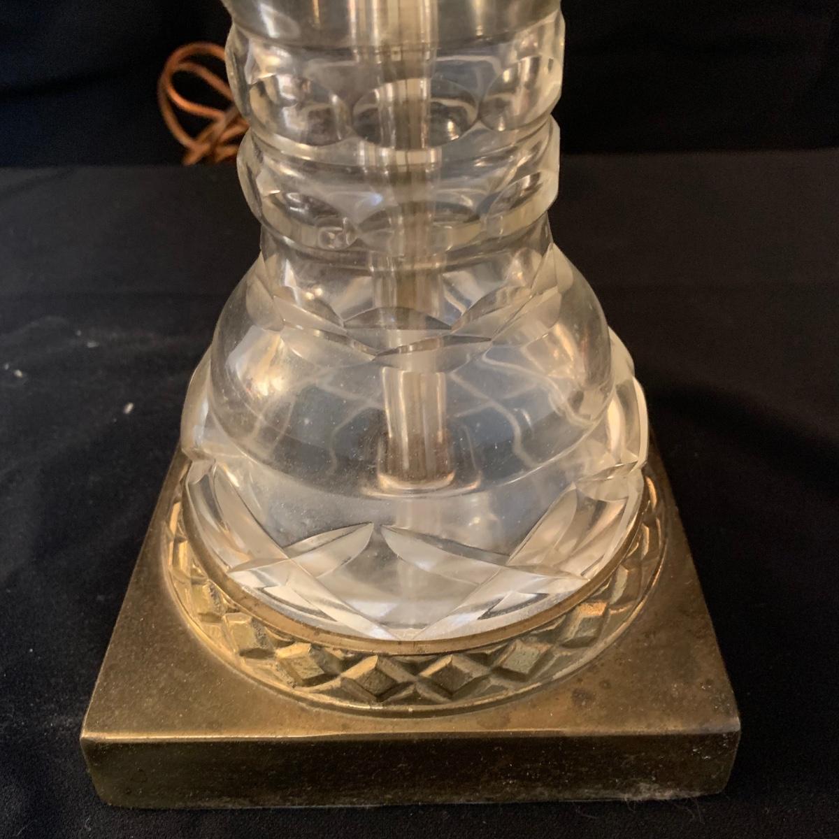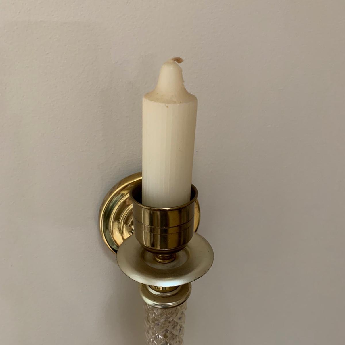 Lot includes three glass lamps and a pair of glass candle sconces. Two of the lamps are a matching set with brass-like bases and matching shades. One shade is in good condition, while the other needs to be fastened back onto the frame. With a little glue, it could be like new! See photos for details. Lamps themselves are in good condition. Lamp base measures 5.5”L x 5.5”W and the lamp is 32.5”H including the shade. A third similar lamp is also included. It also has a metal base and cream colored shade. It has a lovely crystal finial. Lamp is just a little shorter than the other two. All three turned on when tested. The sconces have metal bases with glass hurricanes and lower glass decor. Note the split in the metal on one sconce. It is not visible from the front.