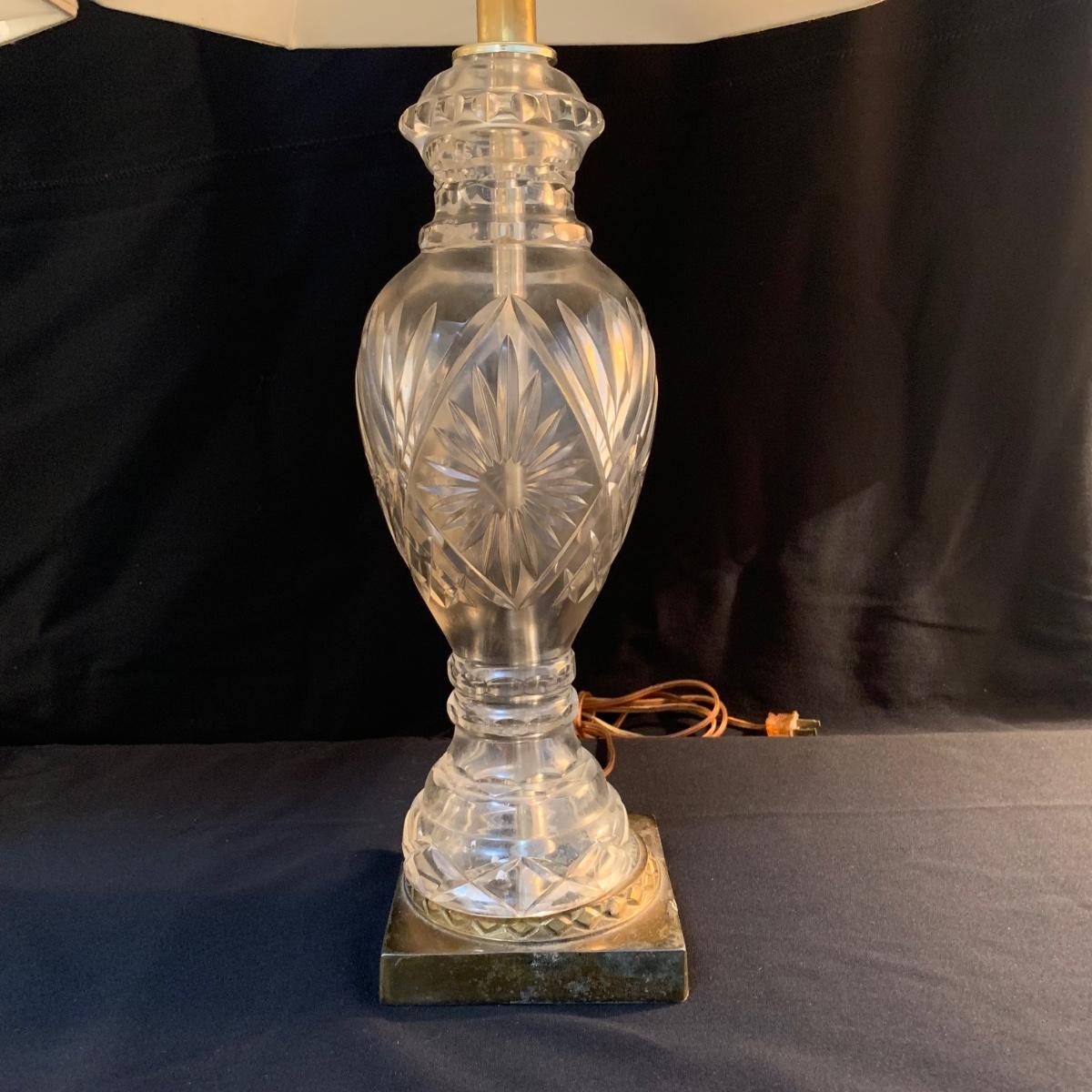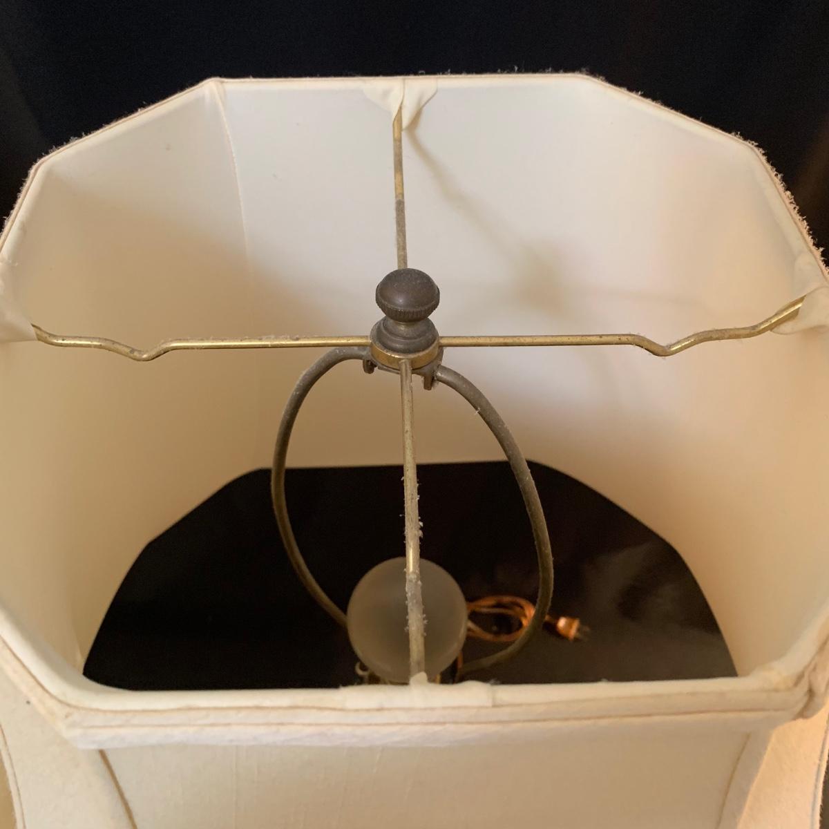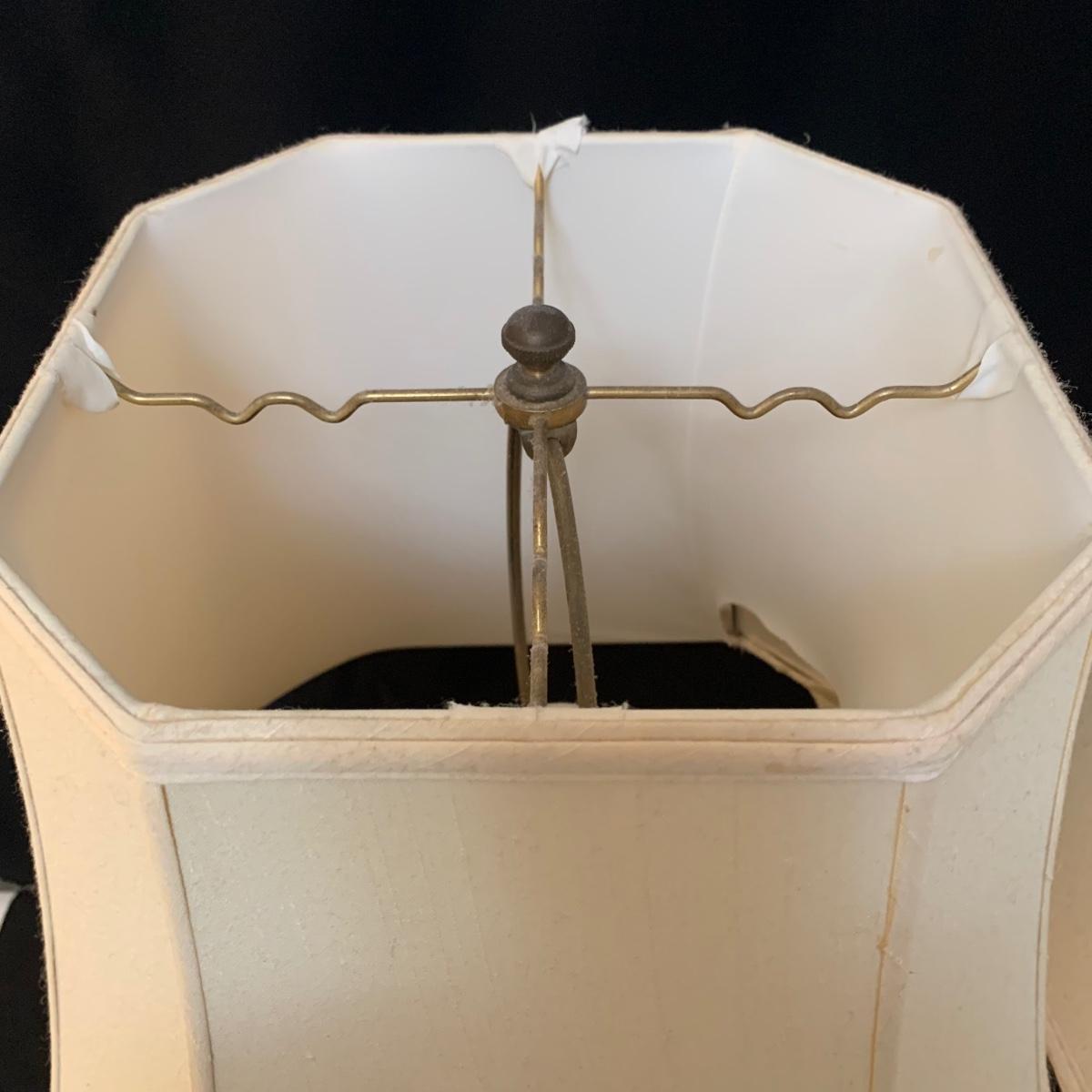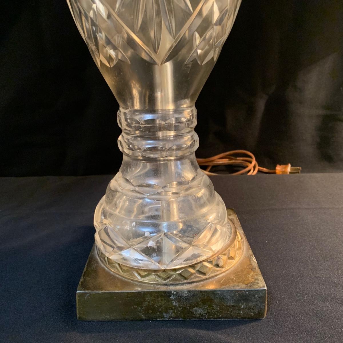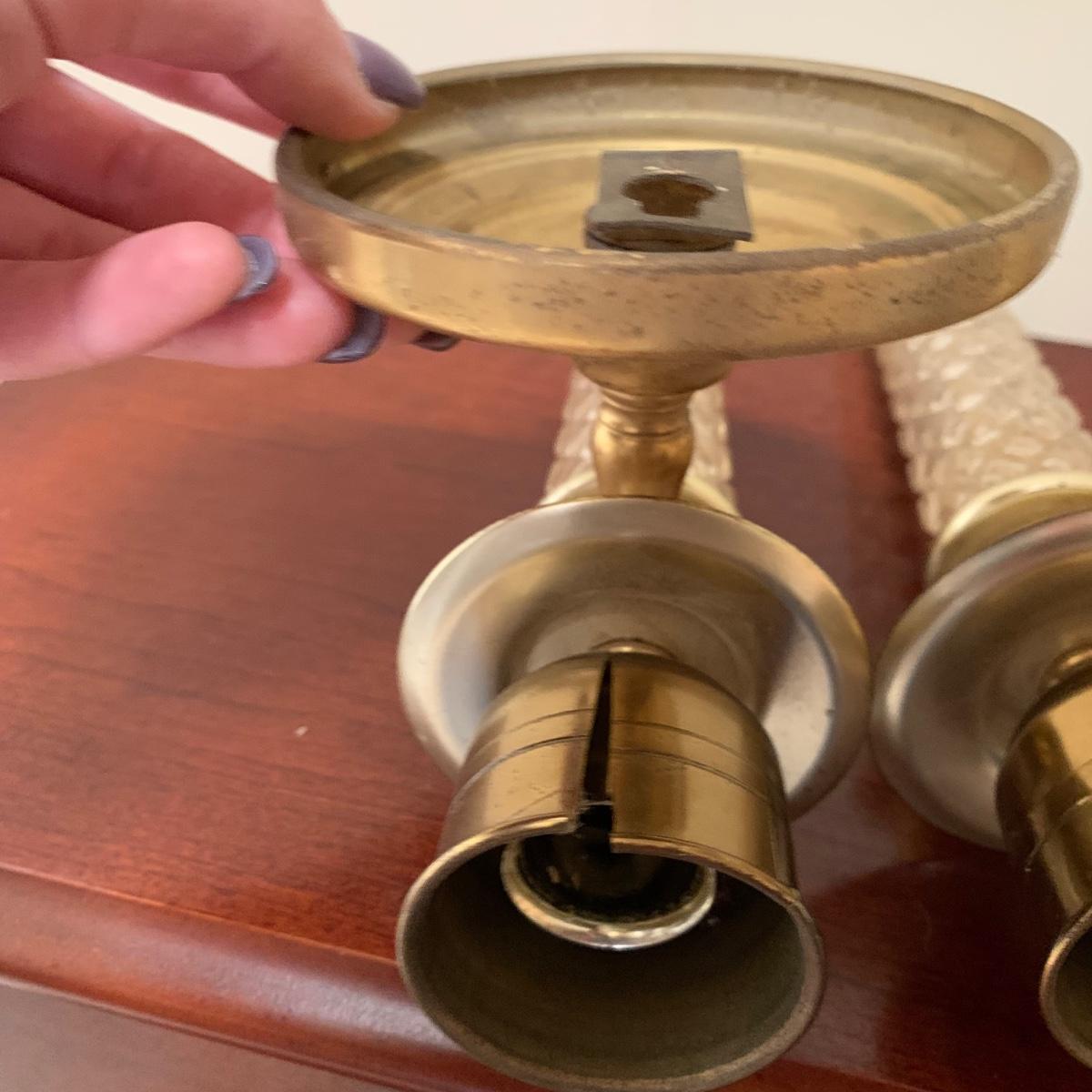 Lot includes three glass lamps and a pair of glass candle sconces. Two of the lamps are a matching set with brass-like bases and matching shades. One shade is in good condition, while the other needs to be fastened back onto the frame. With a little glue, it could be like new! See photos for details. Lamps themselves are in good condition. Lamp base measures 5.5”L x 5.5”W and the lamp is 32.5”H including the shade. A third similar lamp is also included. It also has a metal base and cream colored shade. It has a lovely crystal finial. Lamp is just a little shorter than the other two. All three turned on when tested. The sconces have metal bases with glass hurricanes and lower glass decor. Note the split in the metal on one sconce. It is not visible from the front.