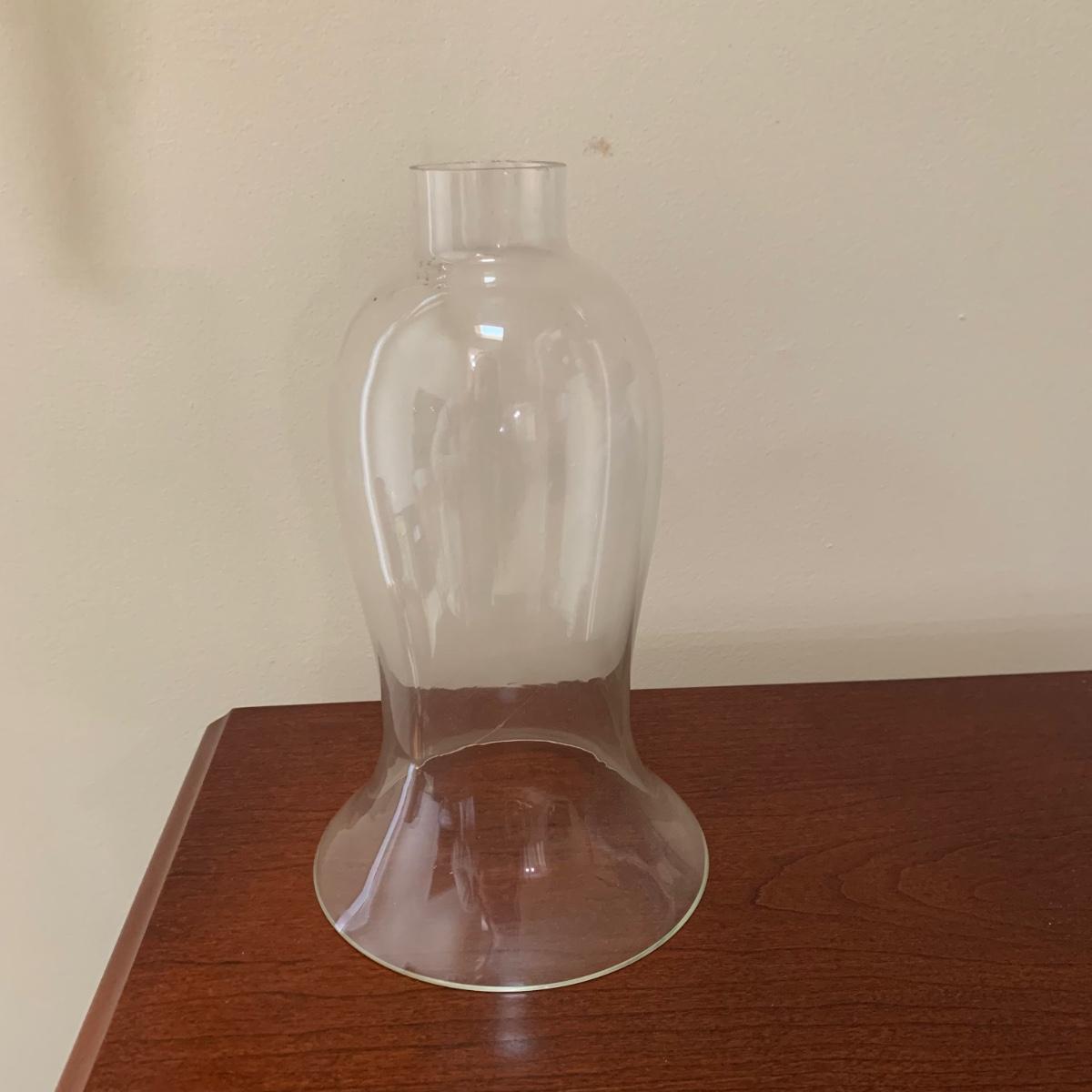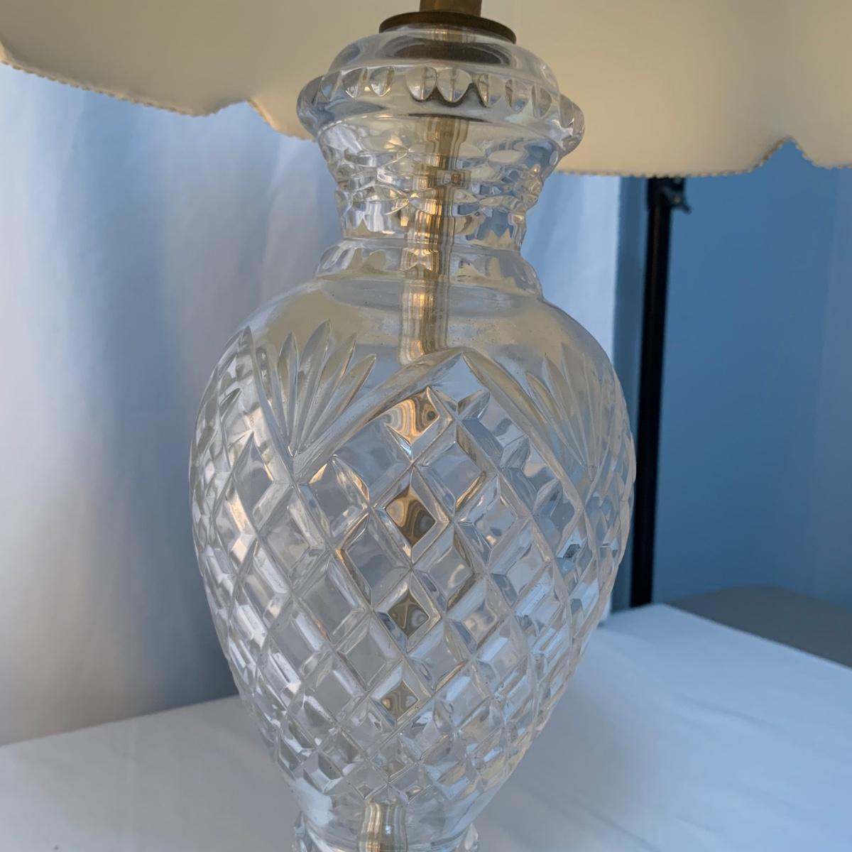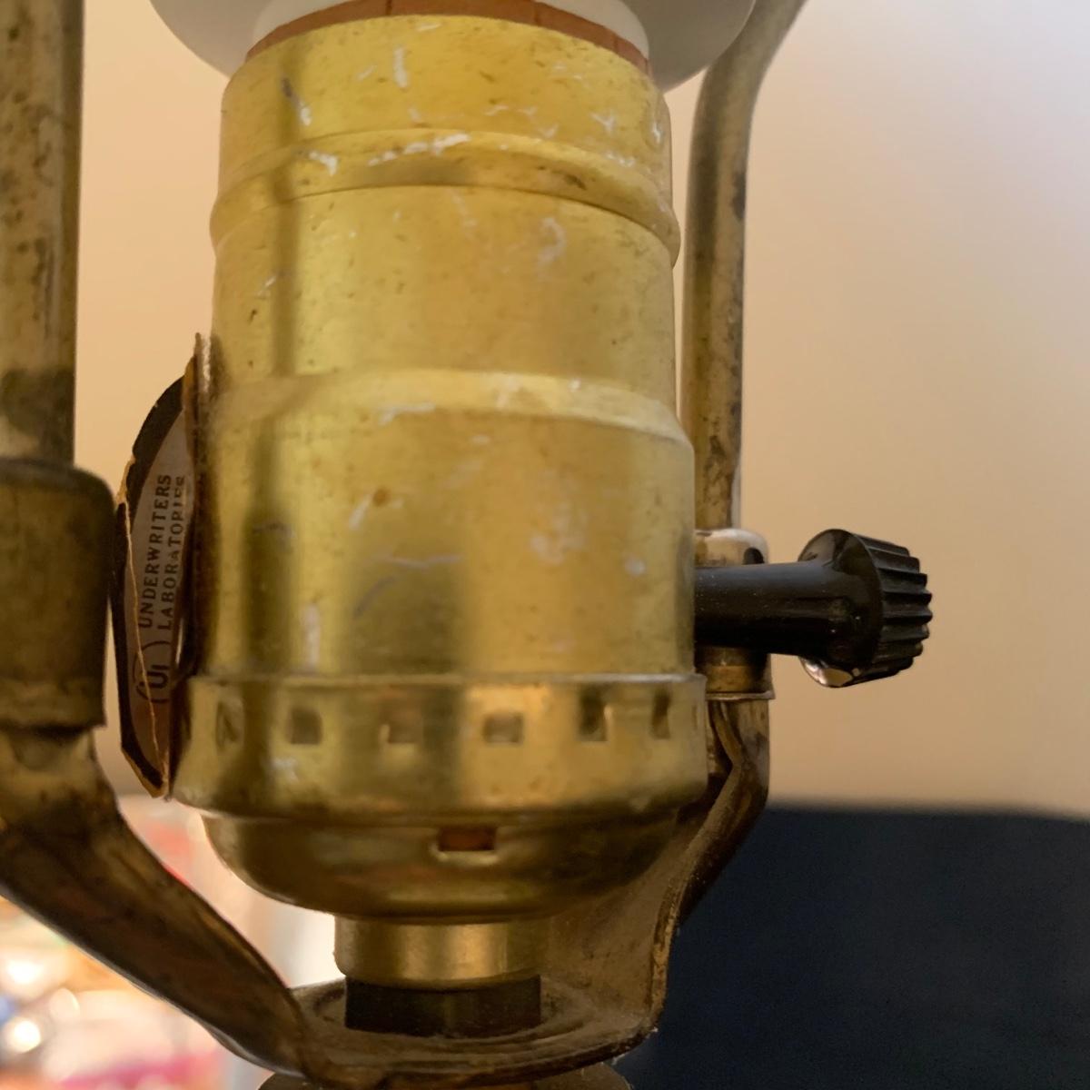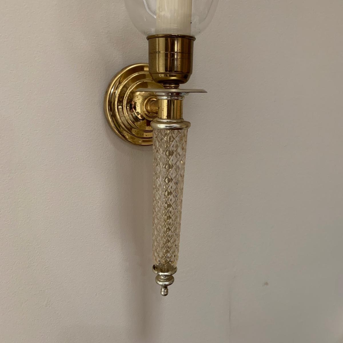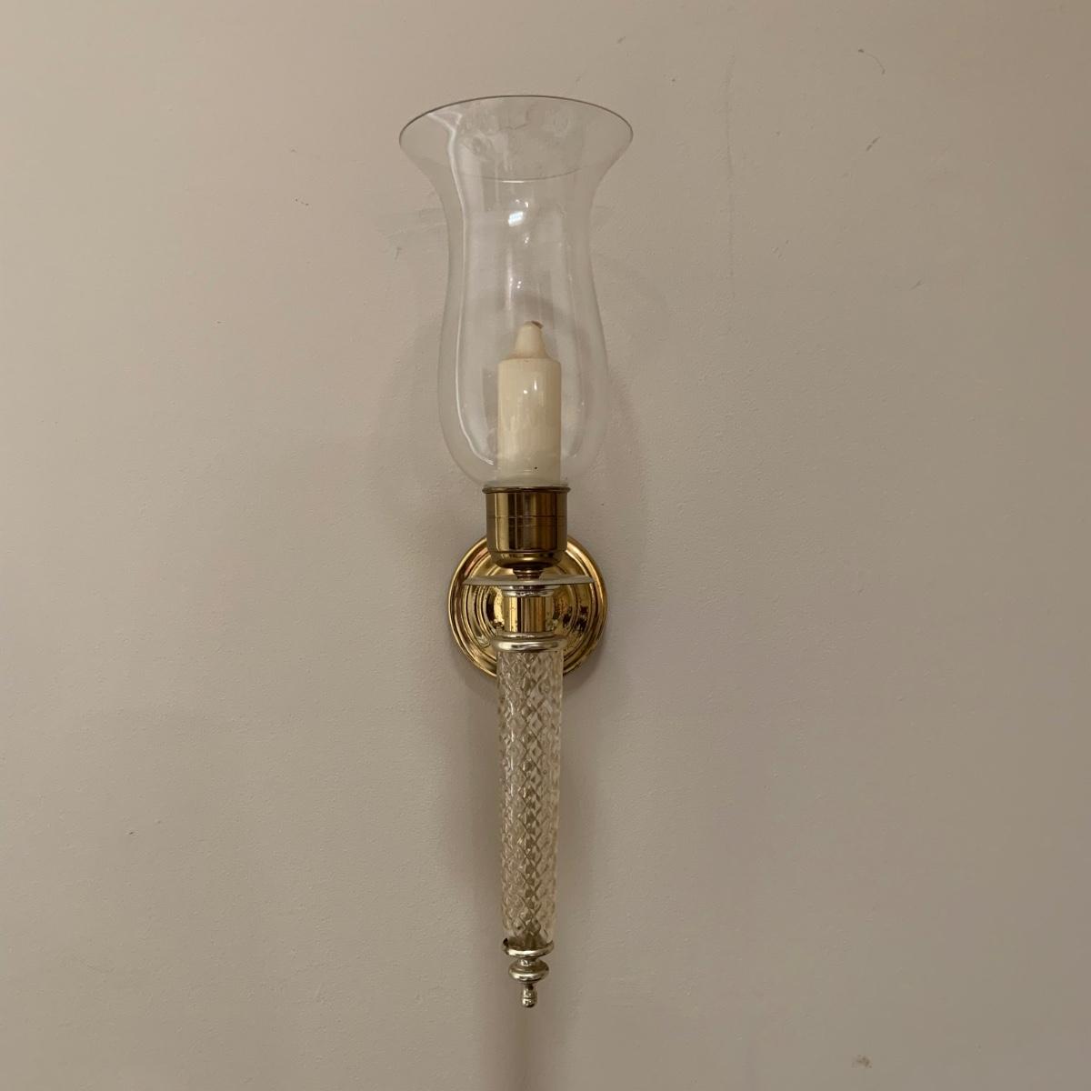 Lot includes three glass lamps and a pair of glass candle sconces. Two of the lamps are a matching set with brass-like bases and matching shades. One shade is in good condition, while the other needs to be fastened back onto the frame. With a little glue, it could be like new! See photos for details. Lamps themselves are in good condition. Lamp base measures 5.5”L x 5.5”W and the lamp is 32.5”H including the shade. A third similar lamp is also included. It also has a metal base and cream colored shade. It has a lovely crystal finial. Lamp is just a little shorter than the other two. All three turned on when tested. The sconces have metal bases with glass hurricanes and lower glass decor. Note the split in the metal on one sconce. It is not visible from the front.
