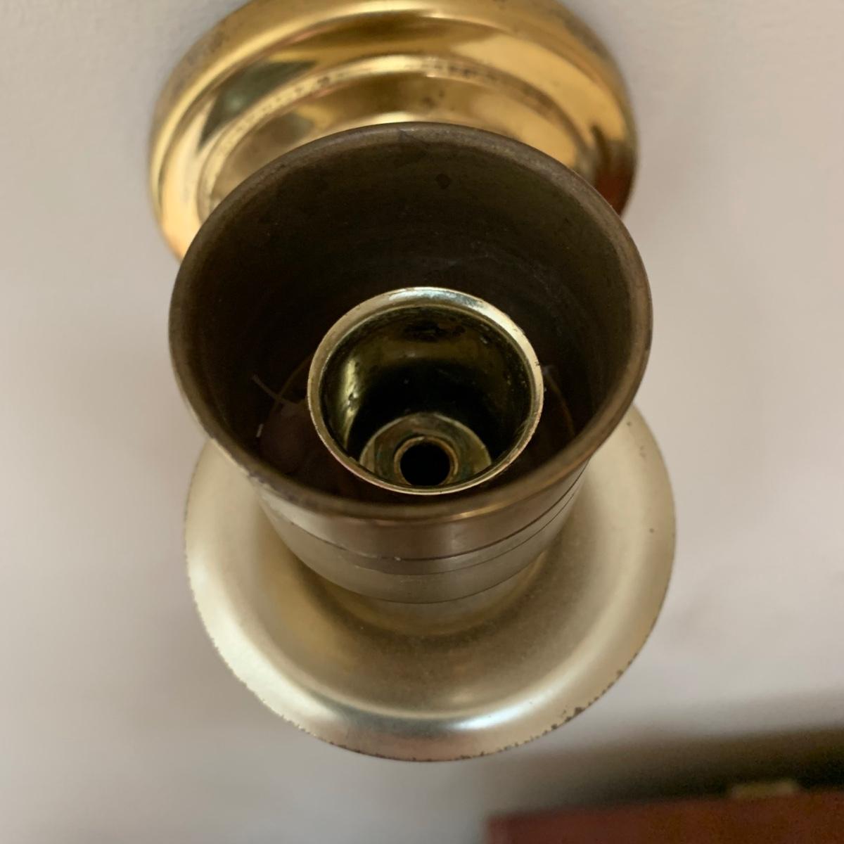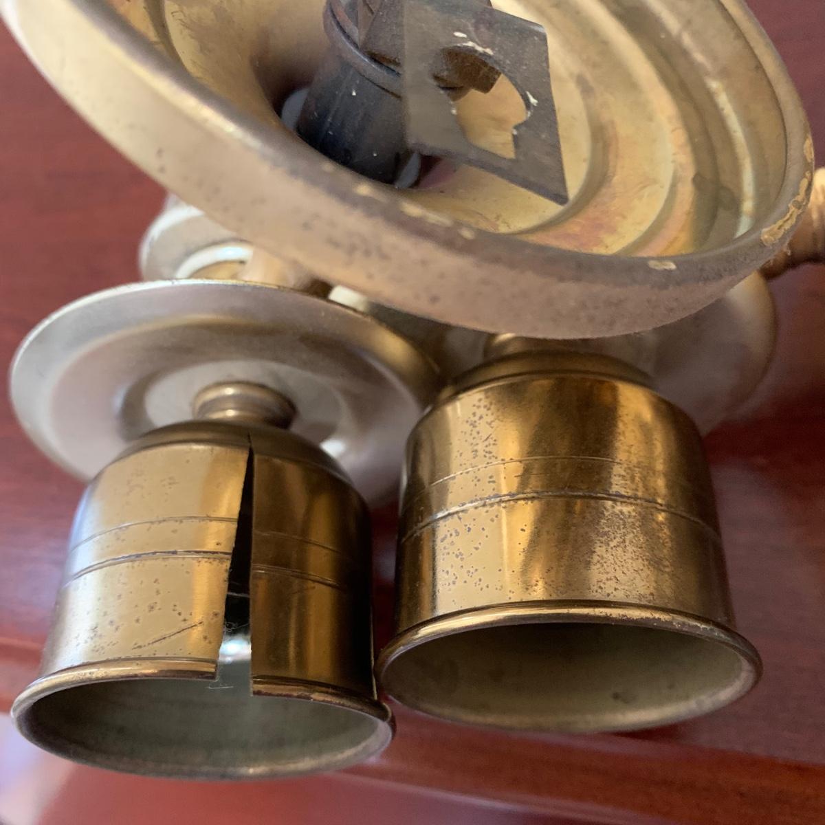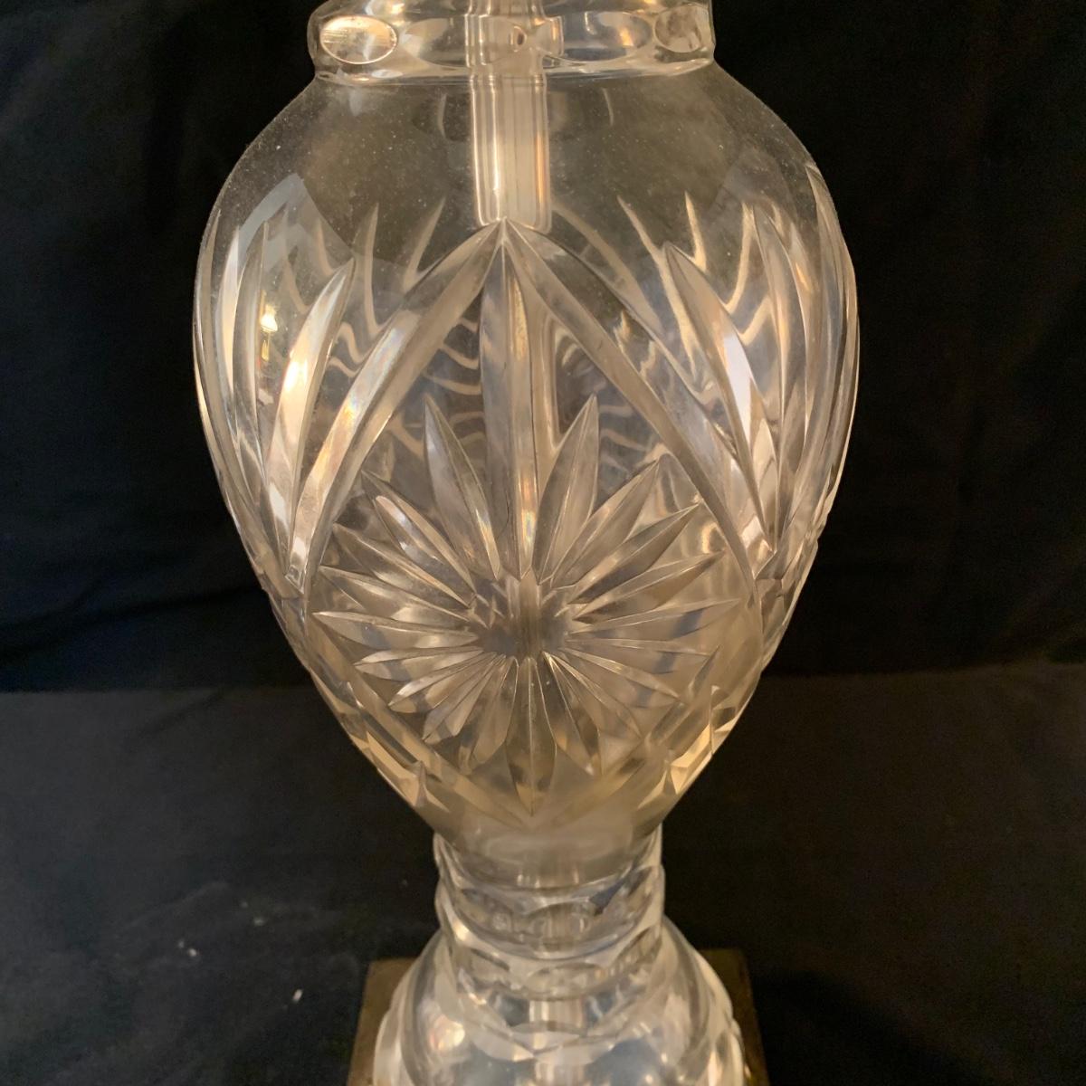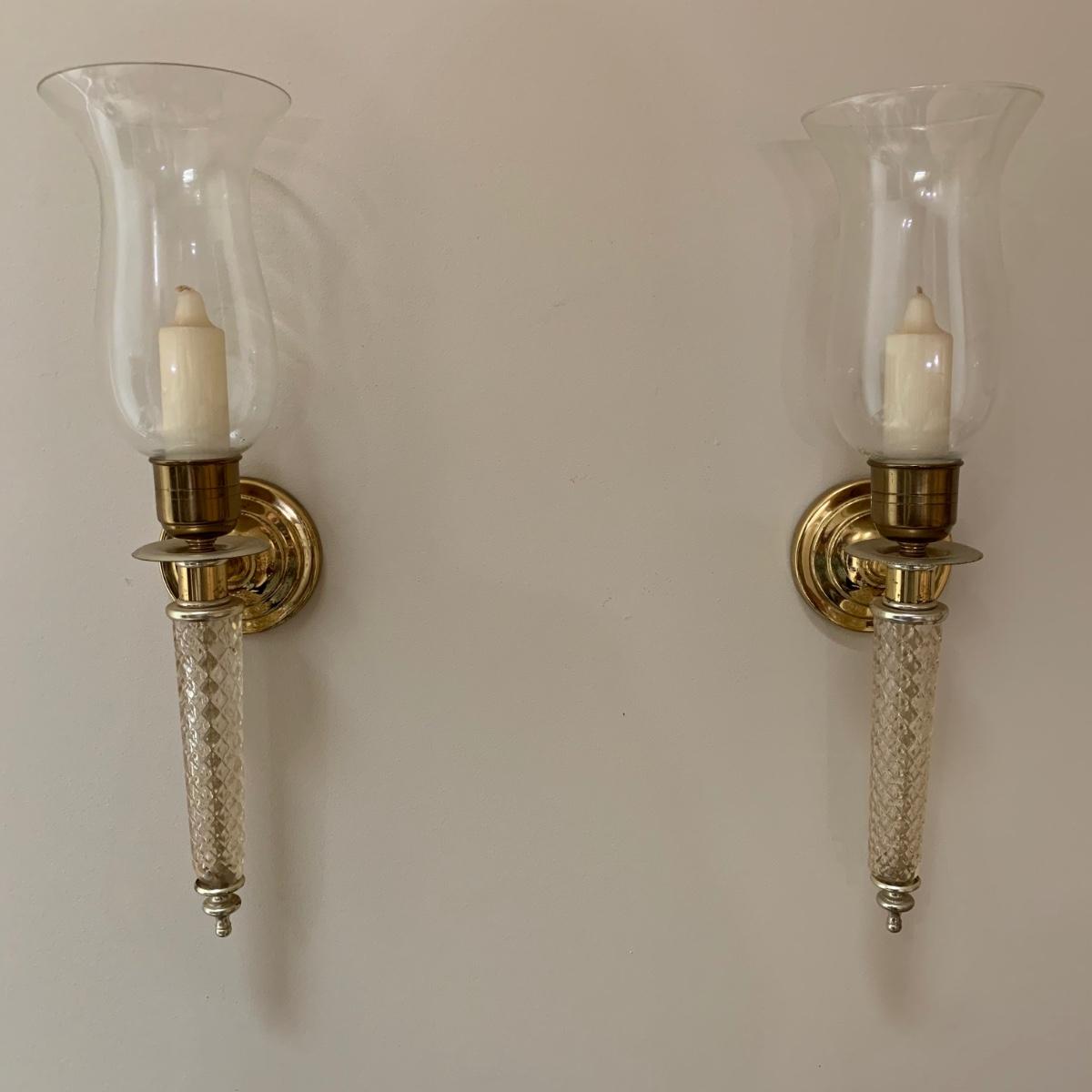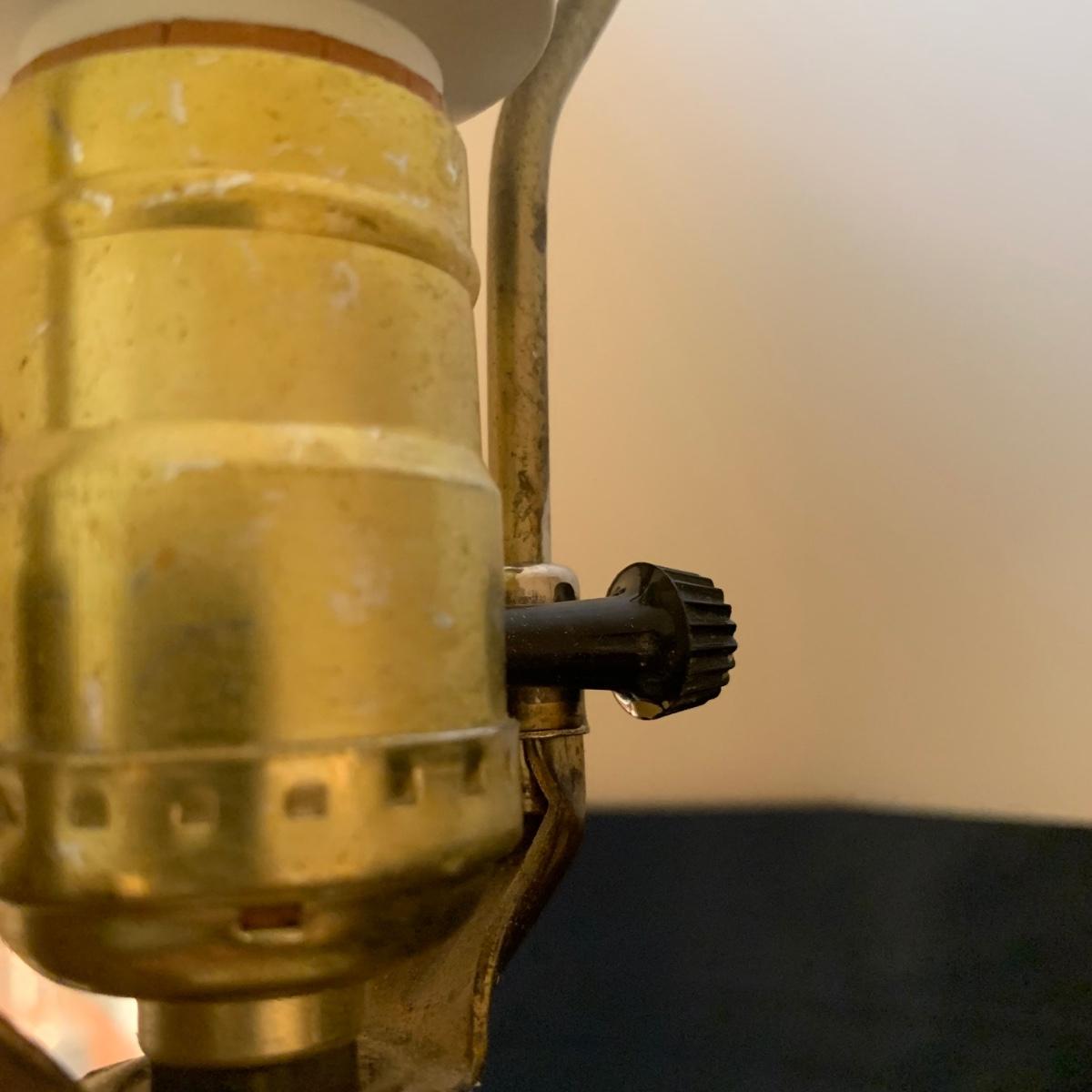 Lot includes three glass lamps and a pair of glass candle sconces. Two of the lamps are a matching set with brass-like bases and matching shades. One shade is in good condition, while the other needs to be fastened back onto the frame. With a little glue, it could be like new! See photos for details. Lamps themselves are in good condition. Lamp base measures 5.5”L x 5.5”W and the lamp is 32.5”H including the shade. A third similar lamp is also included. It also has a metal base and cream colored shade. It has a lovely crystal finial. Lamp is just a little shorter than the other two. All three turned on when tested. The sconces have metal bases with glass hurricanes and lower glass decor. Note the split in the metal on one sconce. It is not visible from the front.