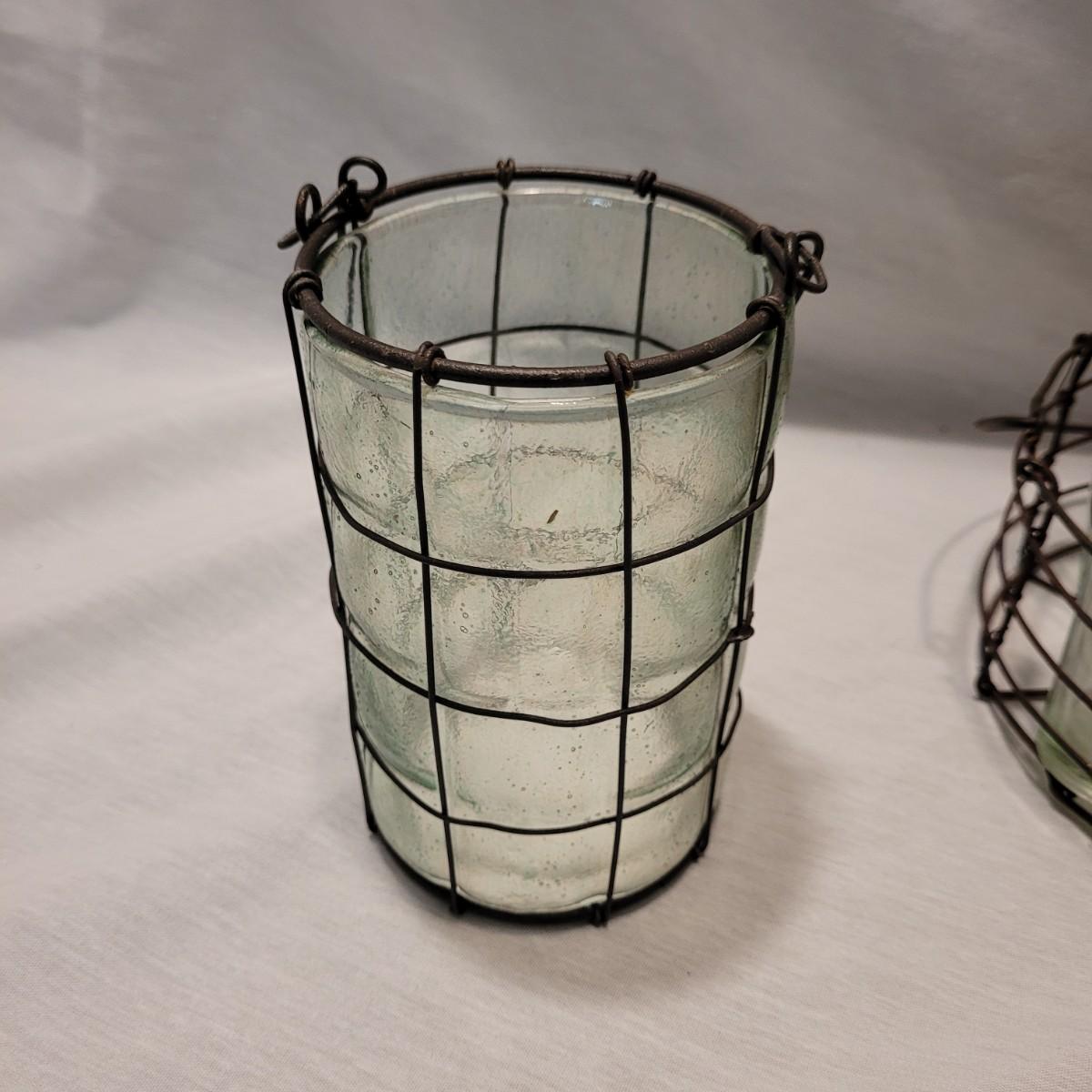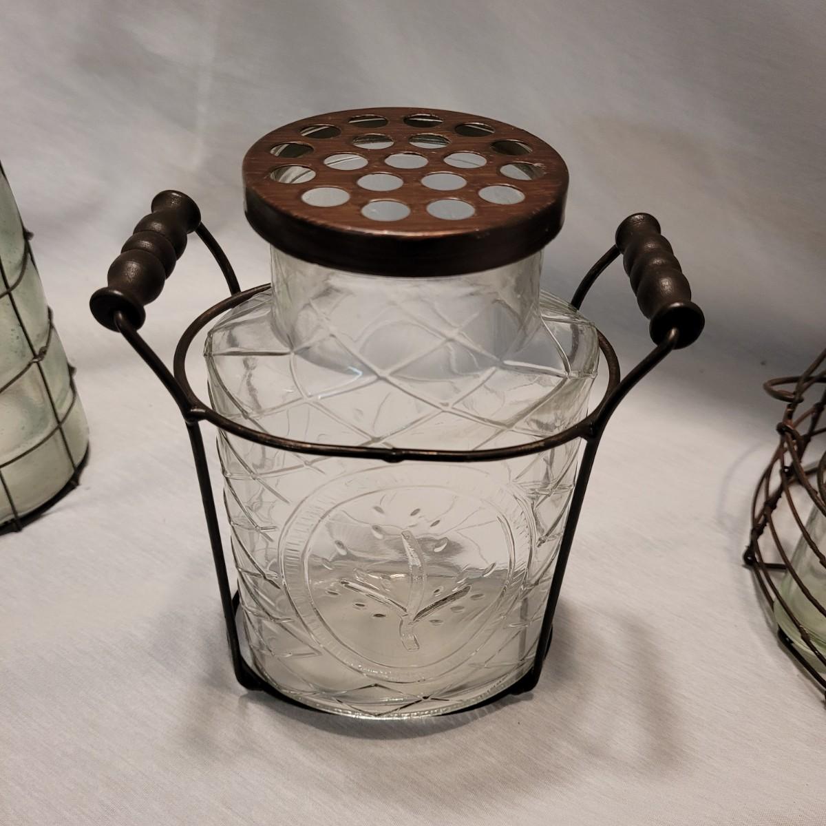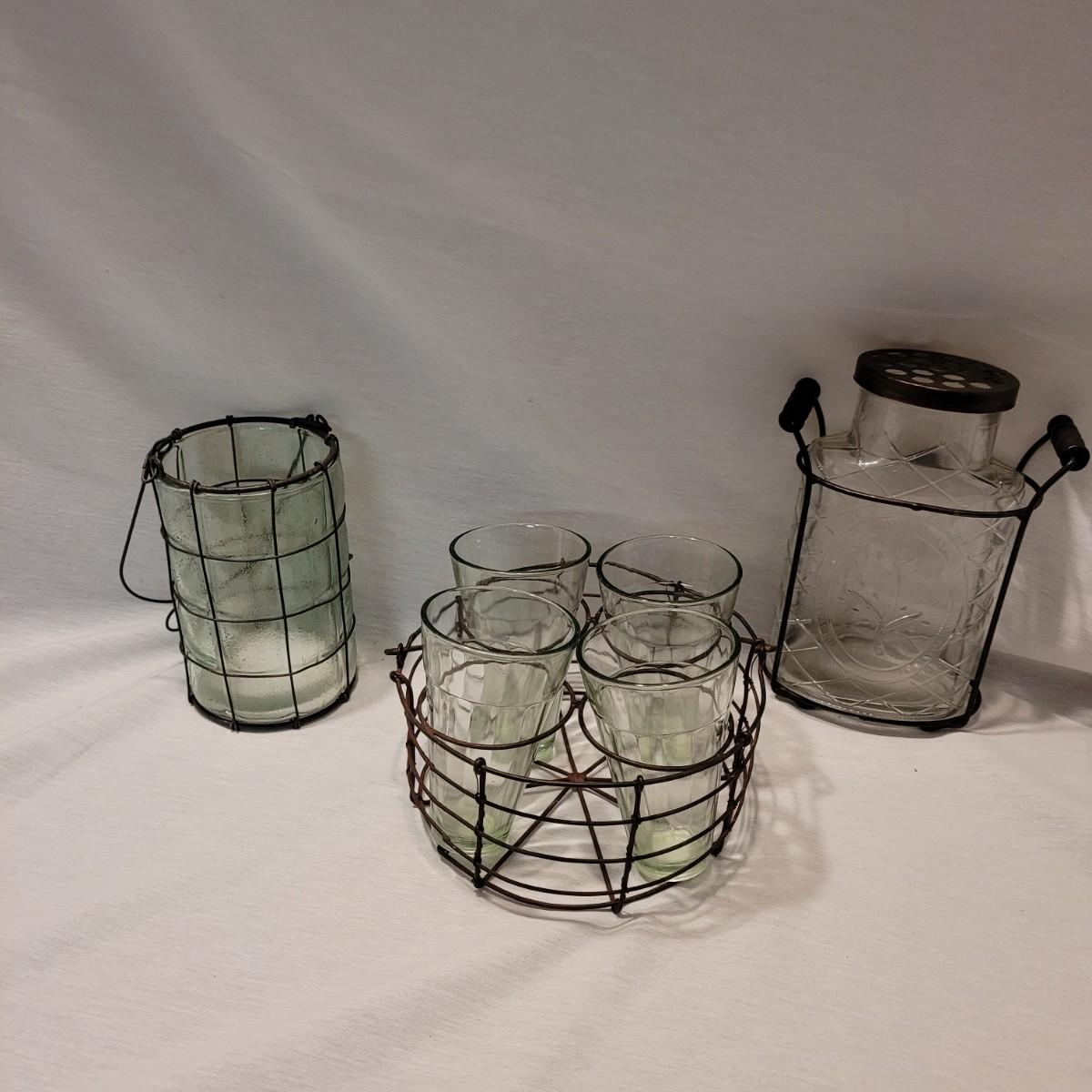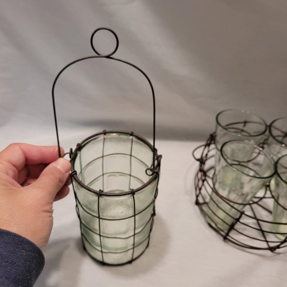 A cute collection of glass vase, lantern and vintage drink caddy in metal holders. Tall vase measures approximately 7.5”H. Shipping available.