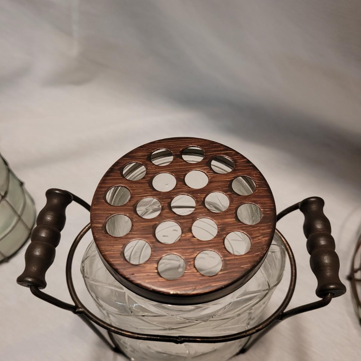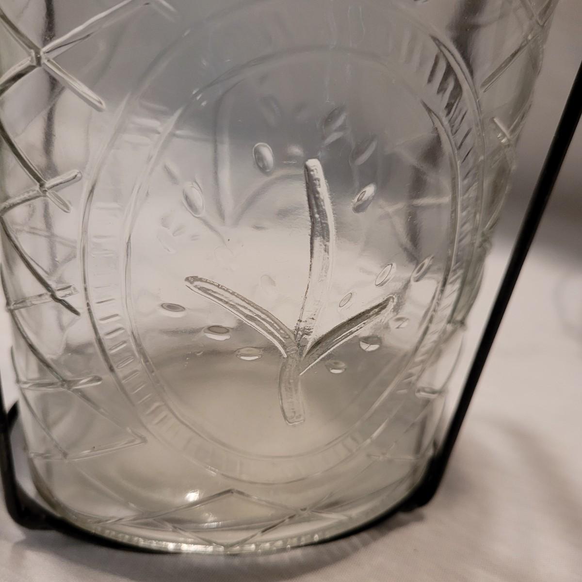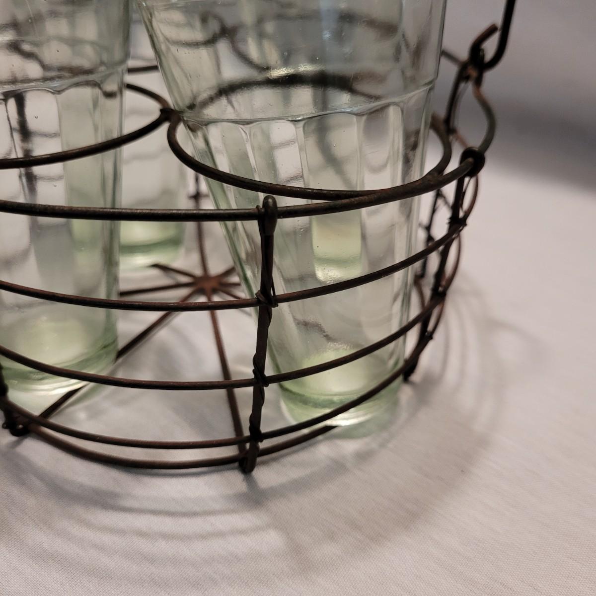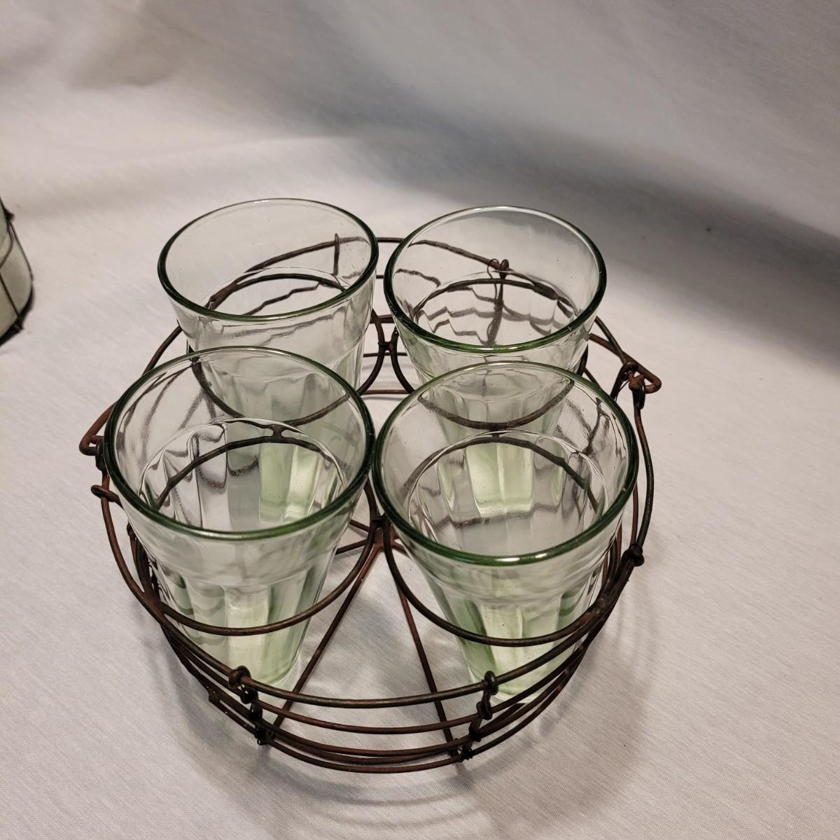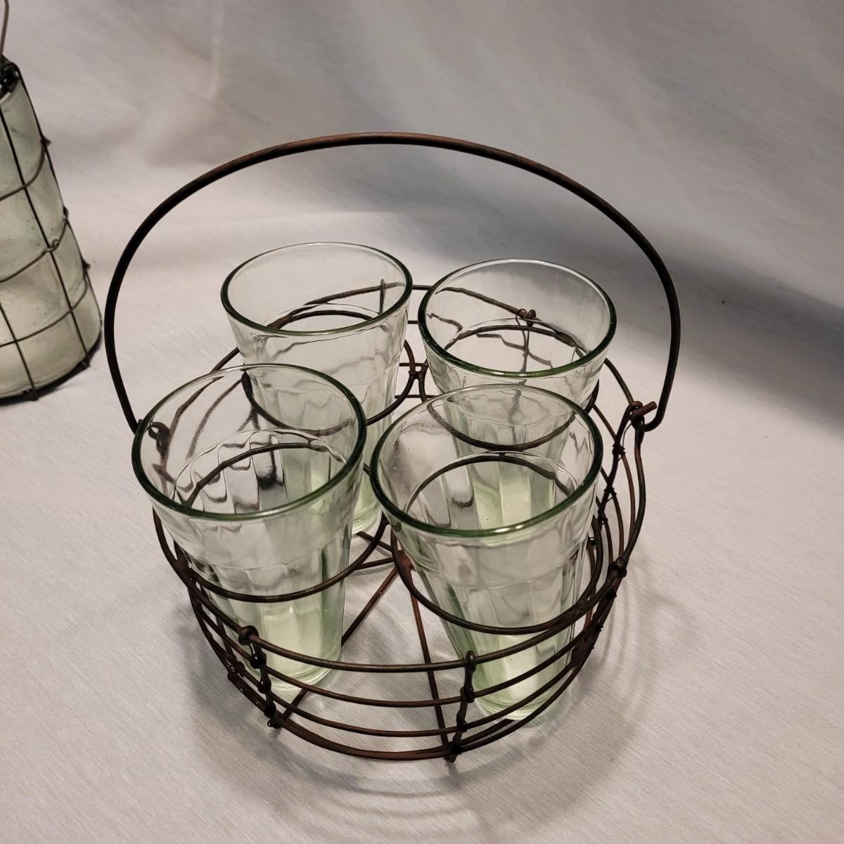 A cute collection of glass vase, lantern and vintage drink caddy in metal holders. Tall vase measures approximately 7.5”H. Shipping available.