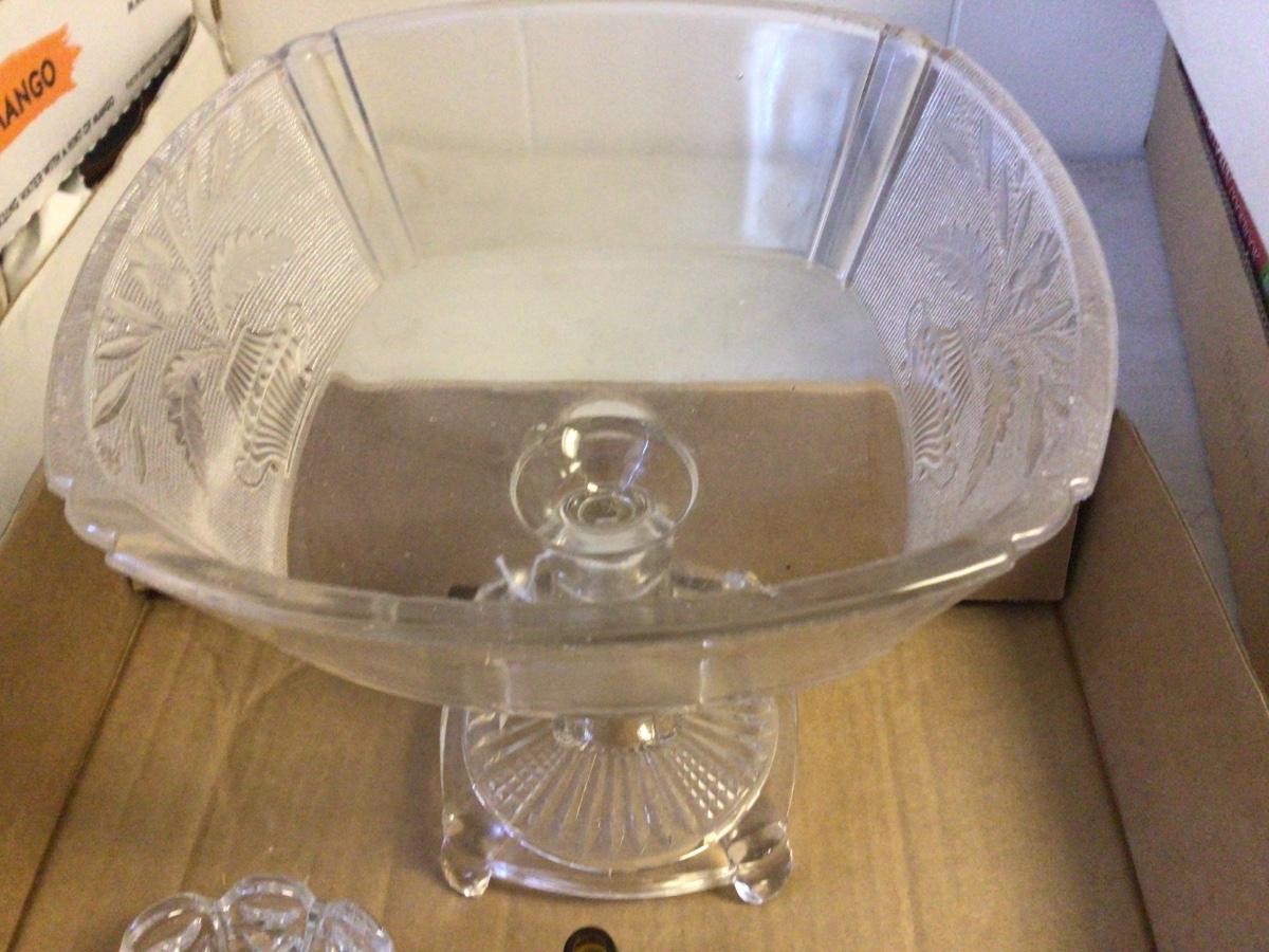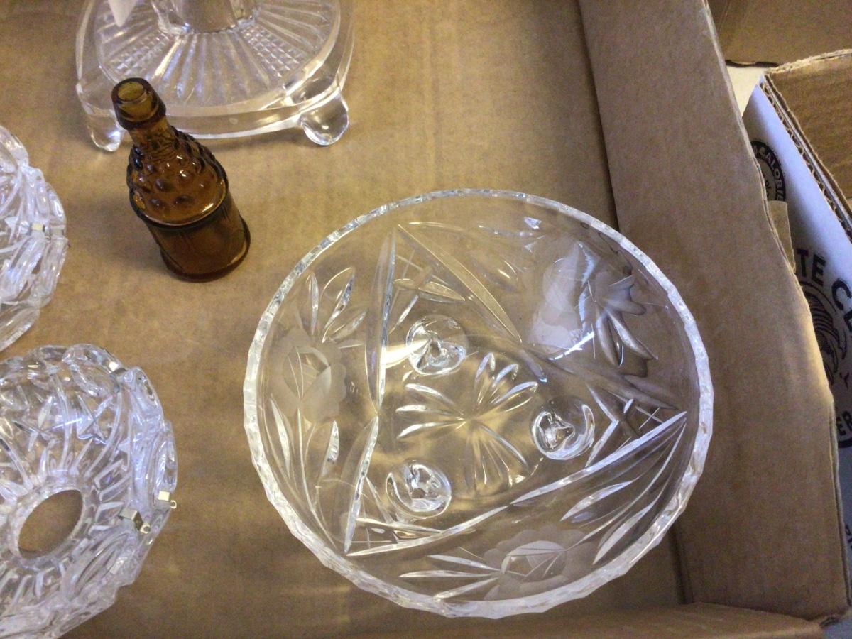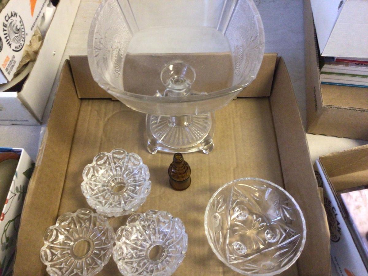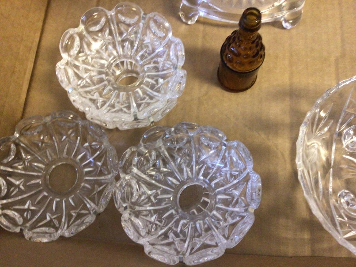 Mostly clear glass large compote bowl, chandelier cups, small bowl, Wheaton bottle brown.