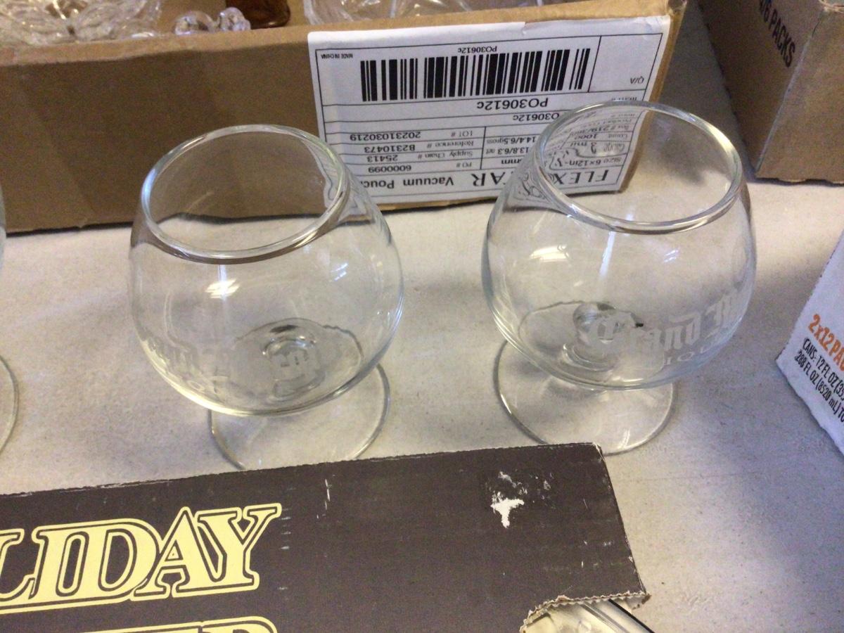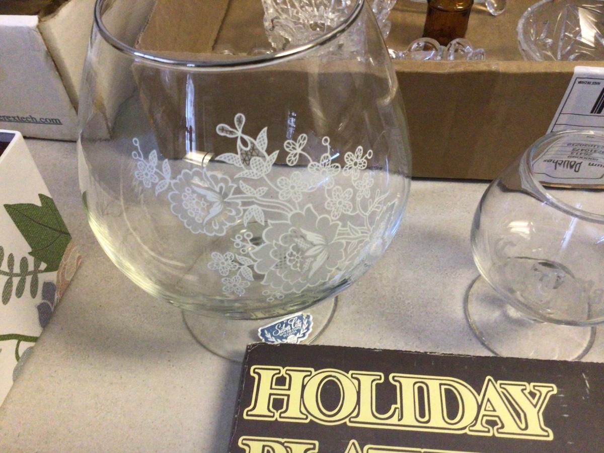 Large glass brandy snifter, two small matching brandy snifters, cake plate.